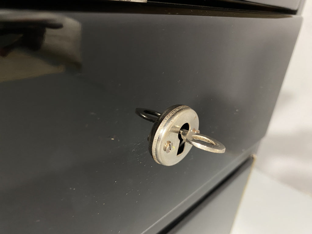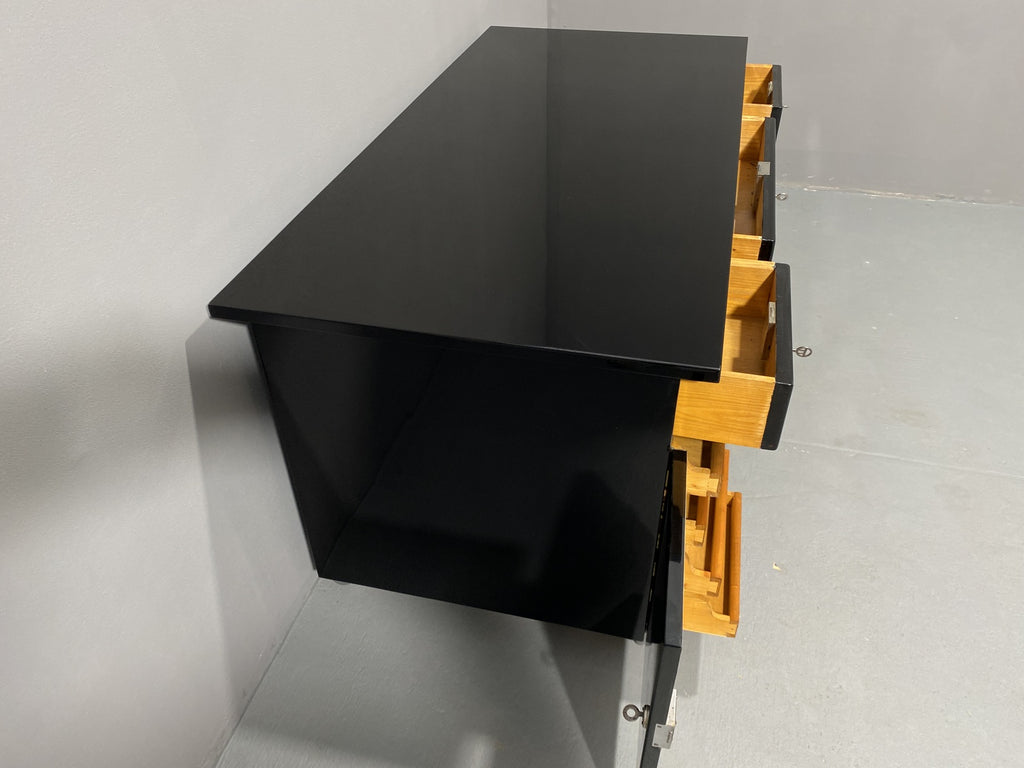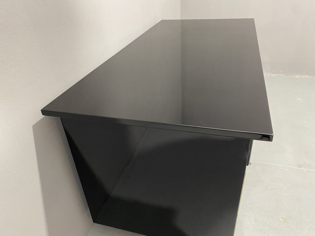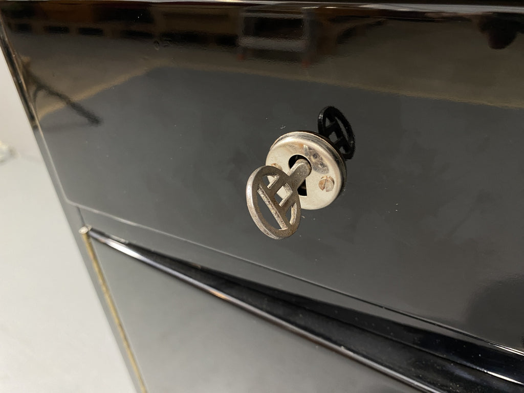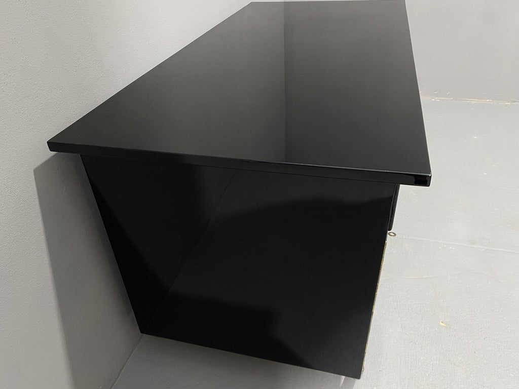 This large Bauhaus writing desk from 1930s Czechoslovakia is a striking piece of functionalist art, also know as the Bauhaus period. It boasts the original high-gloss piano lacquer.