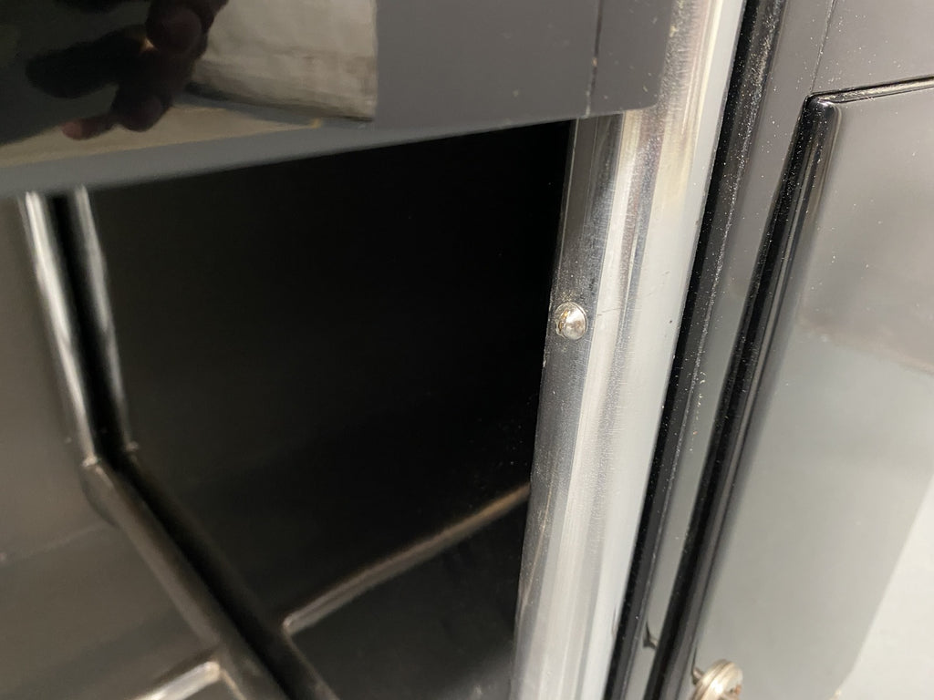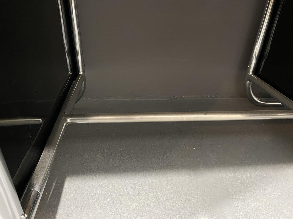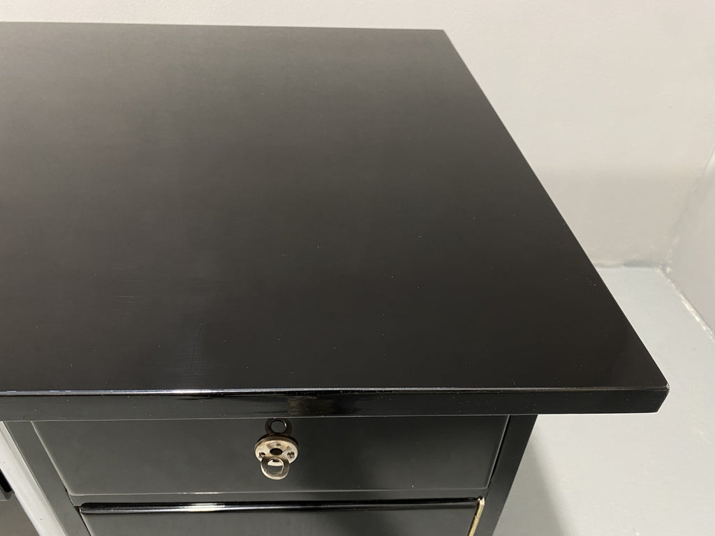 The polished steel tube structure adds an industrial look to the design. Each side of the desk features three drawer, offering ample storage and usability from both sides. The desk features a thoughtful restoration.