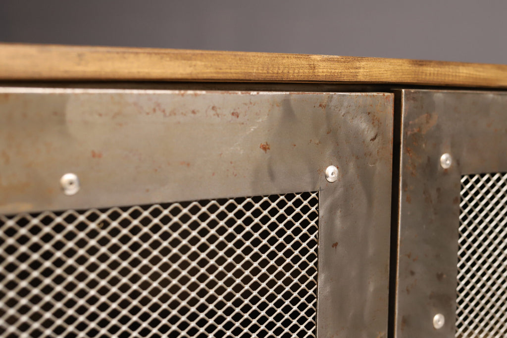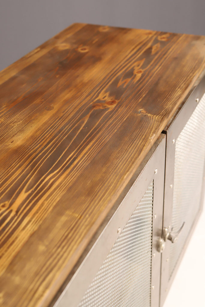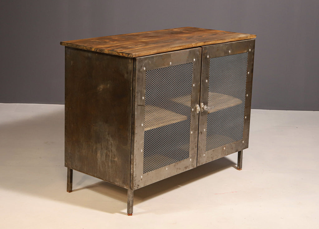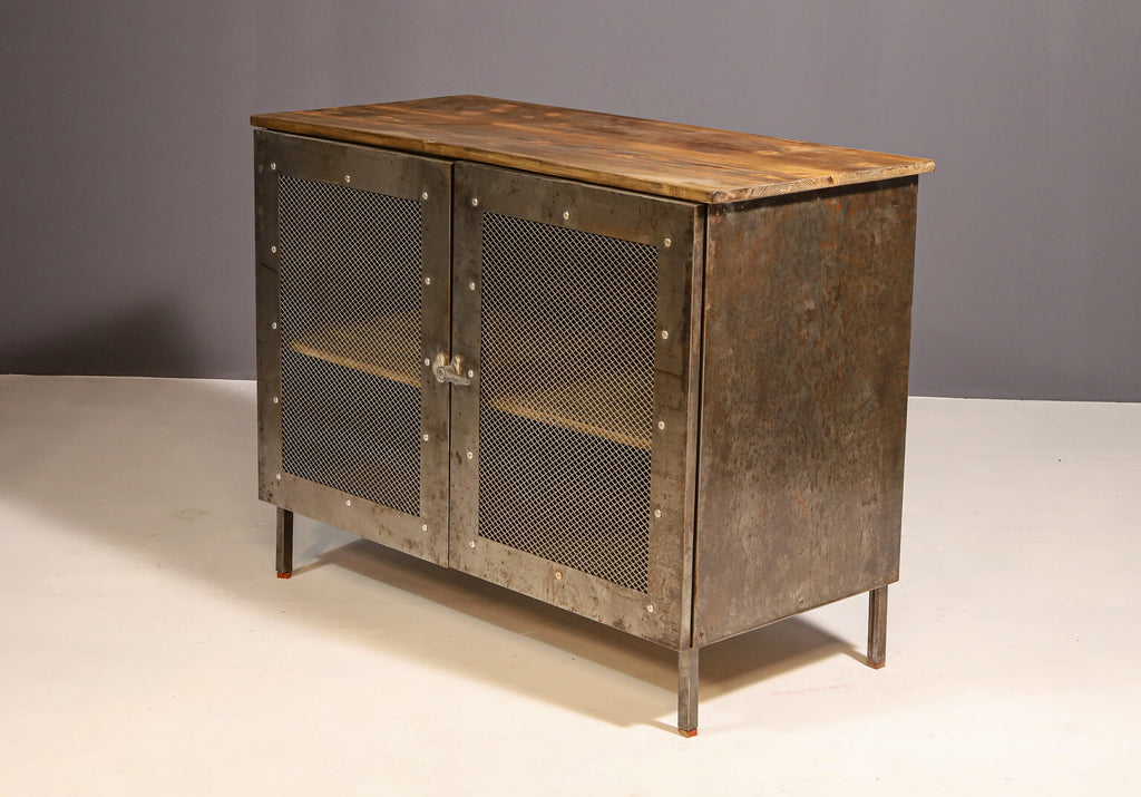 This cabinet was originally used for craftsmen. It´s made of iron with wooden plate on the table top.
