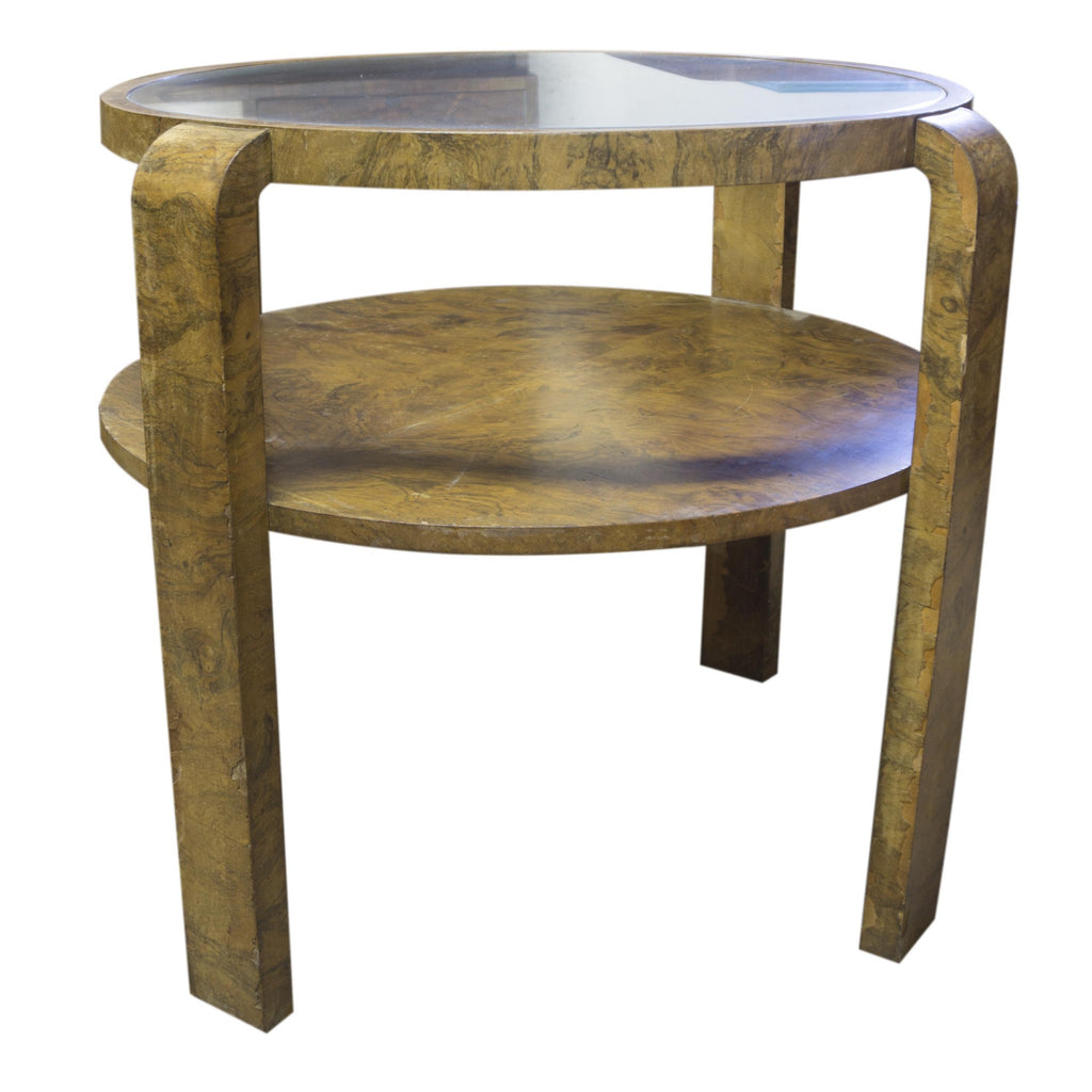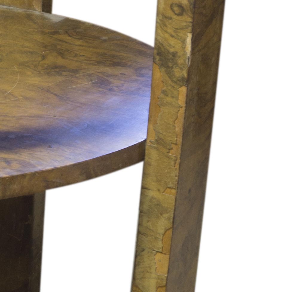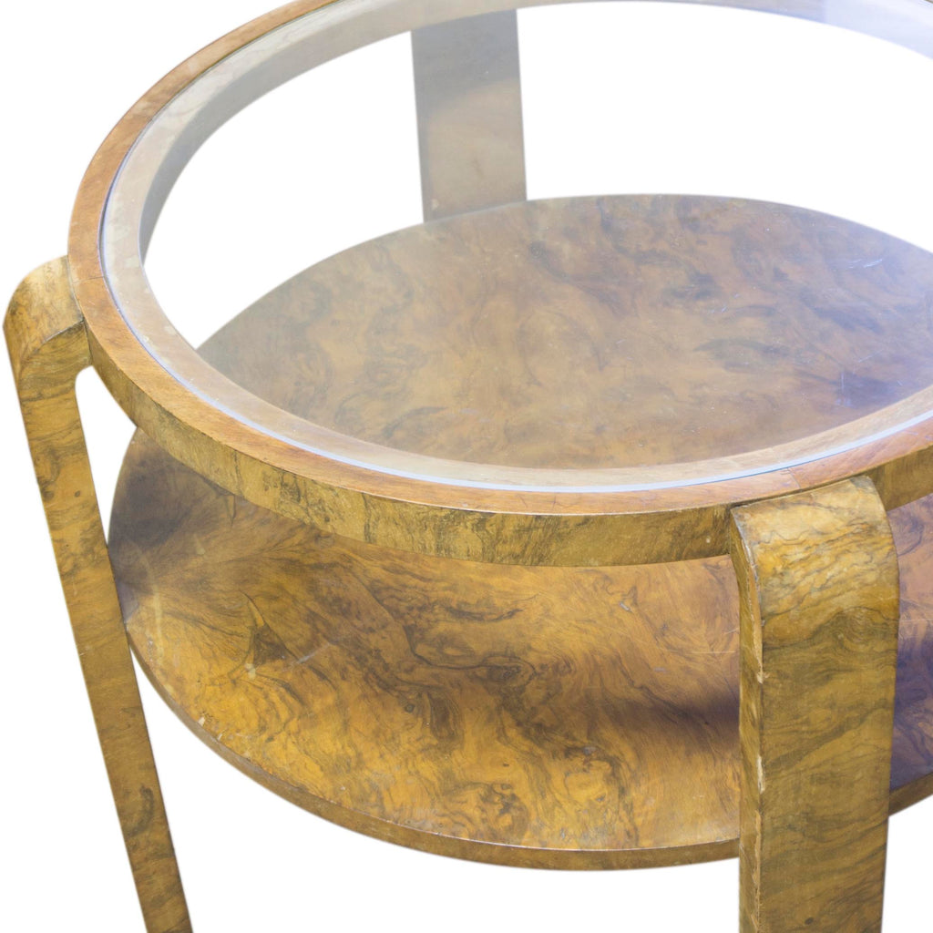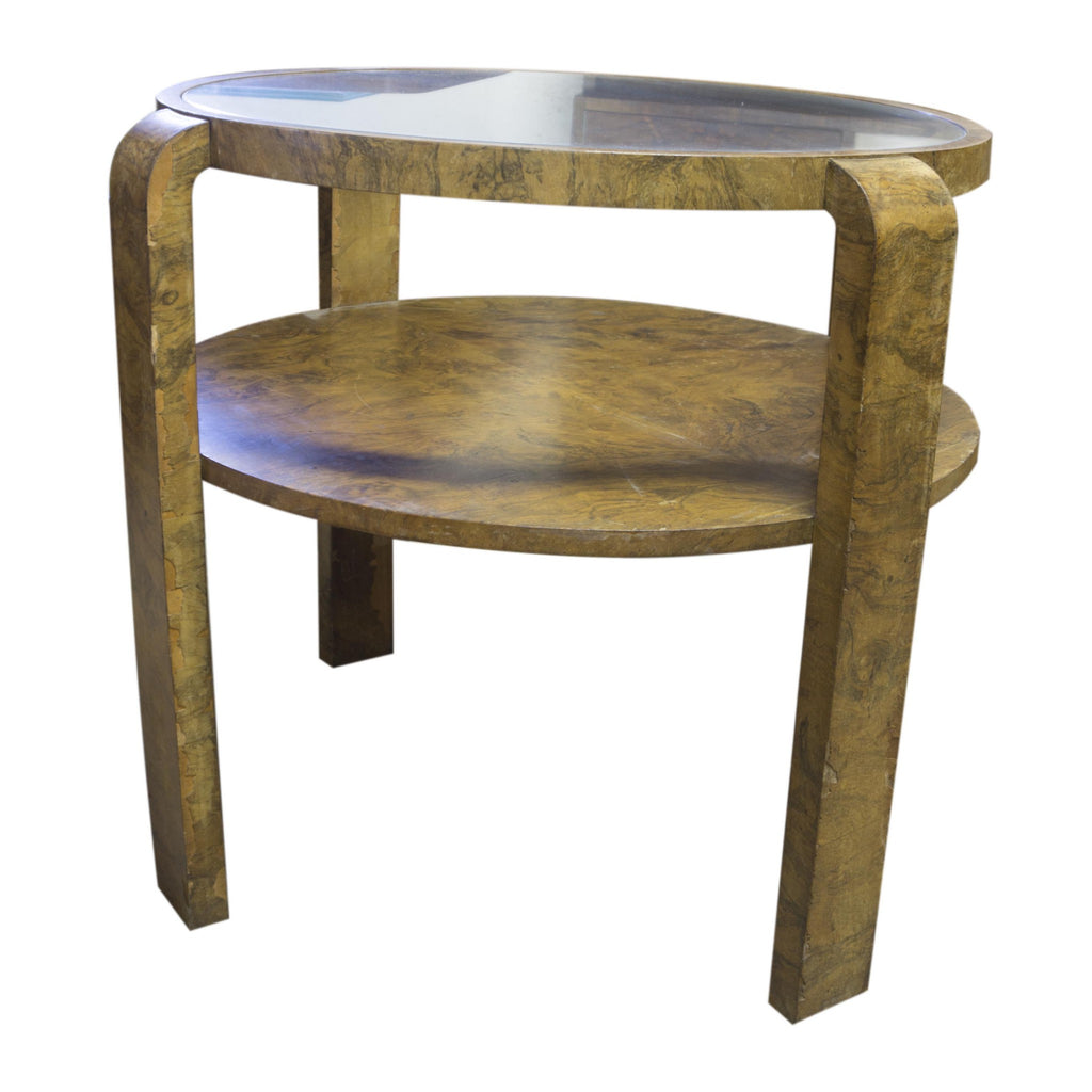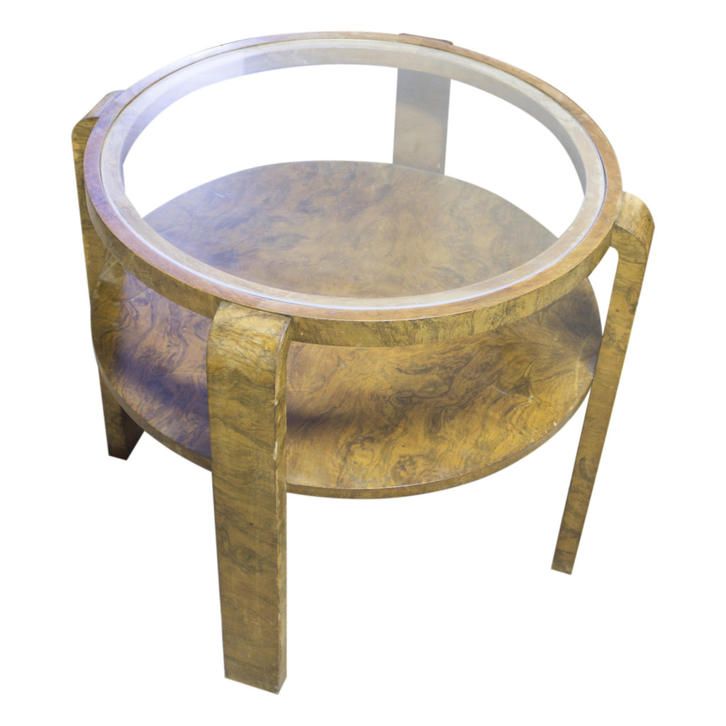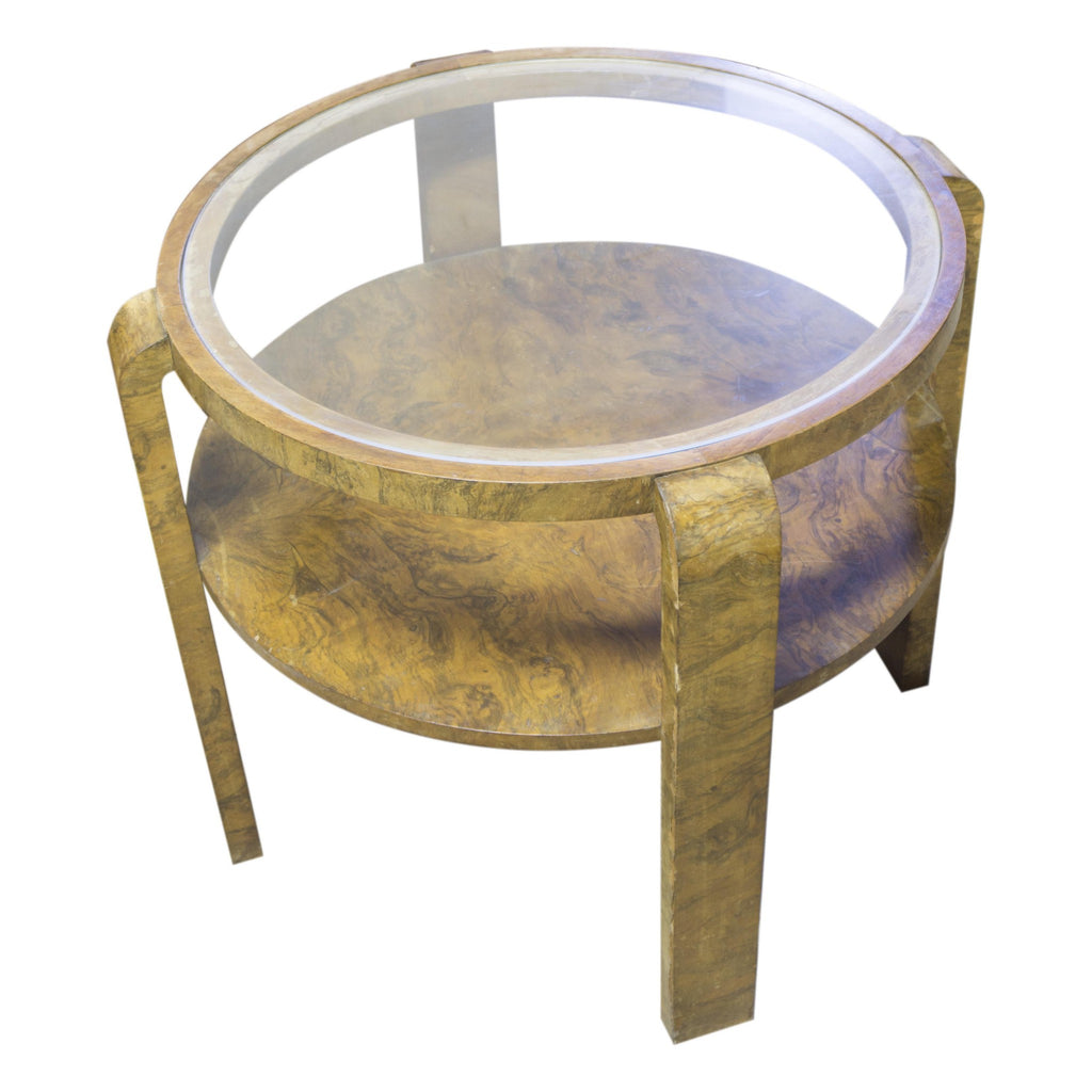 Glazed coffee table ART DECO, attributed to Jindřich Halabala, 1930´s, Czechoslovakia. Very interesting model. The rounded shape, walnut veneer. On the legs at several places very damaged veneer, see photo. Other places in preserved condition