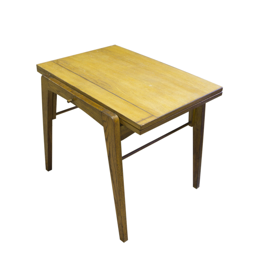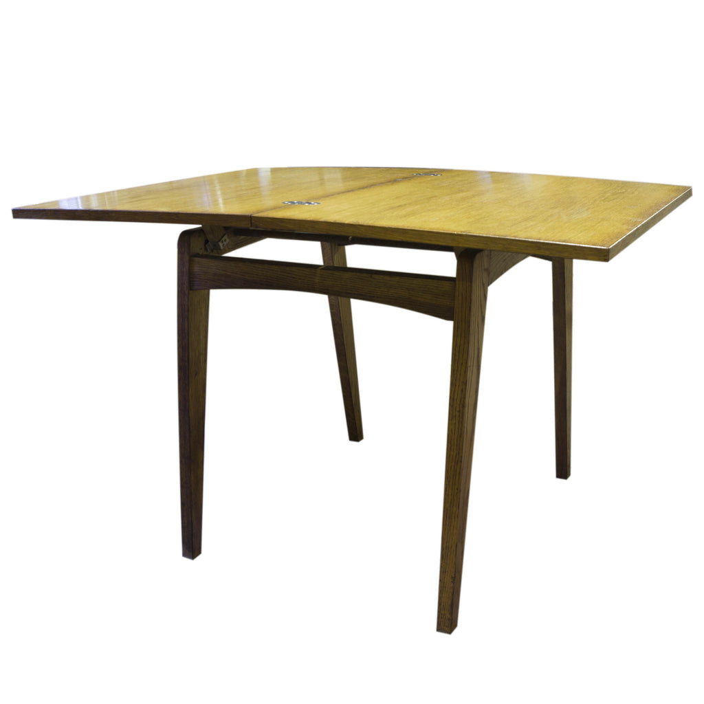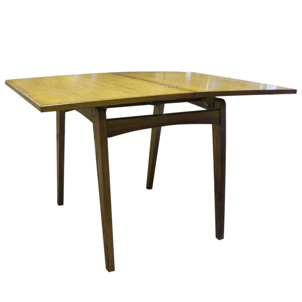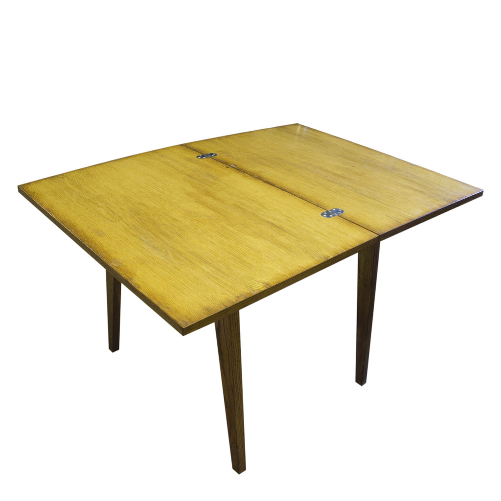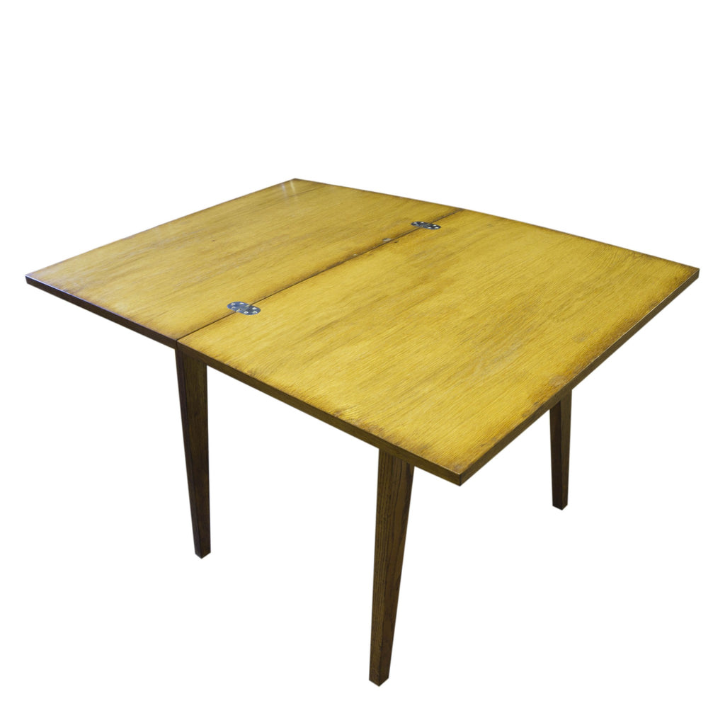 Vintage folding dining table 60´s of the 20th century. Two identically sized centrally hinged leaves that unfold to double the usable table area. Very good condition. Height 67 cm, length 77 cm, width 60 cm.