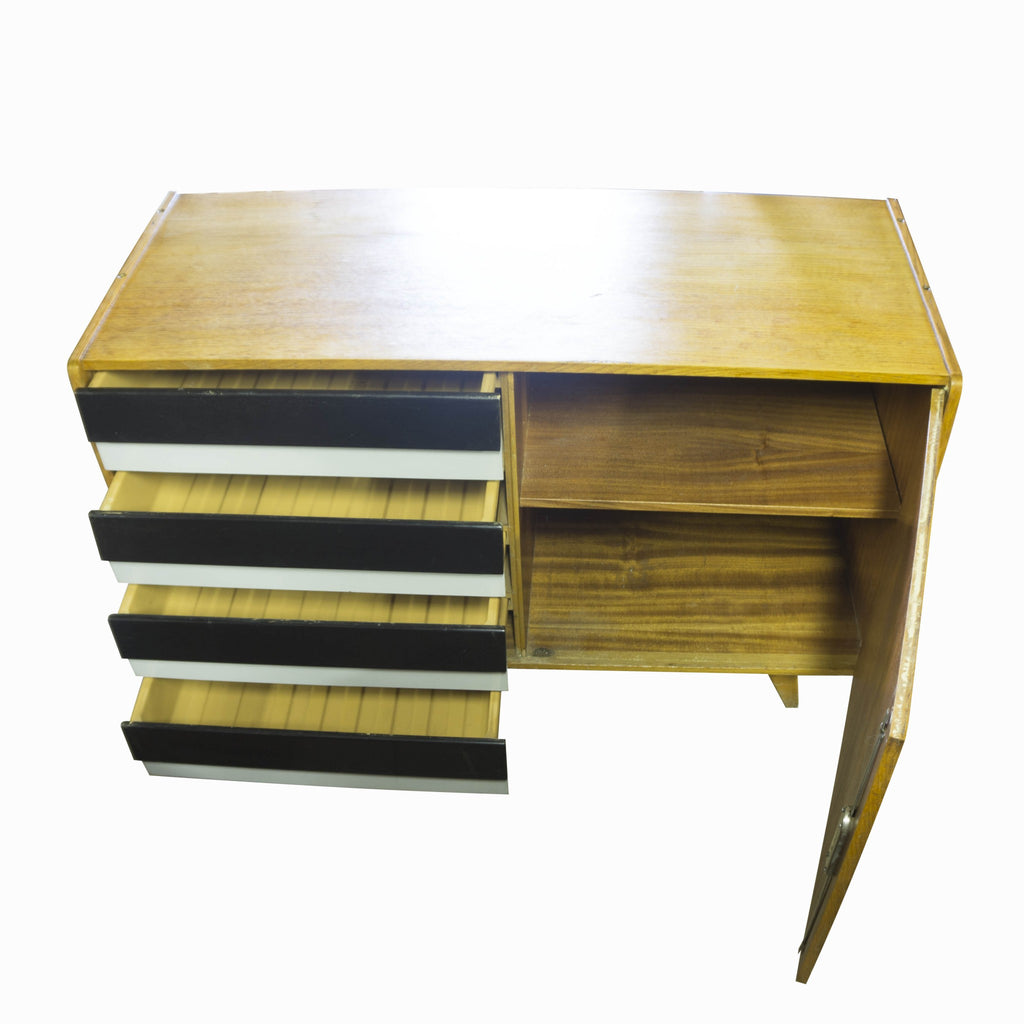 Wonderful and popular Vintage secretary / sideboard U-450 from the 60s of the last century. Middle Europe, Scandinavian-style. In good vintage condition. Beechwood. Colored lacquered drawers. Minor abrasions and scratches in the context of age and use. Small cleaved of veneer. See photos.