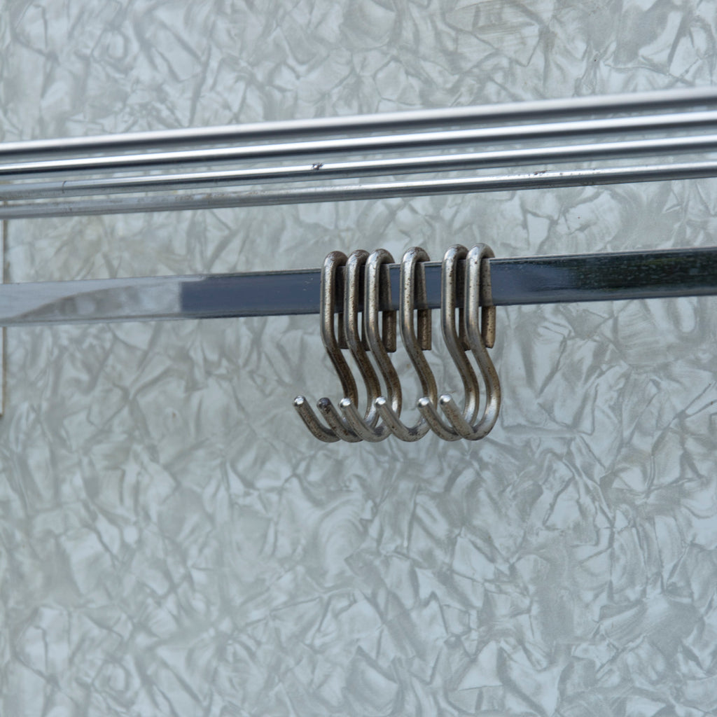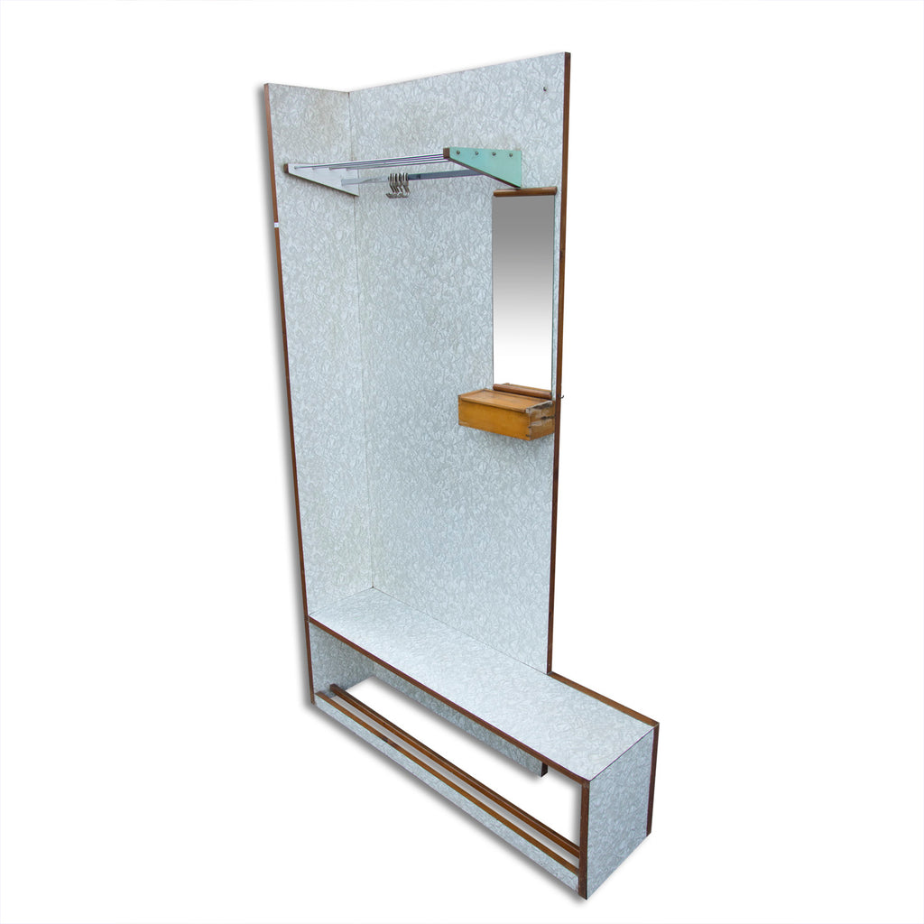 This hall corner coat rack was made in the former Czechoslovakia in the 1960s and produced by DREVOTVAR. It features chrome-plated hangers, mirror with a small storage space and at the bottom is space for shoes. Material: plywood, formica, metal. It´s in good original condition.