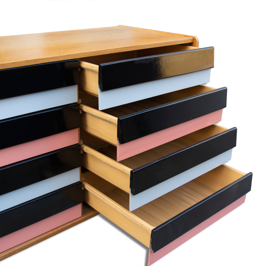 Modernist chest of drawers U-453 from the 1960´s. It was designed by Jiří Jiroutek and produced by Interiér Praha. It features a beechwood and plywood structure and colored lacquered drawers. The chest is in excellent condition, fully refurbished.
