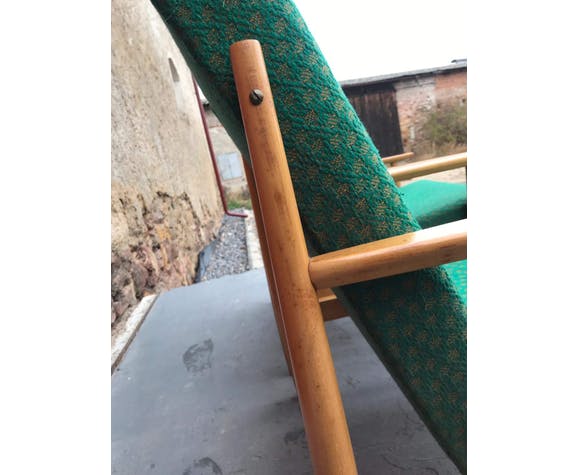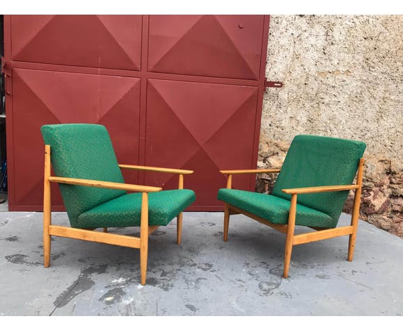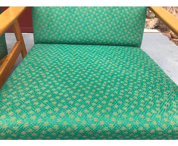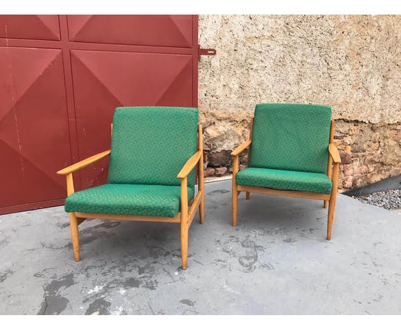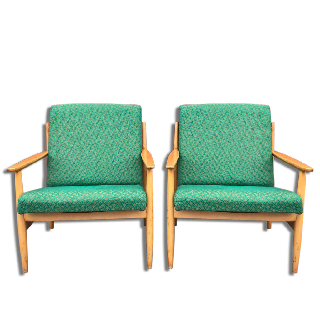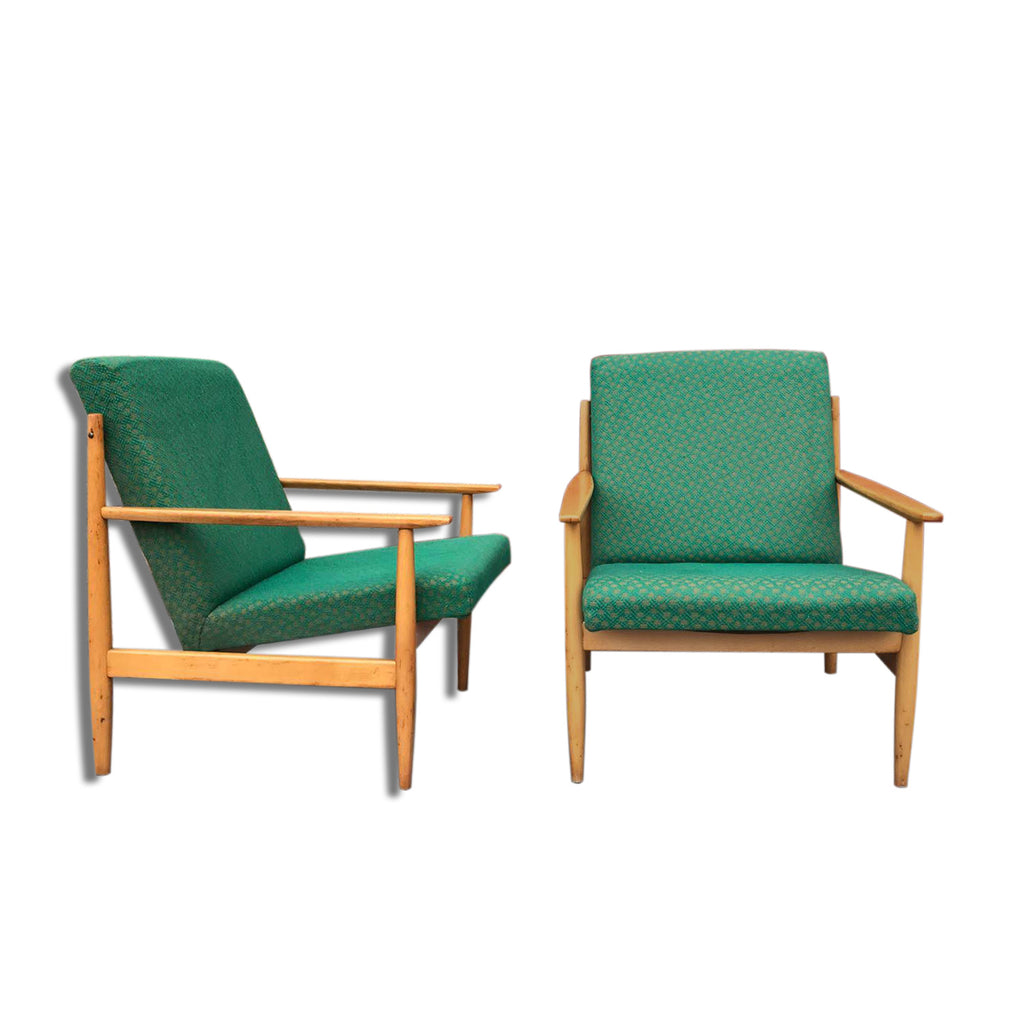 Pair of Danish style armchairs, made in the 1970s in the former Czechoslovakia by TON Bystrice pod Hostýnem. The structure is in beech wood, the chairs has an original upholstery. The chairs are generally in very good vintage condition without any damage, bear signs of age and use. Price is for the pair