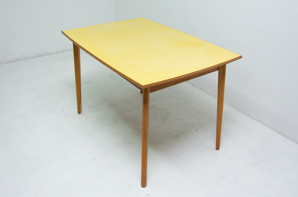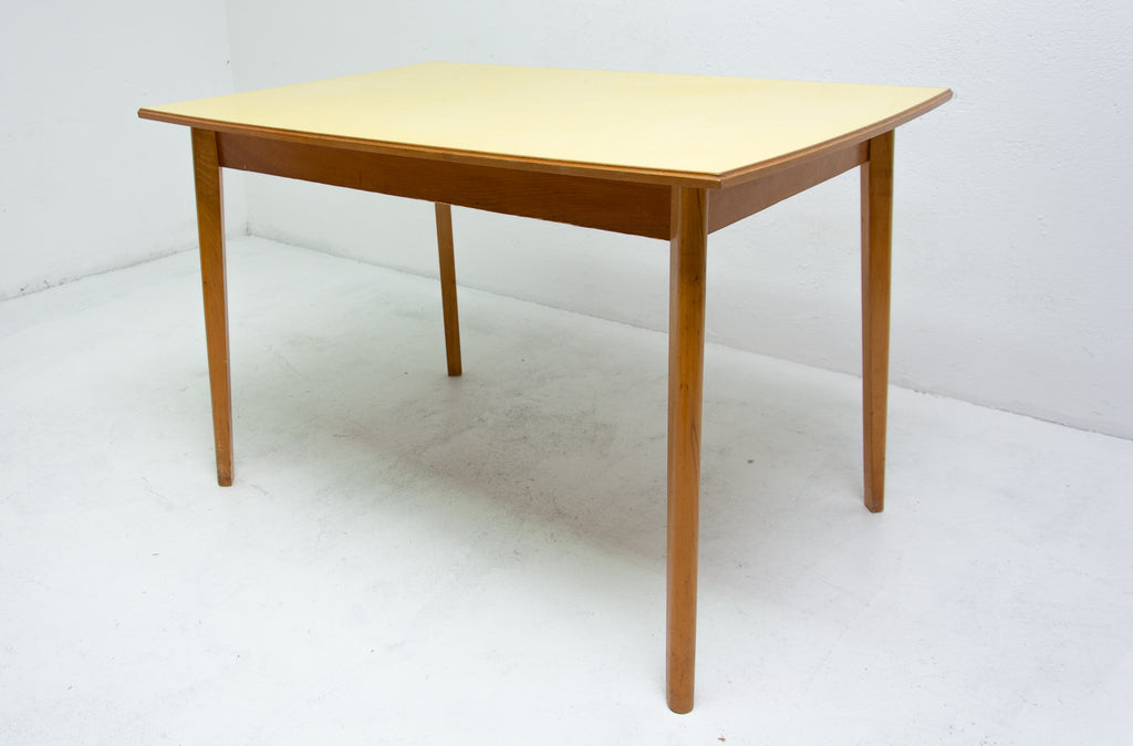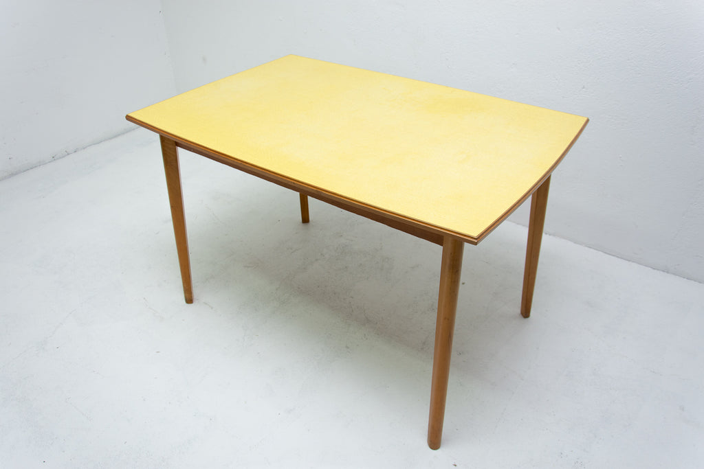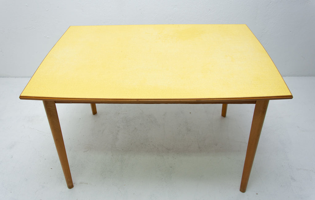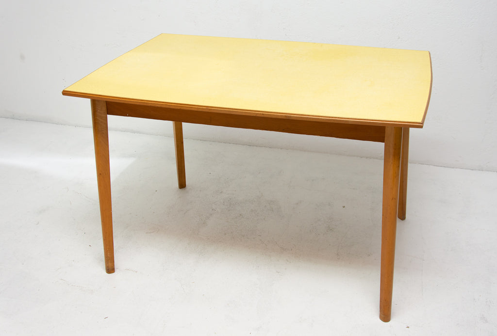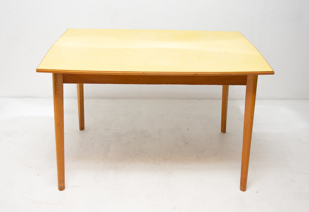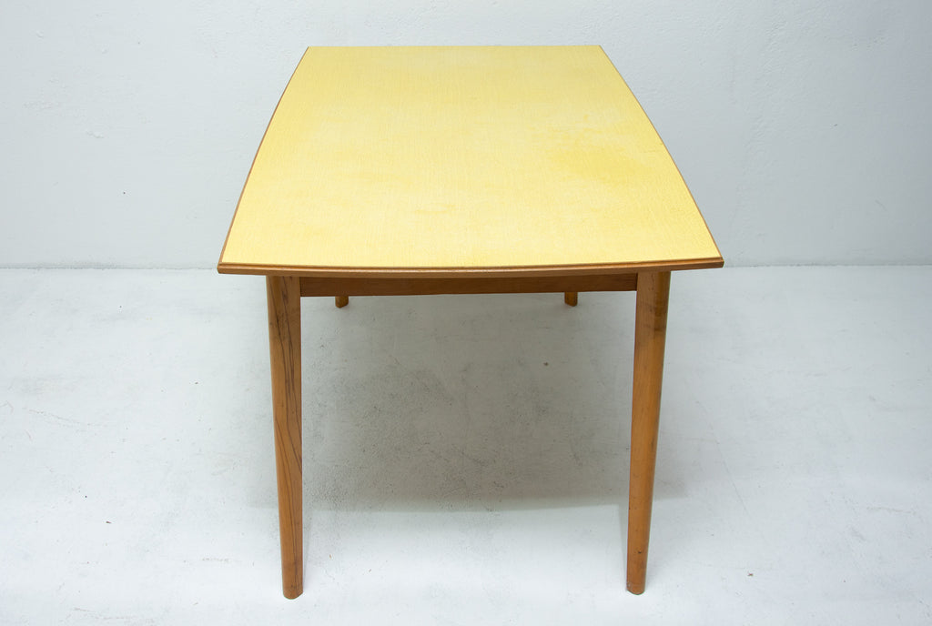 Mid Century dining table with a formica plate, it was made in the former Czechoslovakia in the 1960´s. Very interesting shaping. In very good Vintage condition, just bears minor signs of age and use.