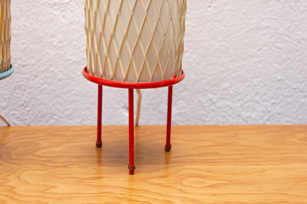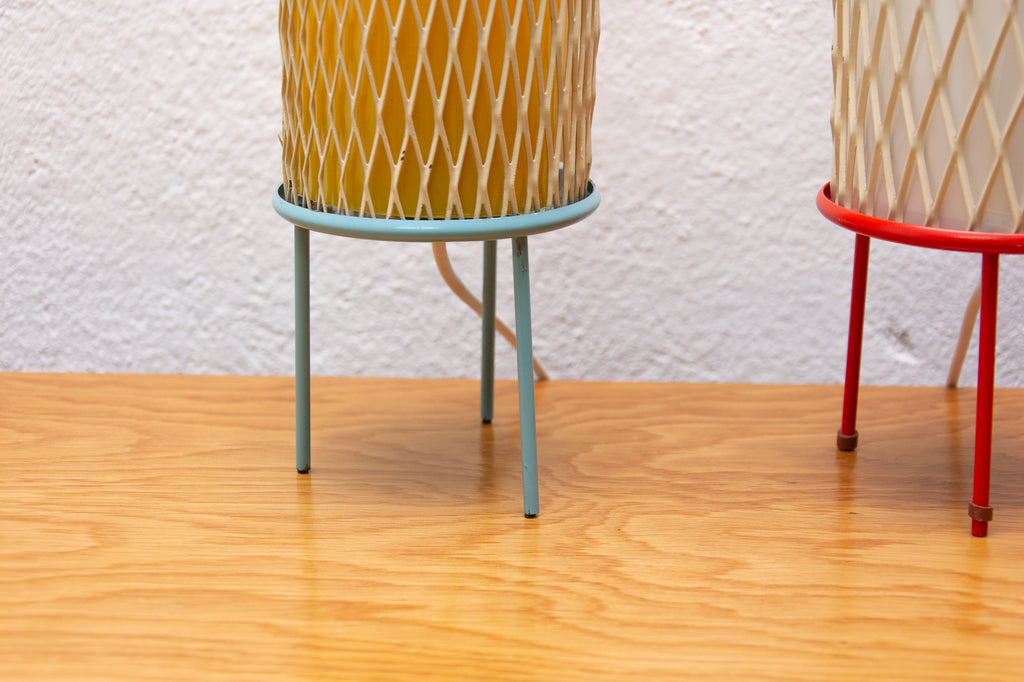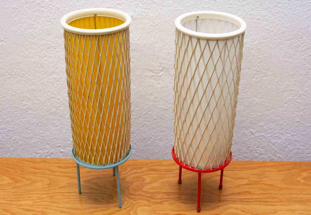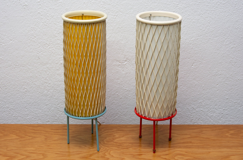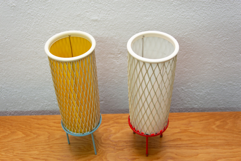 These rocket table lamps were made in the former Czechoslovakia in the 1960's. The design of these lamps is connected with the so-called Brussels period, associated with the world-famous EXPO 58 exhibition in Brussels, where the Czechoslovak Pavilion has been a huge success. Have a metal structure, an oval resin lampshade shaped like rocket. They are in very good vintage condition and have a new wiring.
