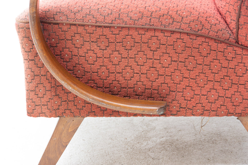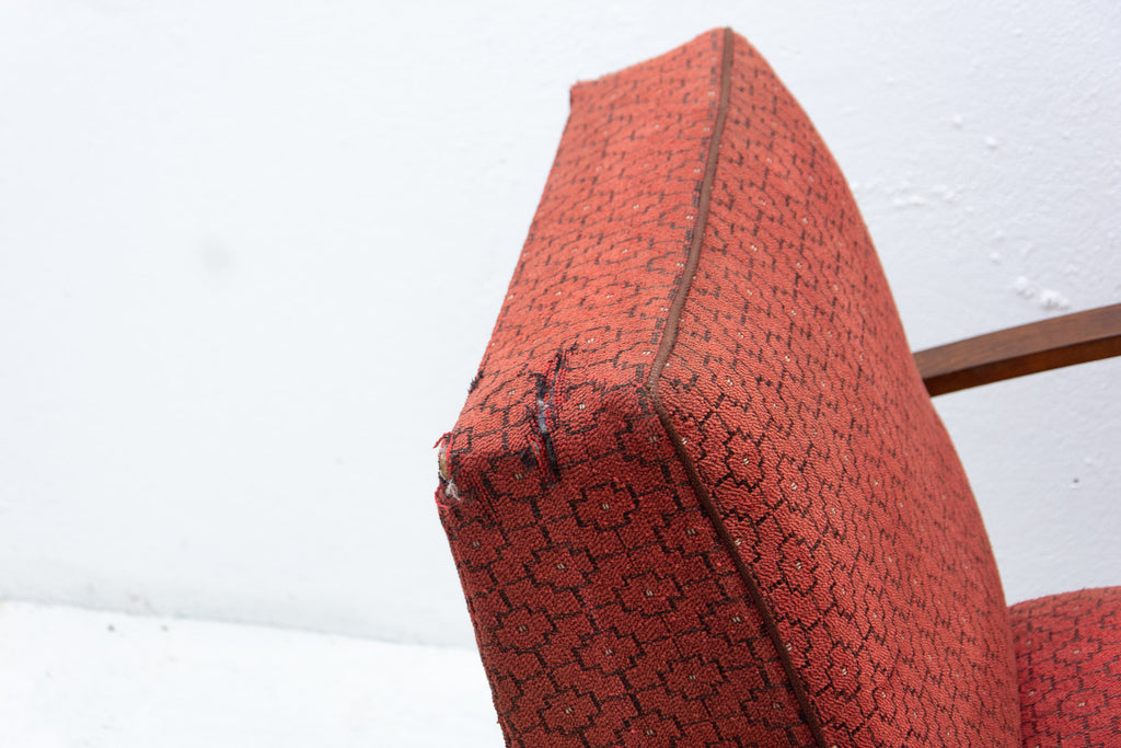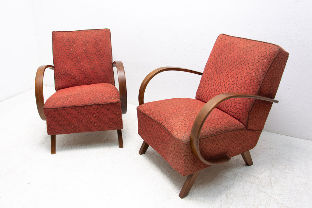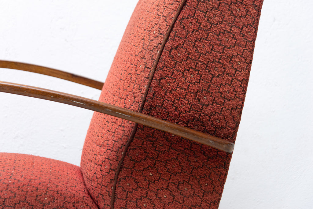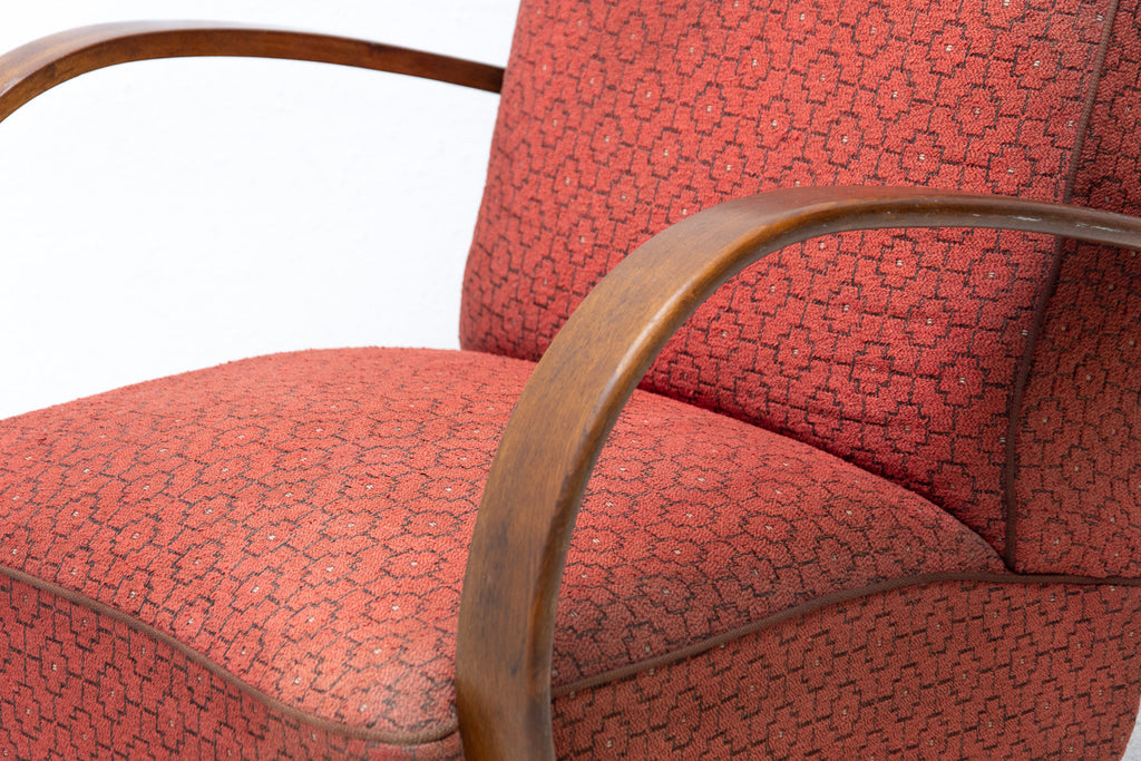 These bentwood armchairs “C” was designed by Jindřich Halabala and were made in the 1950´s. The chairs are stable and comfortable, the wood is in good Vintage condition. The fabric shows signs of age and using and small cracks in the fabric. Price is for the pair.