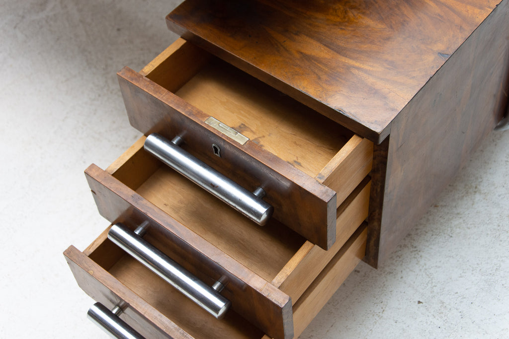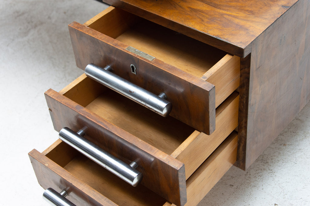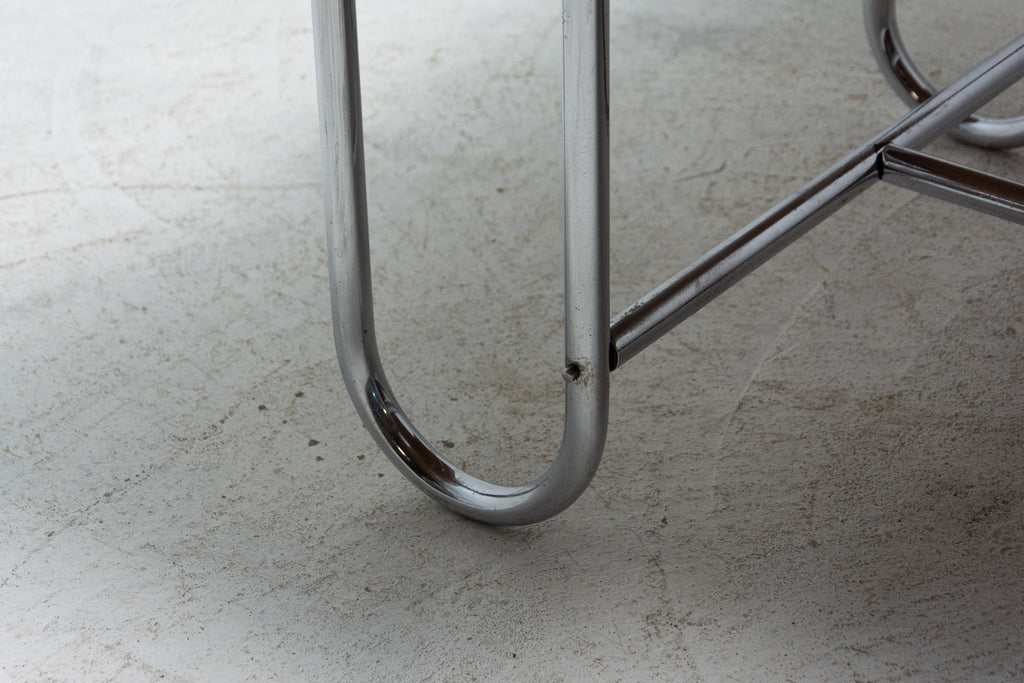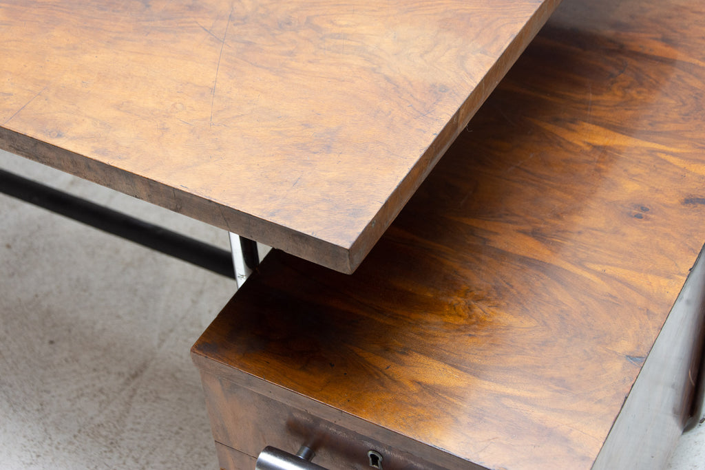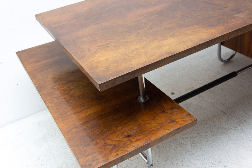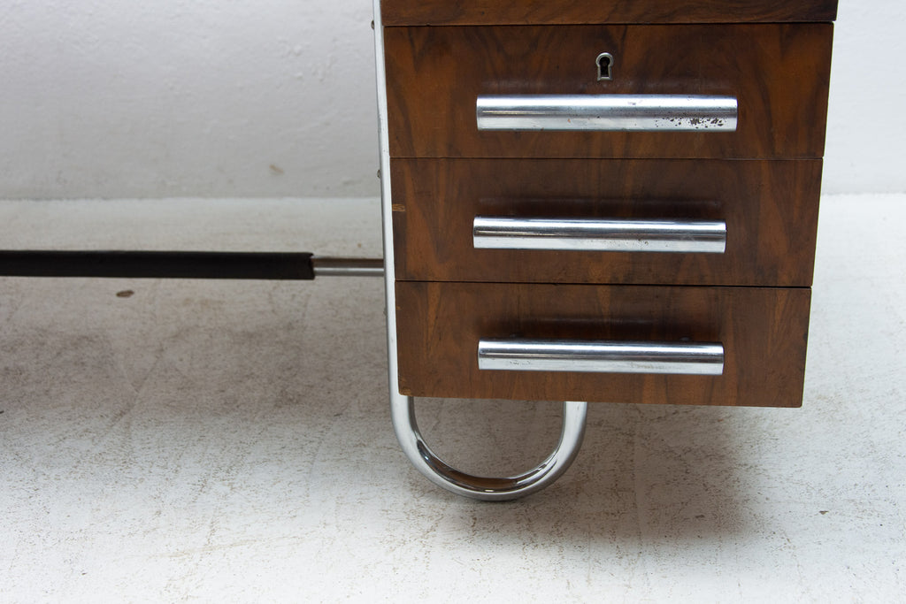 A typical example of European functionalism and the works of leading designers. Chromium steel construction, plywood veneered with walnut wood veneer. There are currently not many of these pieces on the market today. The table is in original condition, shows signs of age and using.
