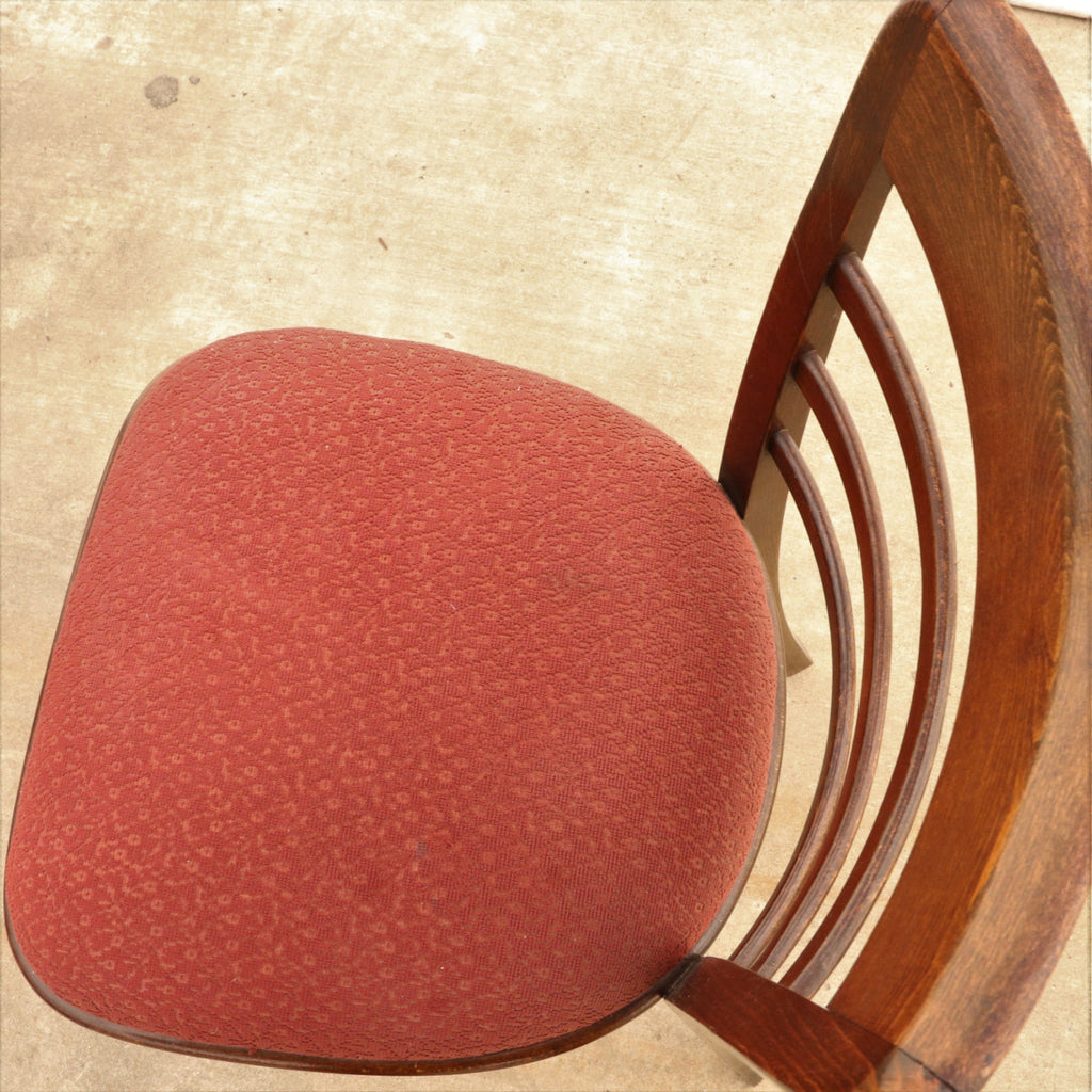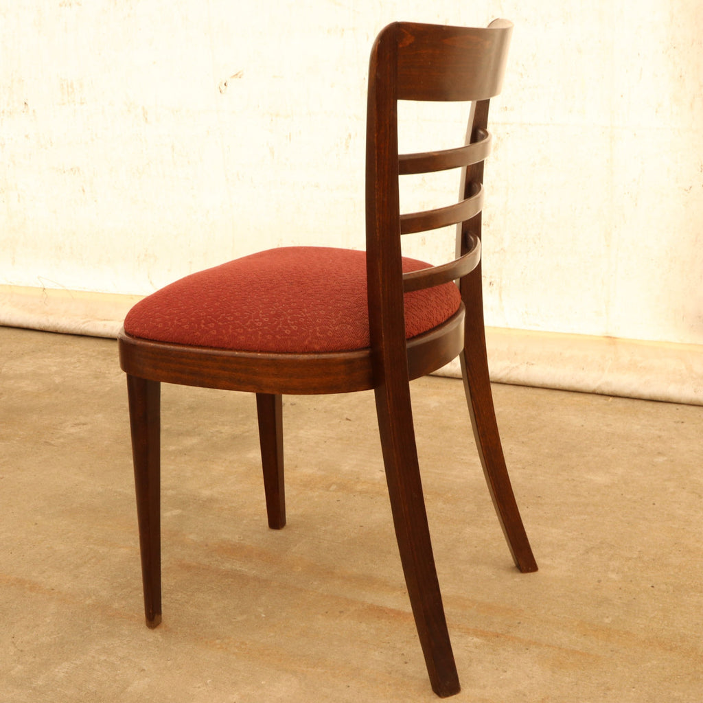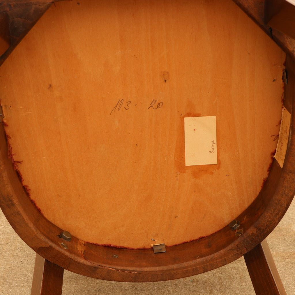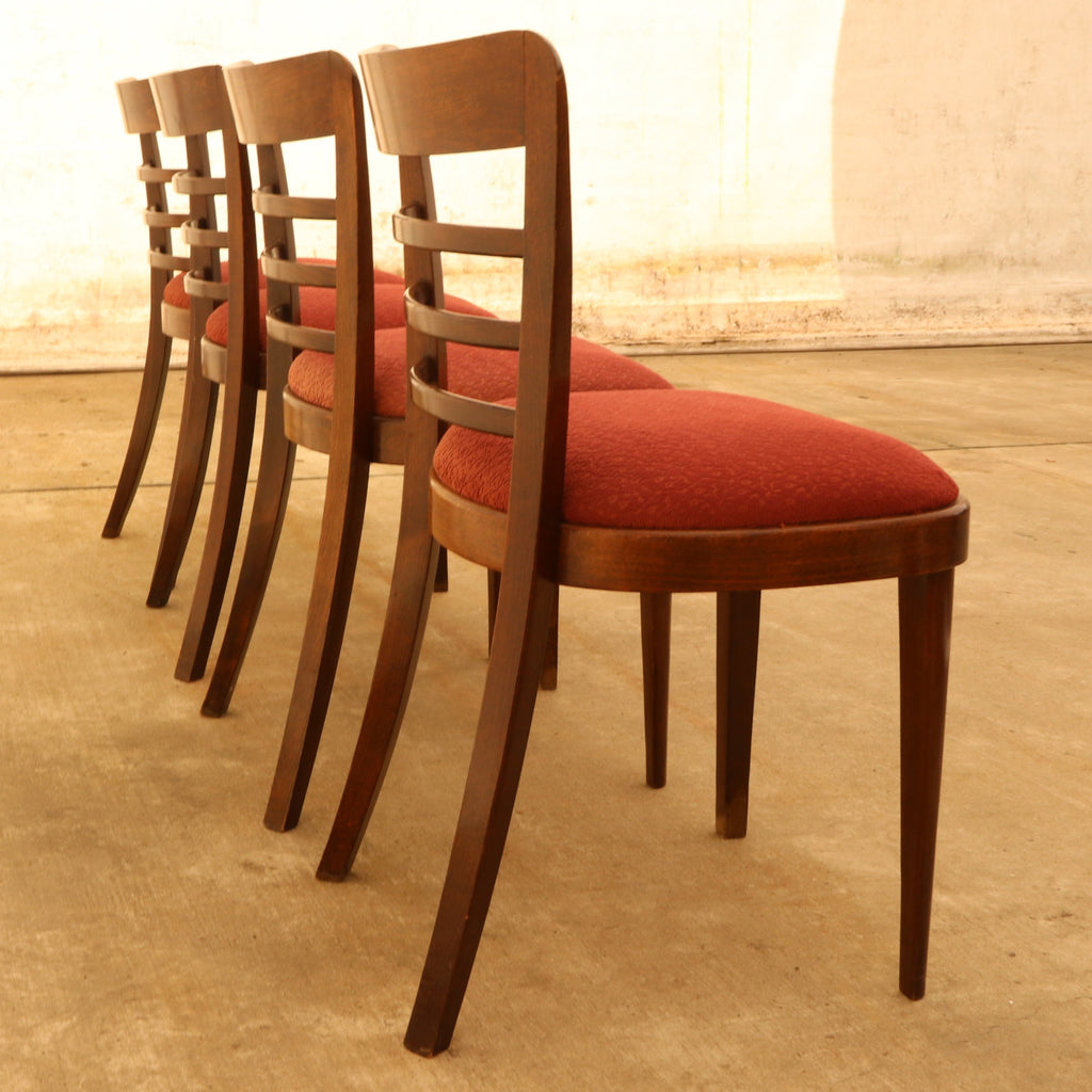 They are made of walnut and upholstered in burgundy fabric. The chairs are in very good Vintage condition, wear commensurate with the age of the chairs. Price is for the set of four.