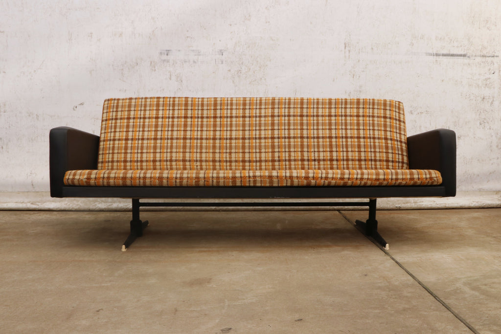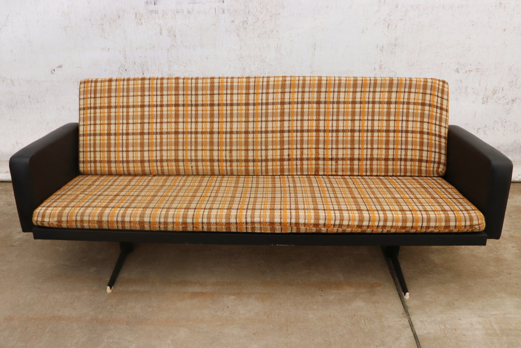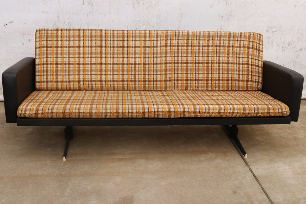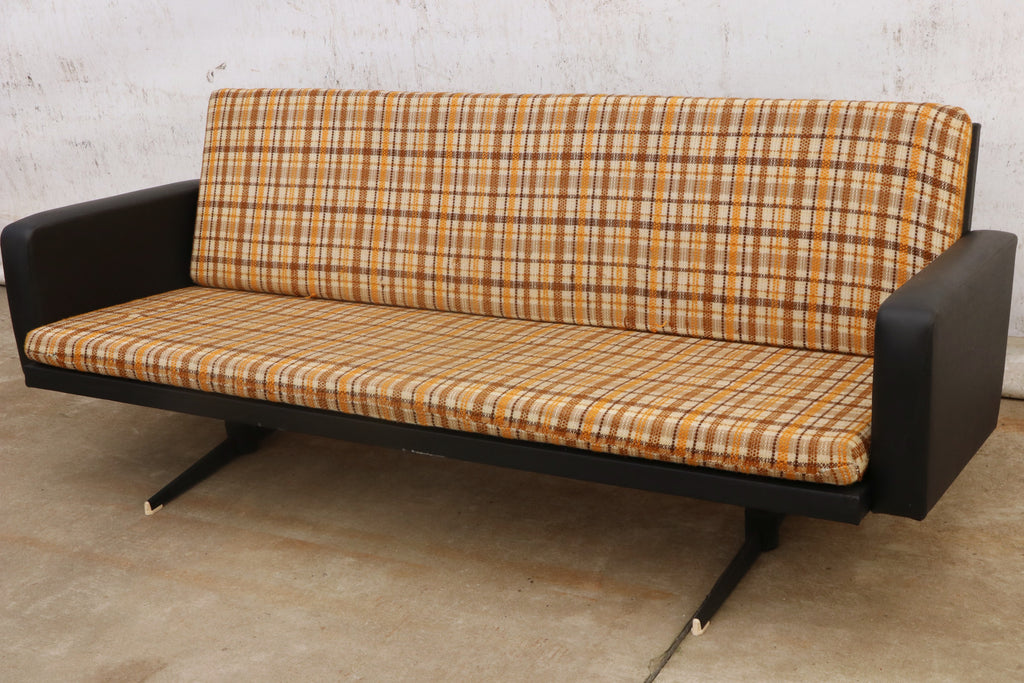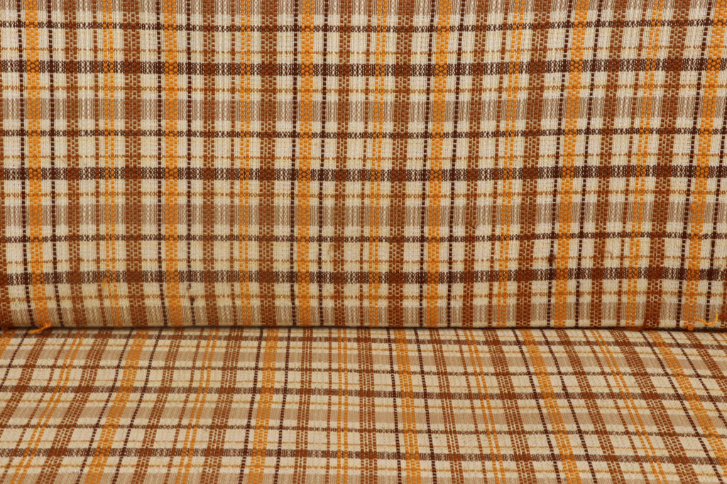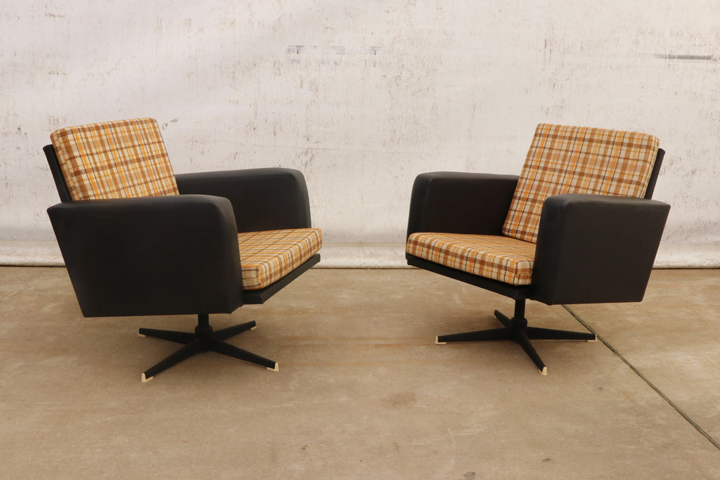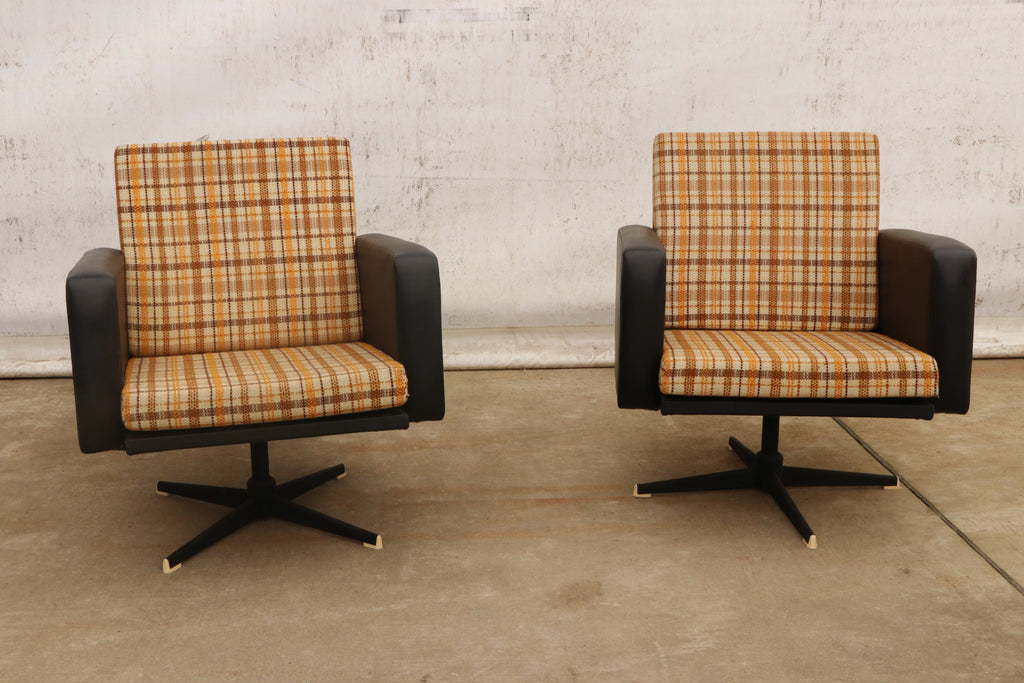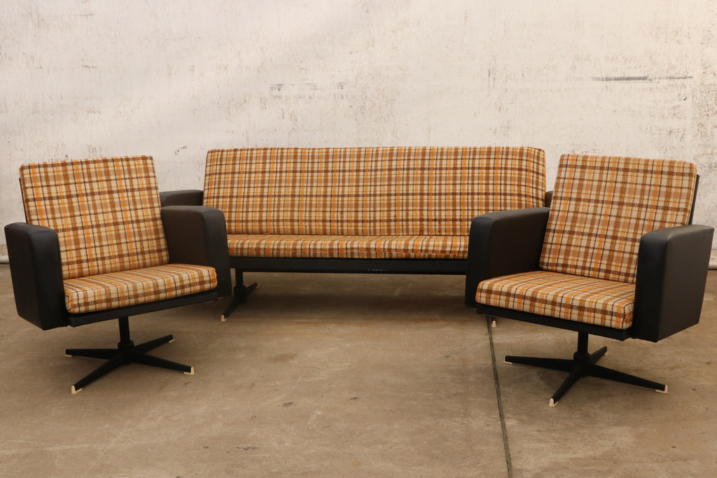 This vintage lounge or office set was made in Czechoslovakia in the 1970s and consists of one sofa and a pair of swivel armchairs. The set is upholstered with brown leatherette and features original checkered fabric. The legs are made of iron. All is in really very good original condition.
