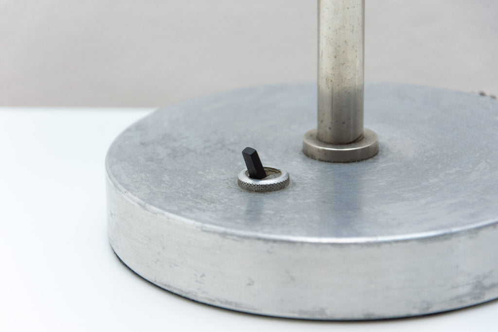 Characteristic desk lamp, Bauhaus style, designed in 1930. The lamp has a chromium plated base and an enameled metal cap. The arm and cap are adjustable. Fully adjustable and a fantastic look that fits in many interiors. In good Vintage condition, shows slight signs of age and using. New wiring.