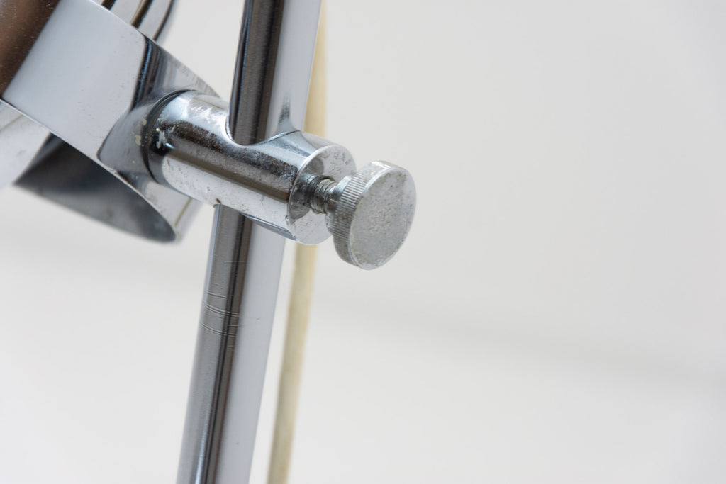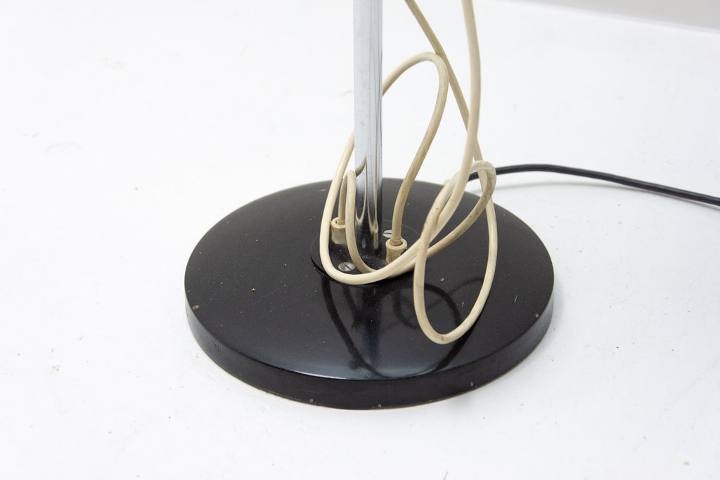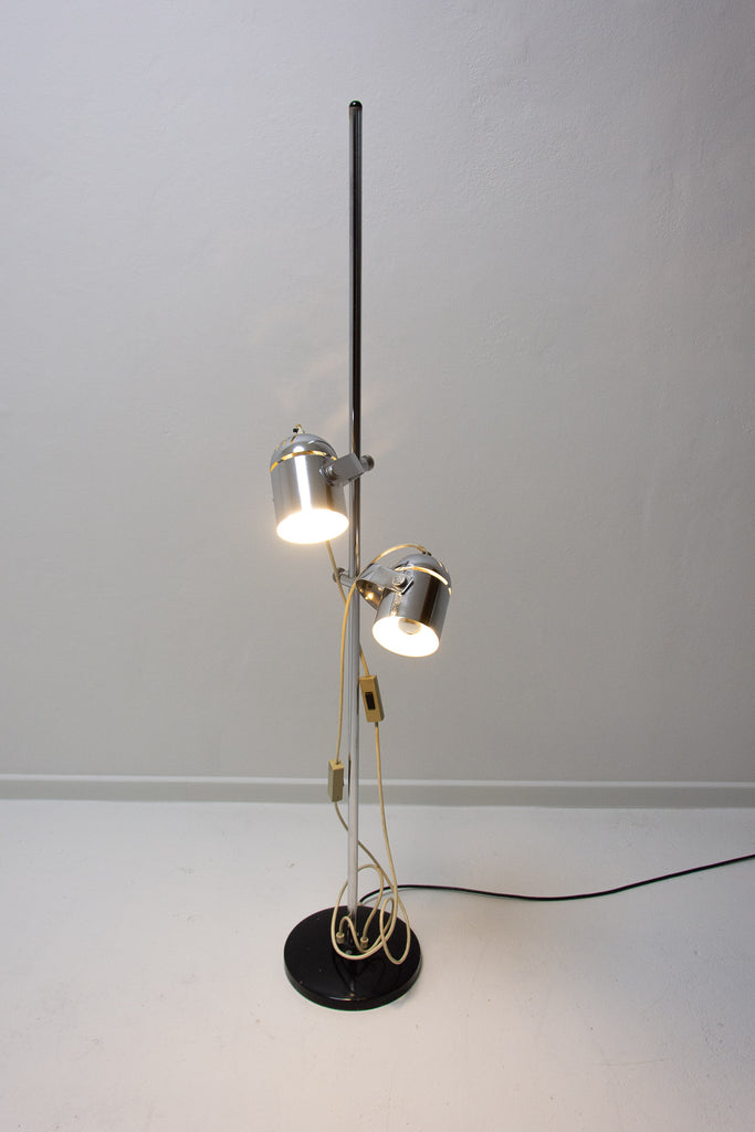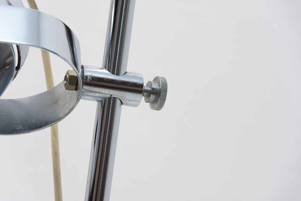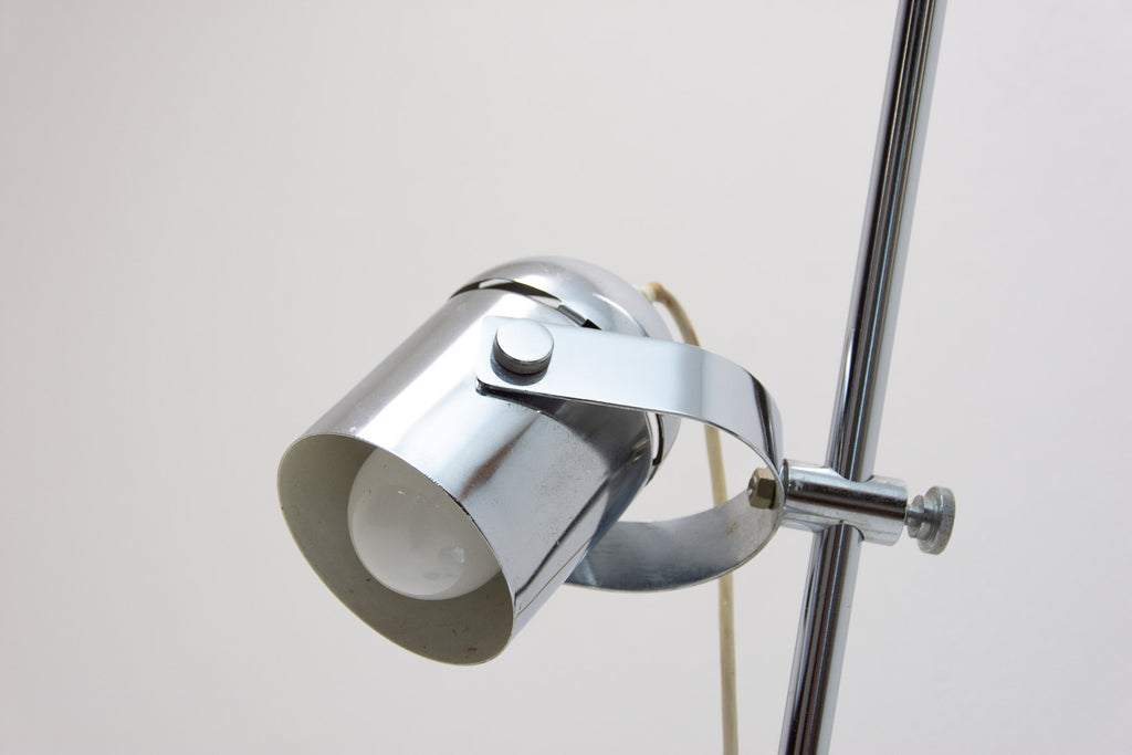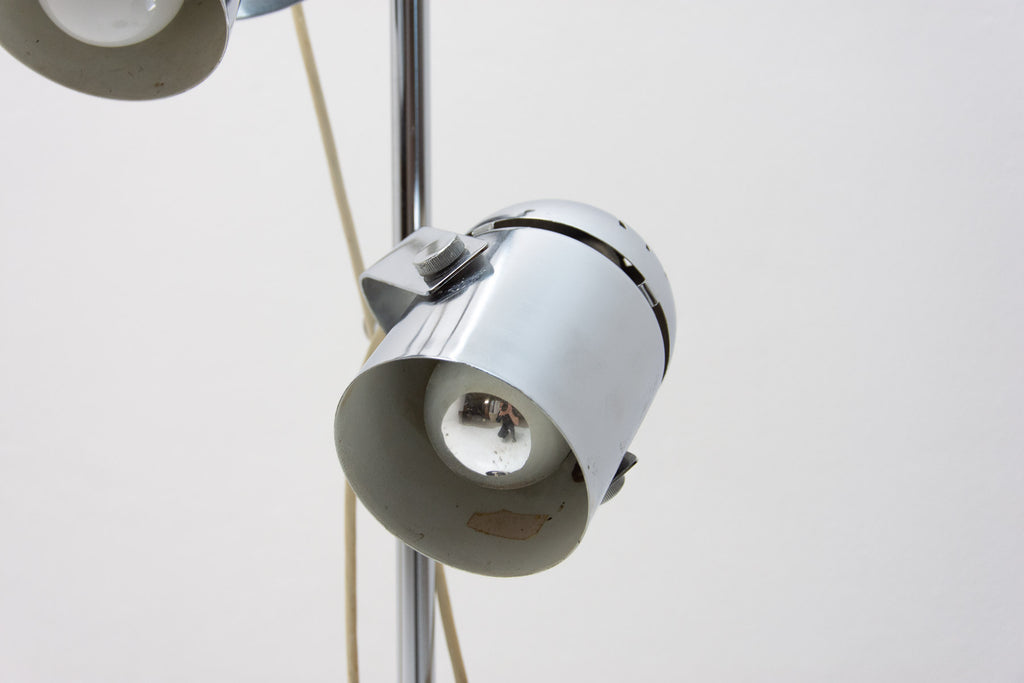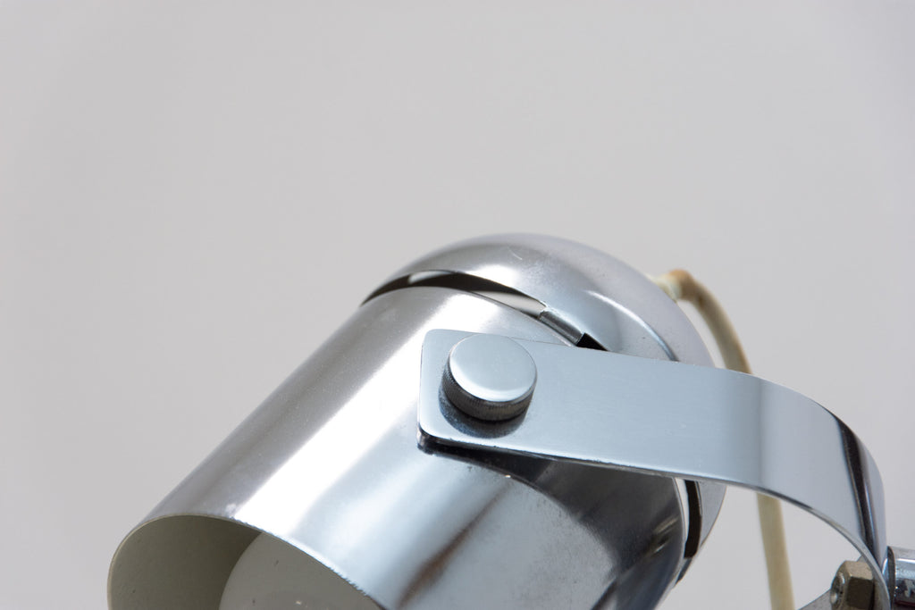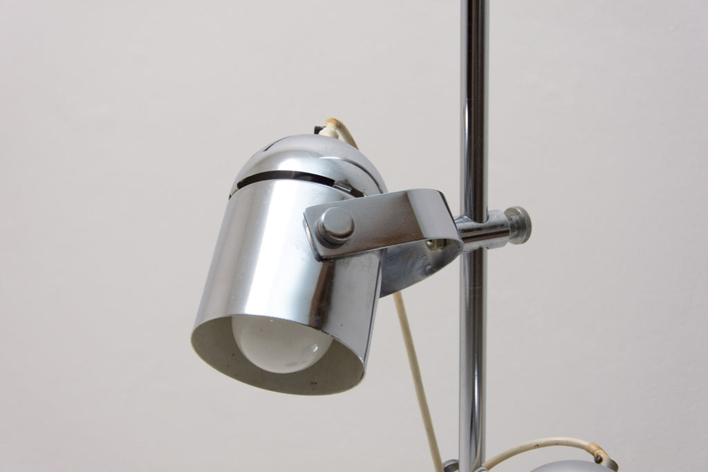 It features a chrome plated structure, two plastic lampshades adjustable to the sides and up and down. The lamp is in very good Vintage condition, fully functional.