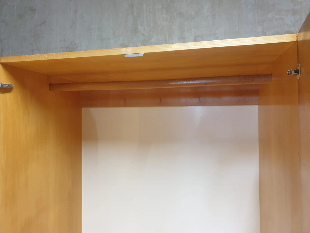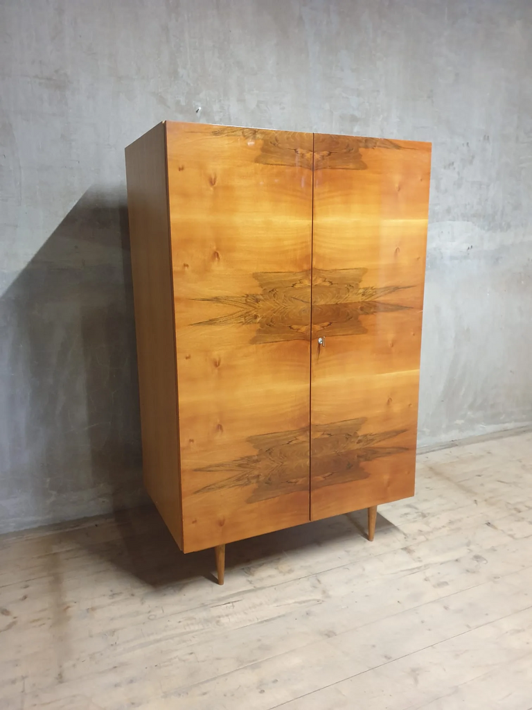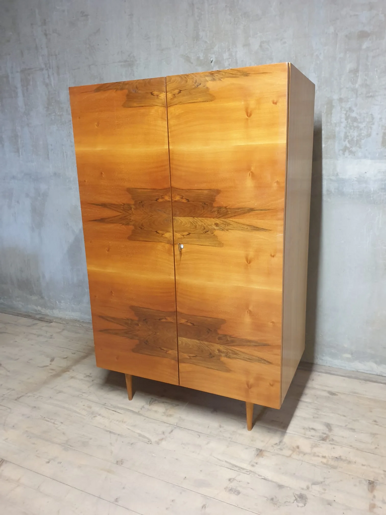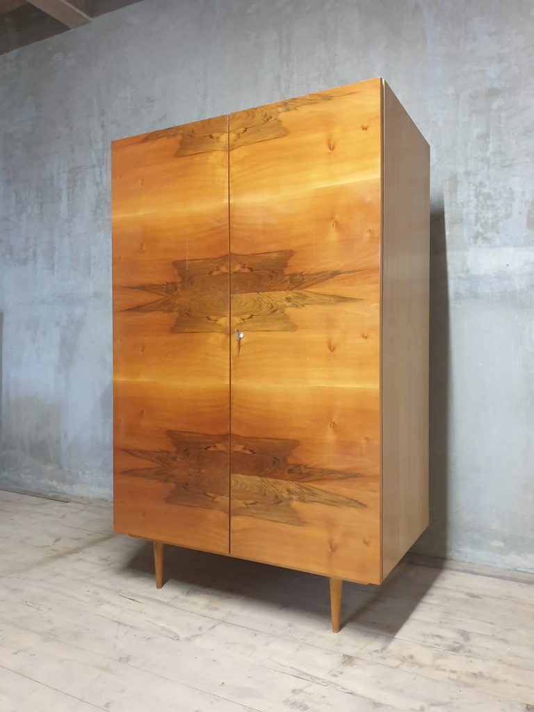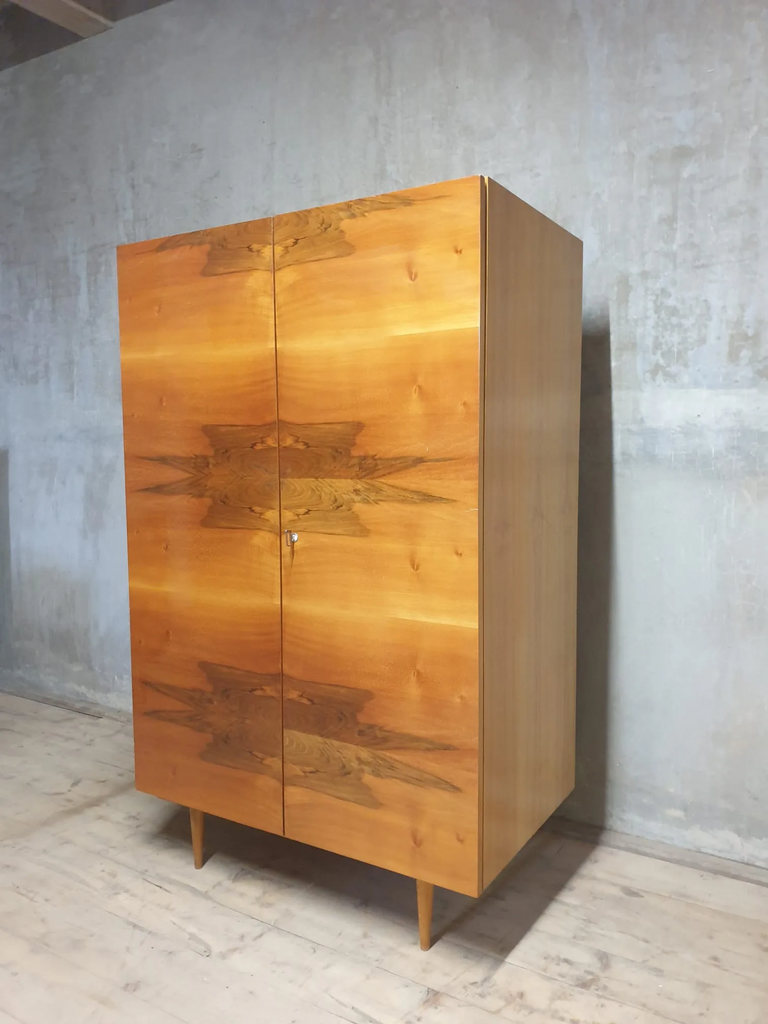 This Elegant vintage wardrobe was made in the former Czechoslovakia in the 1970´s. One wooden clothes rod inside. It features a very attractive wooden pattern. It´s in very good Vintage condition, with minor signs of age and using. It´s made of ash wood, walnut and plywood.