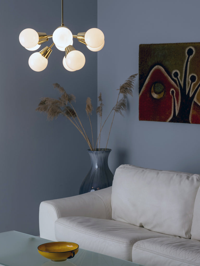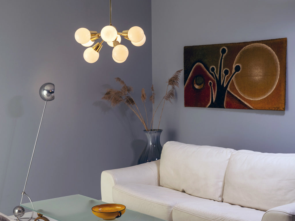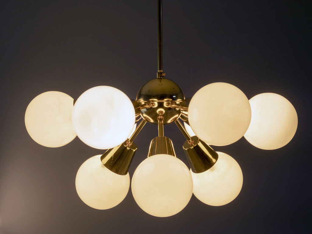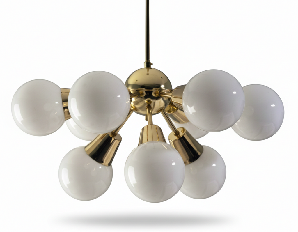 This nine-arm “Sputnik” chandelier was designed by Jaroslav Bejvl Sr. in the 1970s for Lustry n. p. Kamenický Šenov, a renowned Czechoslovak lighting manufacturer. The piece features a polished brass central sphere with nine radiating arms ending in white opal glass shades, combining brass and milk glass in a refined mid-century composition. The chandelier remains in undamaged, original condition and represents a characteristic example of Czech lighting design from the period, suitable as a central fixture in living spaces, dining rooms, entry halls, or interiors requiring a distinctive vintage element.
