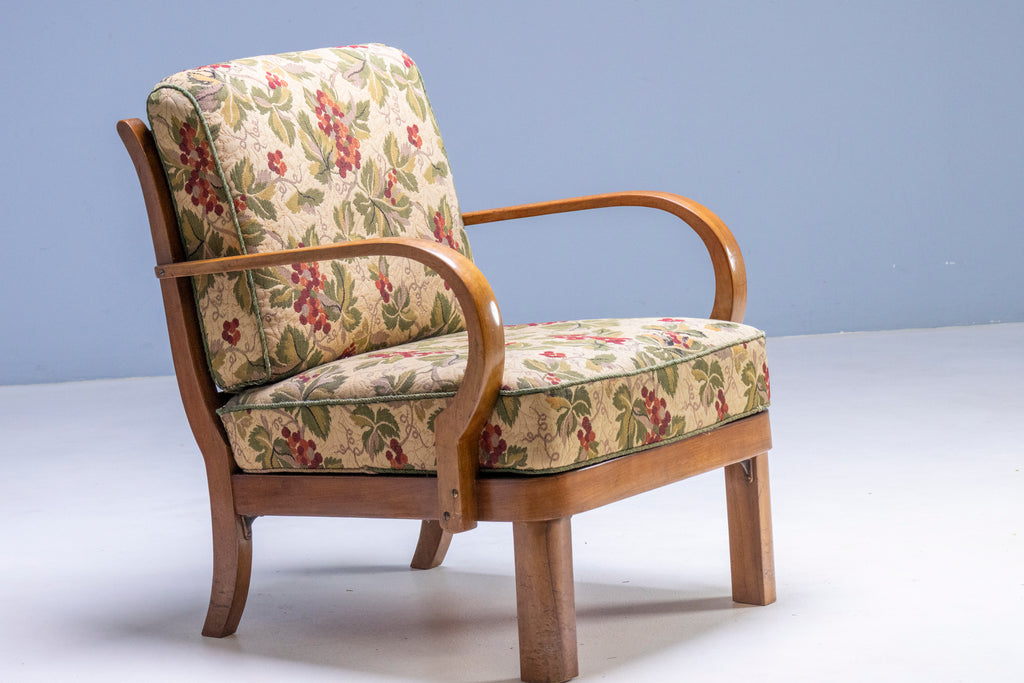 A stylish pair of upholstered armchairs produced in the 1940s by Thonet, one of the most renowned European furniture manufacturers. These elegant chairs feature beautifully shaped bentwood armrests, a gently rounded solid frame, and original floral upholstery that adds a warm vintage character to any interior.