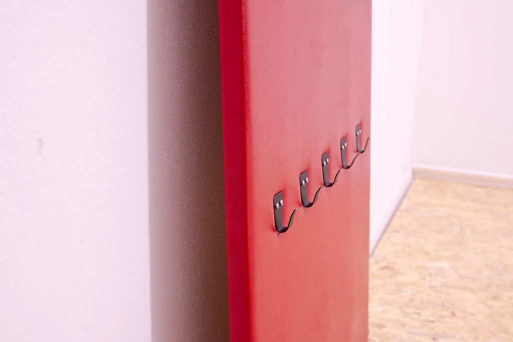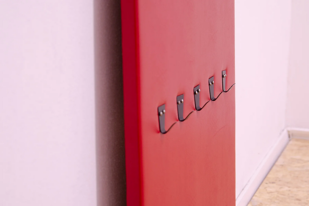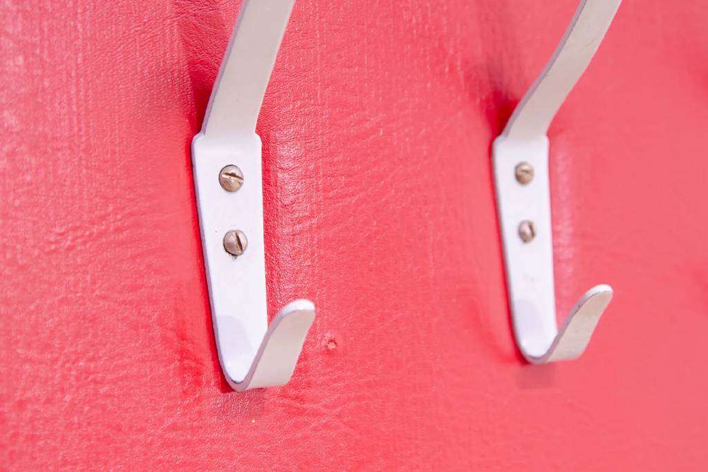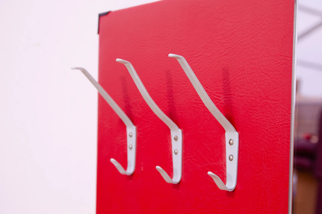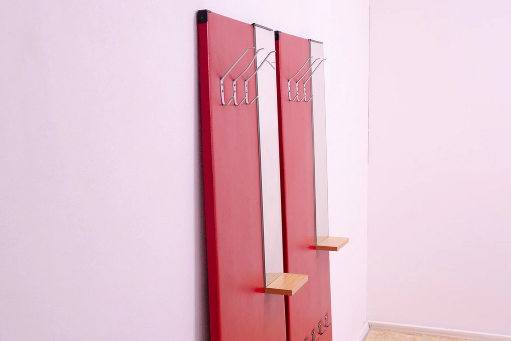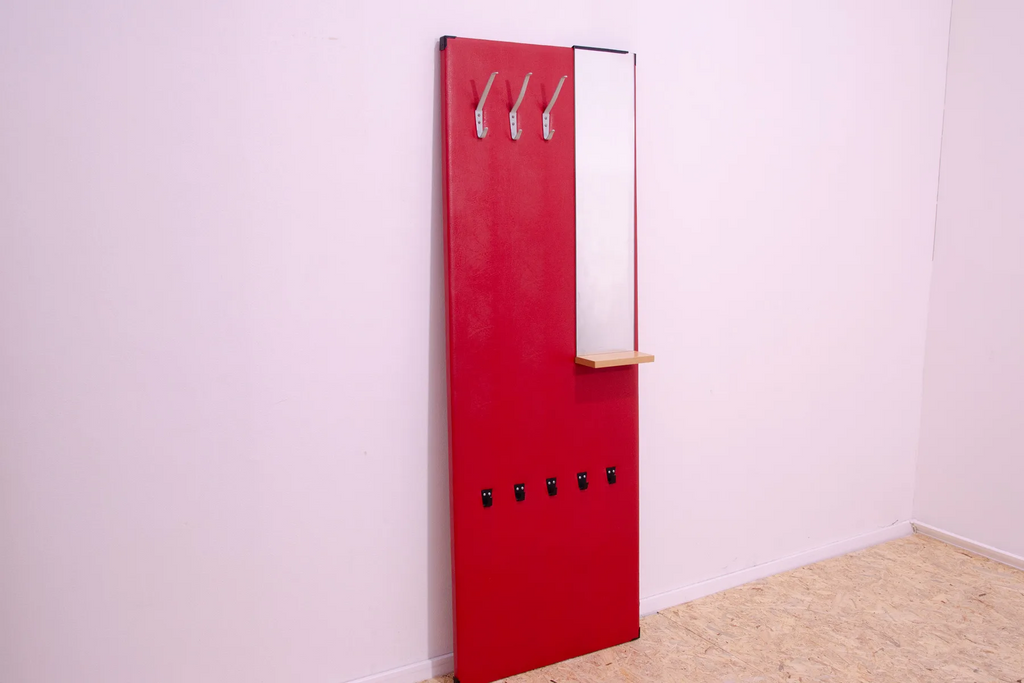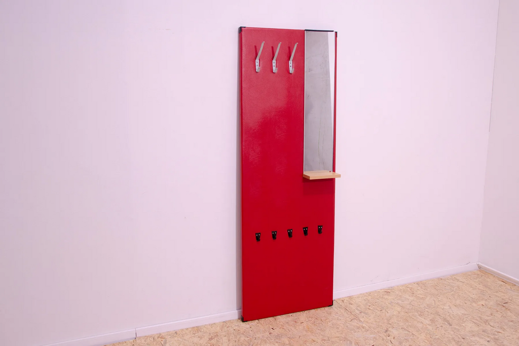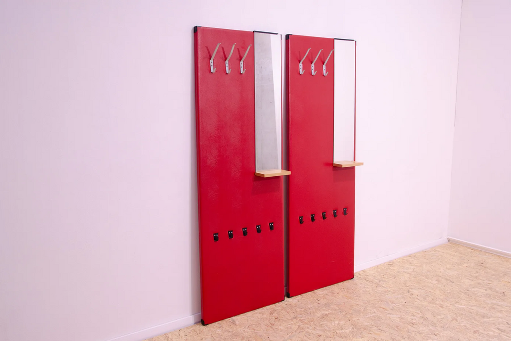 Ces porte-manteaux d'entrée identiques ont été fabriqués dans l'ancienne Tchécoslovaquie dans les années 1960 par DREVOTVAR. Matériaux : contreplaqué, bois, similicuir, métal. Ils peuvent être fixés au mur ou posés librement au sol.
