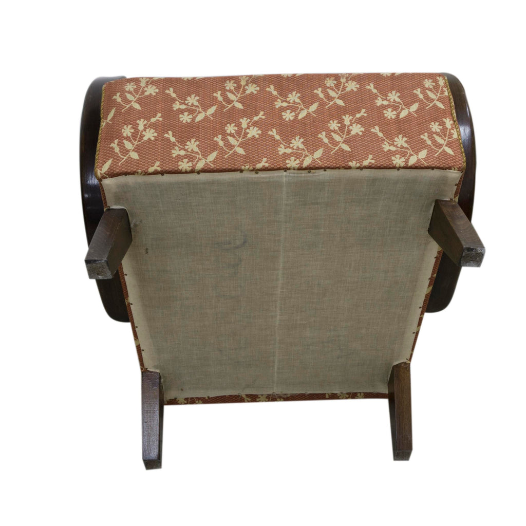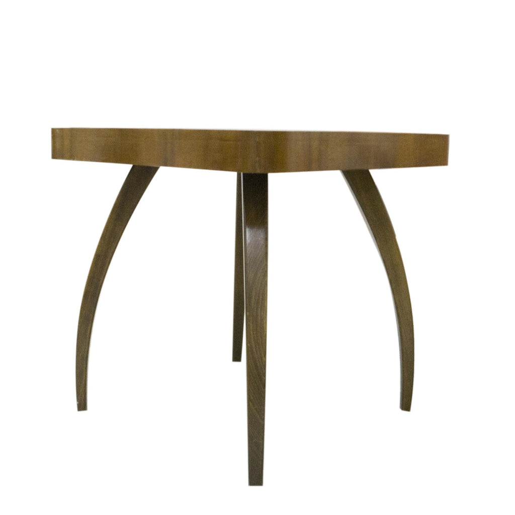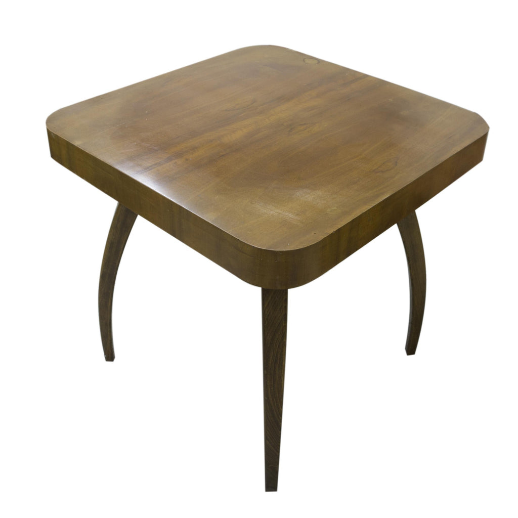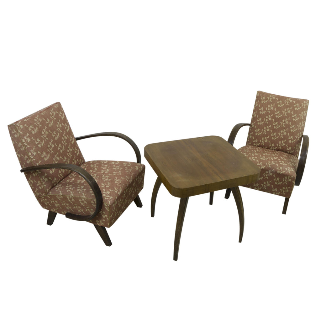 Modèle très réussi, conçu par l'un des plus grands designers européens d'avant-guerre. Fabriqué en bois massif et placage de noyer poli. La structure en bois et les chaises rembourrées sont en bon état. Seul le haut du revêtement des fauteuils présente quelques dommages d'usage. Dimensions de la chaise : hauteur 82 cm, assise 65 x 73 cm. Table également disponible : dimensions : 65 x 65 x 65 cm.