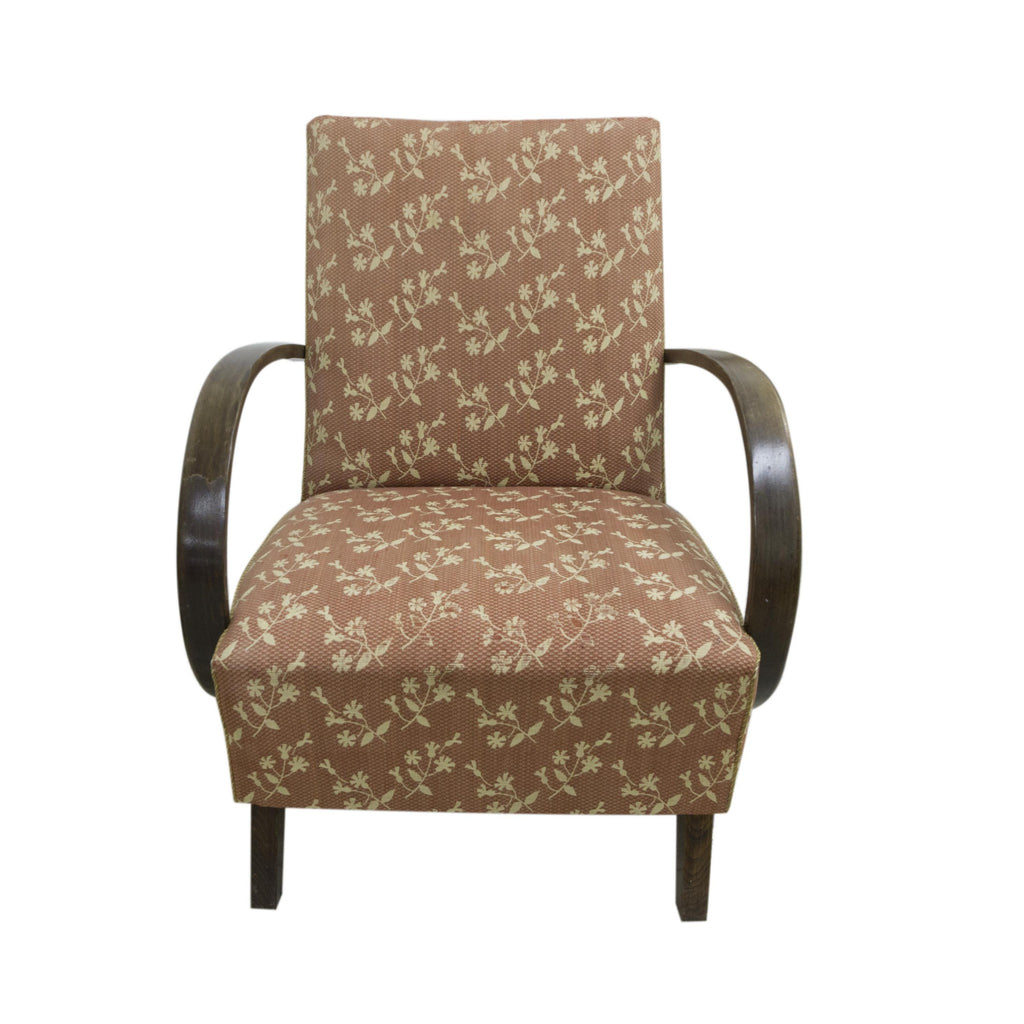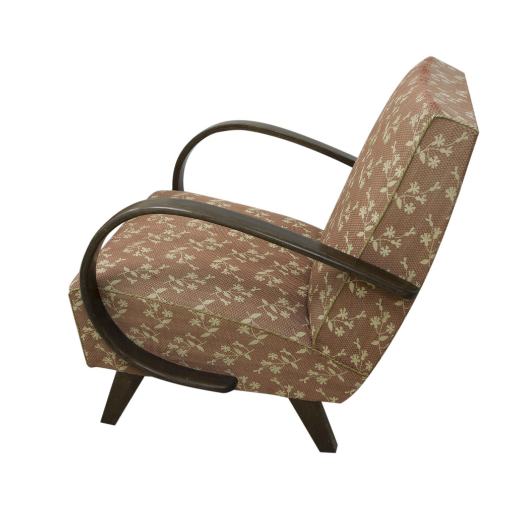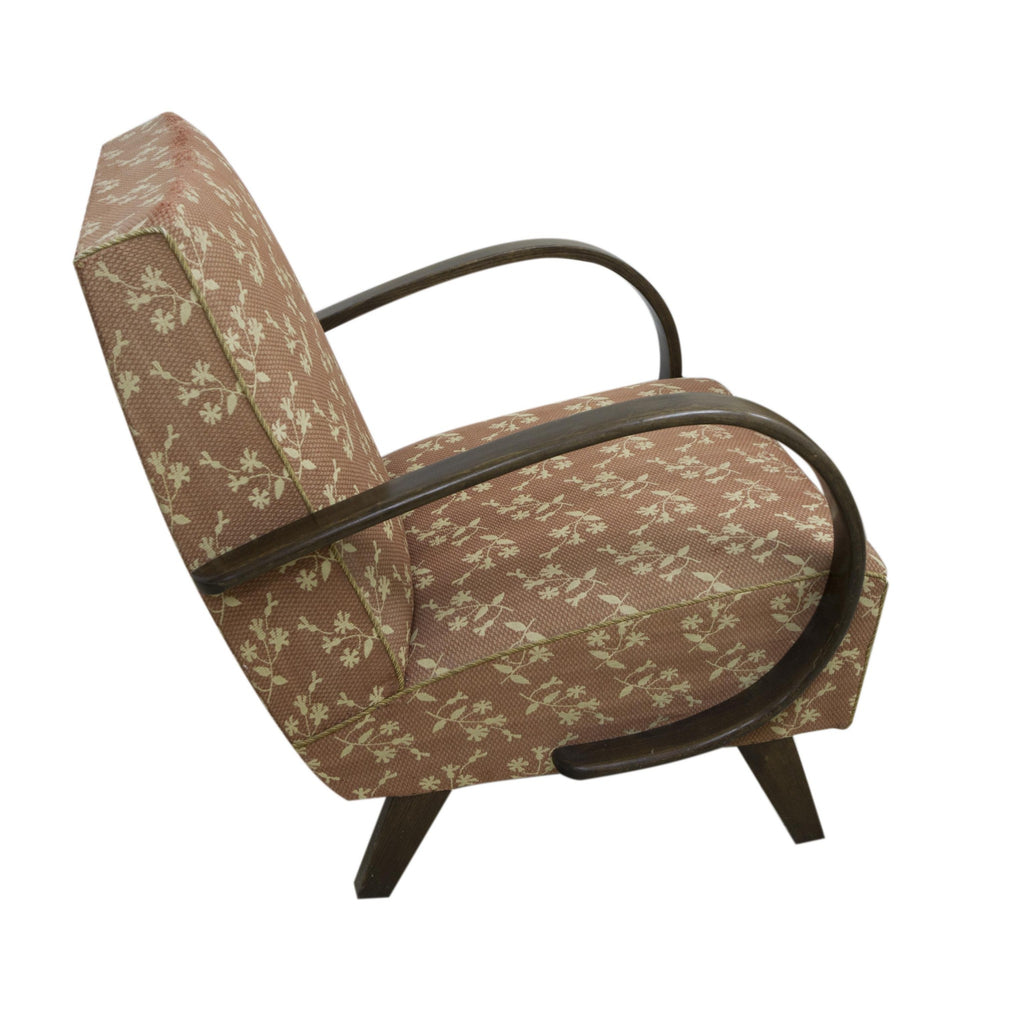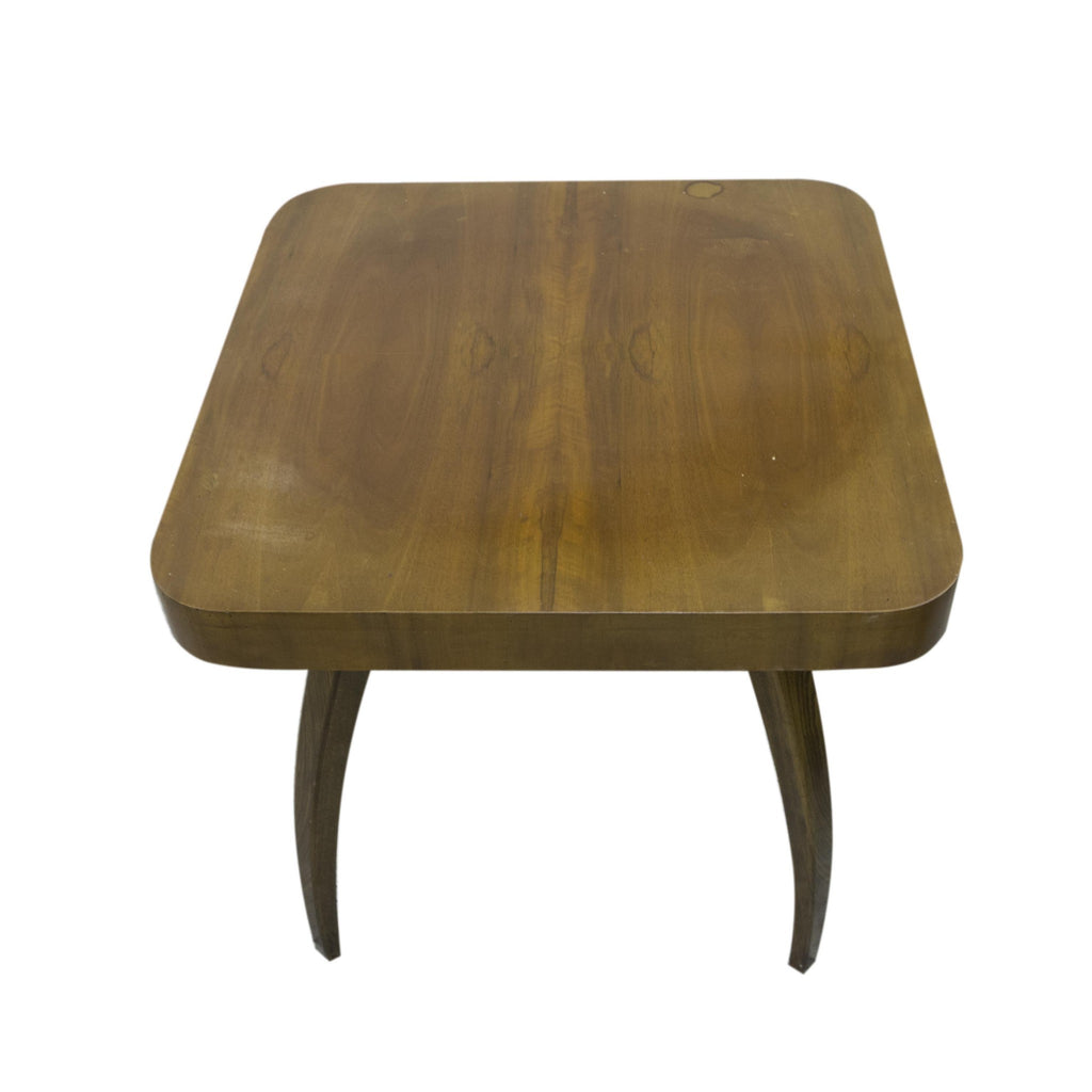 Modèle très réussi, conçu par l'un des plus grands designers européens d'avant-guerre. Fabriqué en bois massif et placage de noyer poli. La structure en bois et les chaises rembourrées sont en bon état. Seul le haut du revêtement des fauteuils présente quelques dommages d'usage. Dimensions de la chaise : hauteur 82 cm, assise 65 x 73 cm. Table également disponible : dimensions : 65 x 65 x 65 cm.