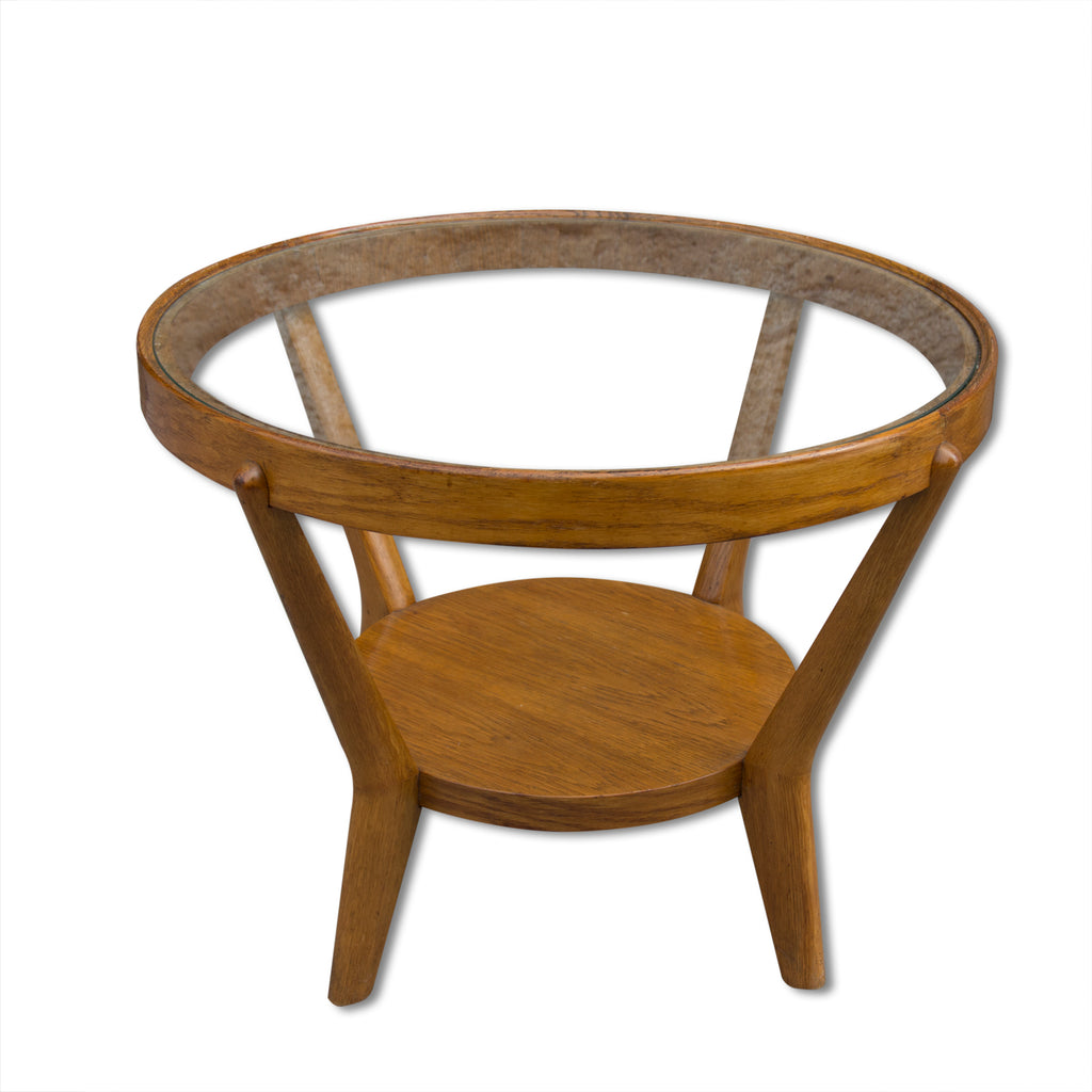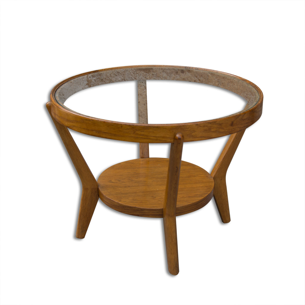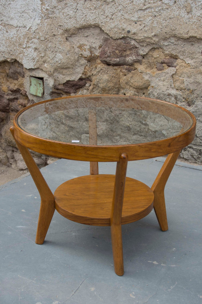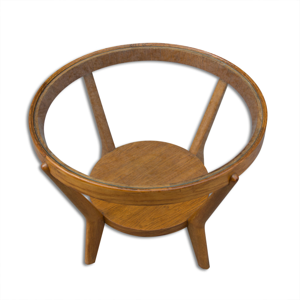 Table ronde vitrée conçue par les célèbres architectes Kropacek & Kozelka en 1944. Fabriquée en ex-Tchécoslovaquie, elle a reçu la médaille d'argent à la Triennale de Milan en 1946. Elle peut servir de table basse ou d'appoint. Elle est en chêne massif clair. En très bon état vintage.