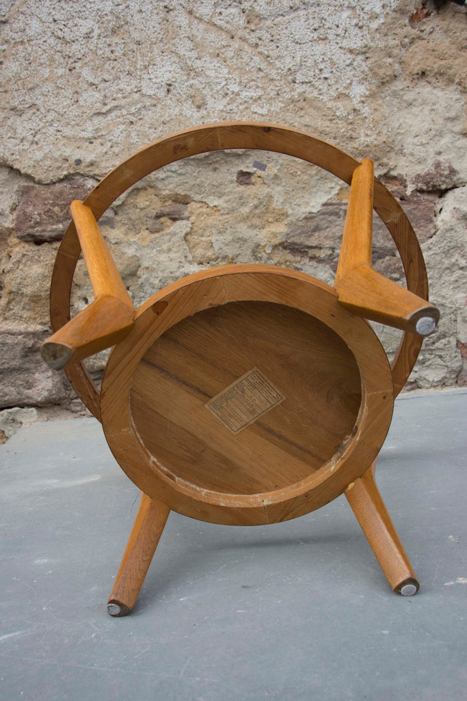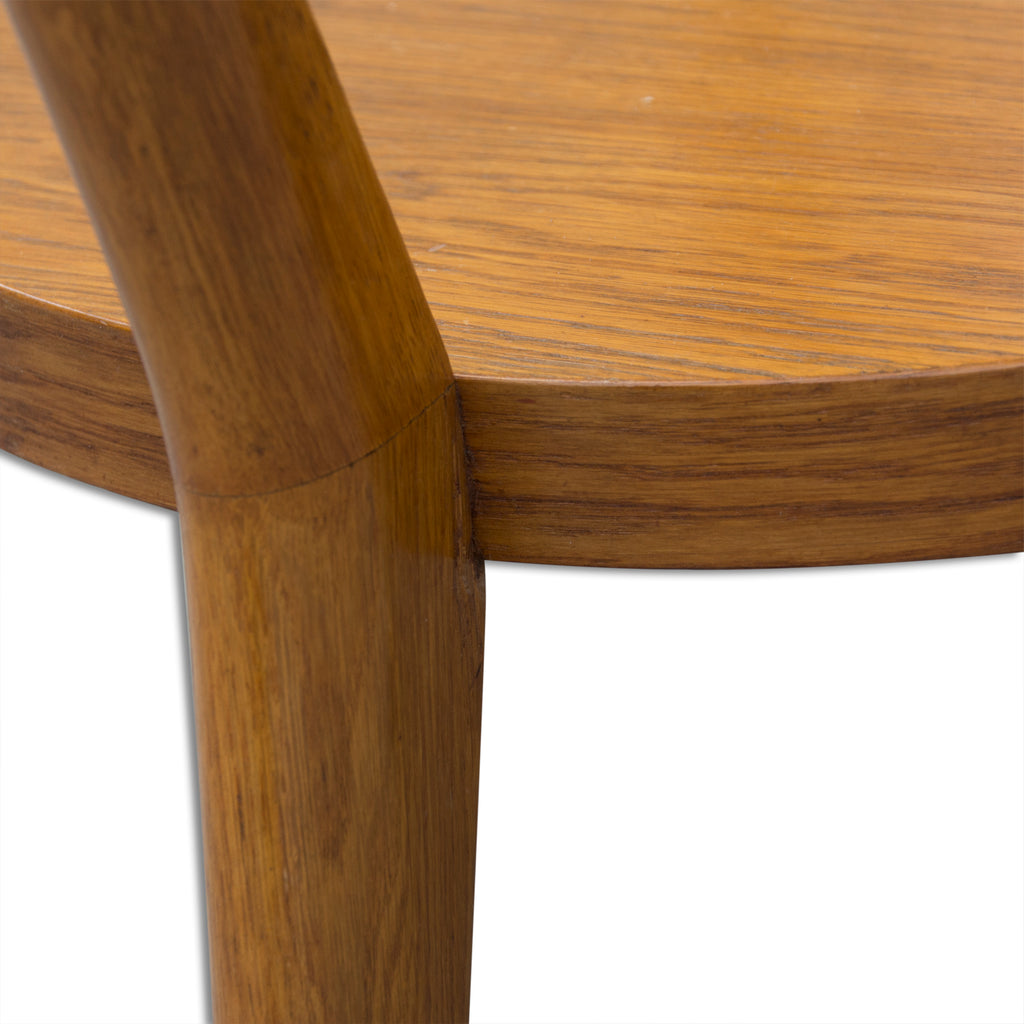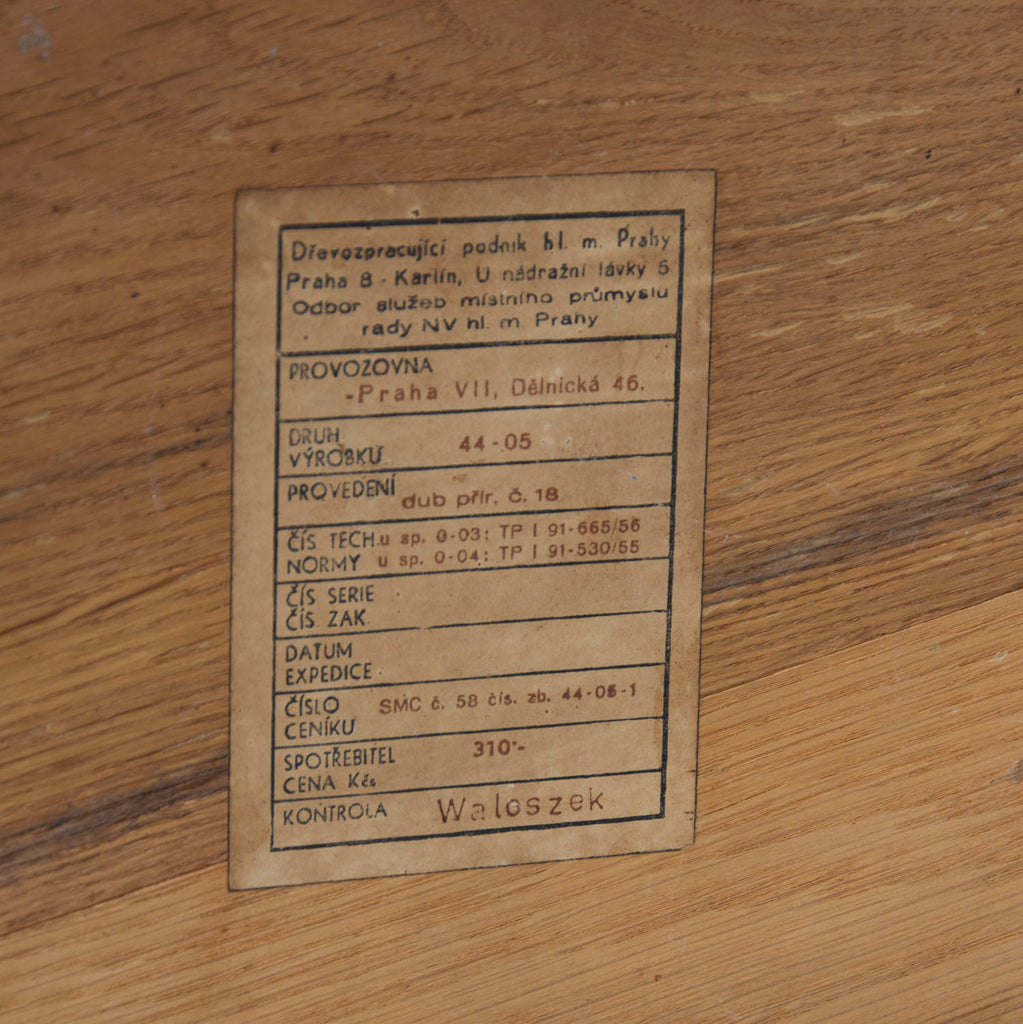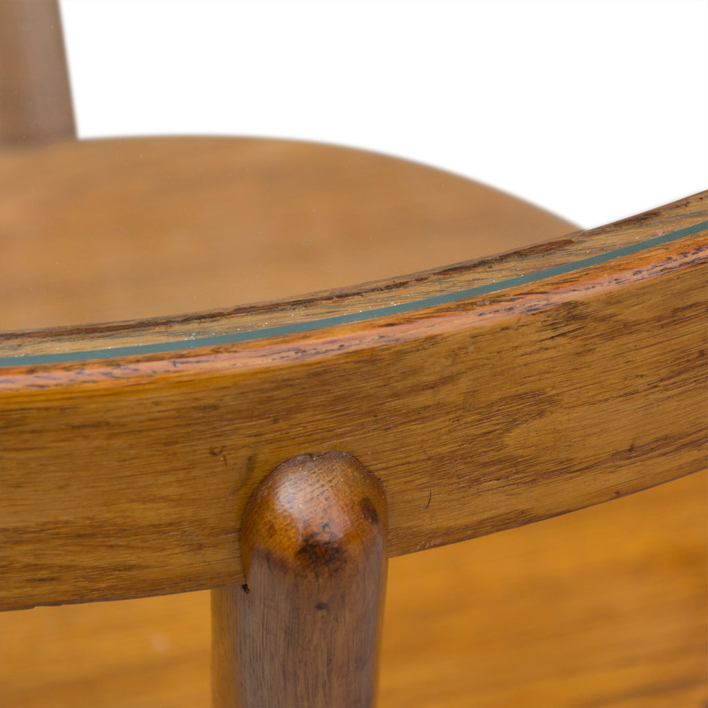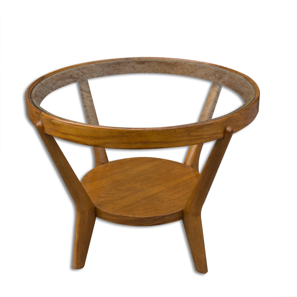 Table ronde vitrée conçue par les célèbres architectes Kropacek & Kozelka en 1944. Fabriquée en ex-Tchécoslovaquie, elle a reçu la médaille d'argent à la Triennale de Milan en 1946. Elle peut servir de table basse ou d'appoint. Elle est en chêne massif clair. En très bon état vintage.