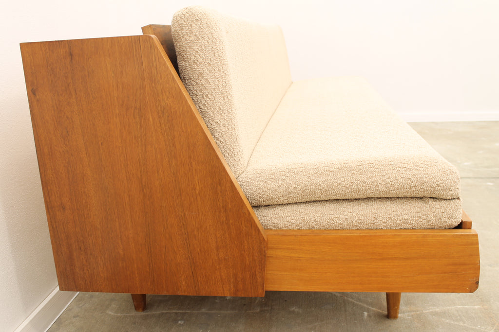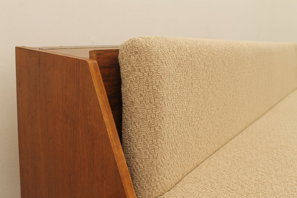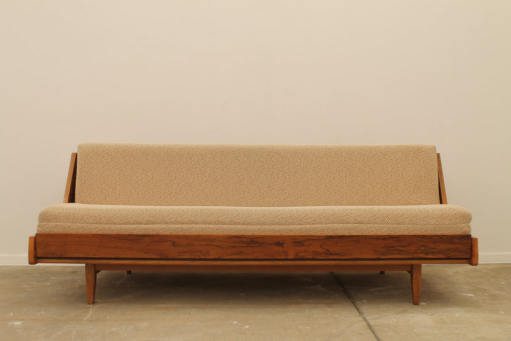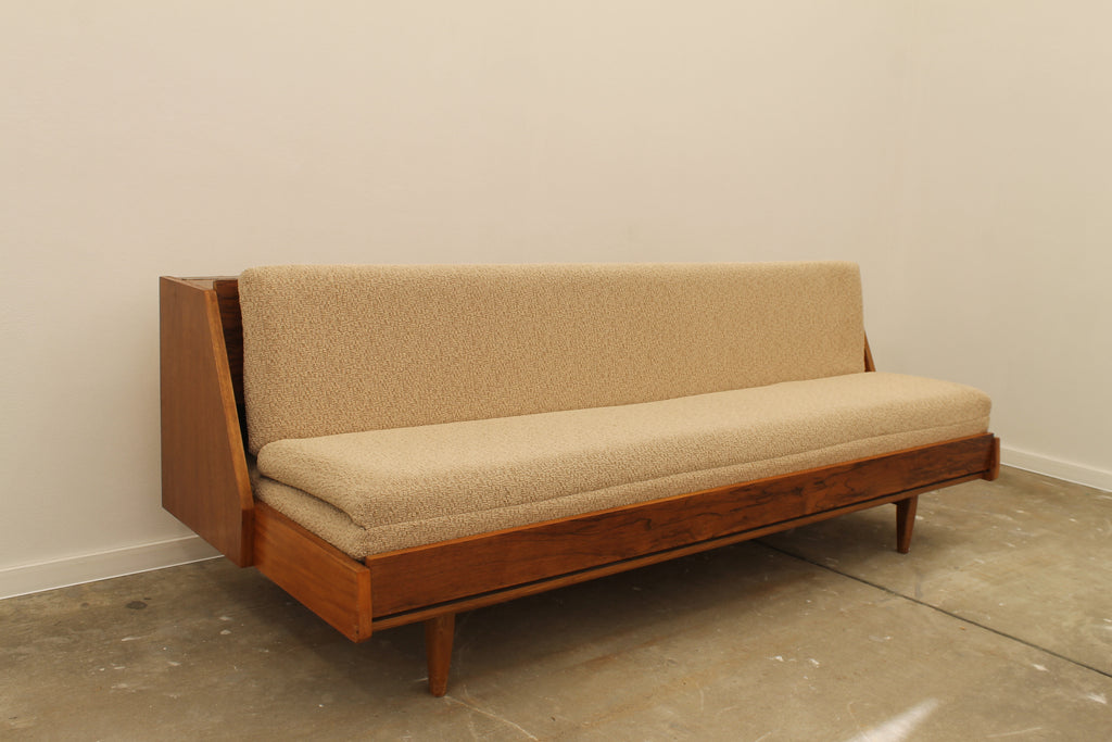 Canapé-lit du milieu du siècle, fabriqué dans l'ancienne Tchécoslovaquie dans les années 1970. Le canapé a une structure en bois avec placage en noyer, il est en très bon état, présente de légers signes de vieillissement et d'utilisation.
