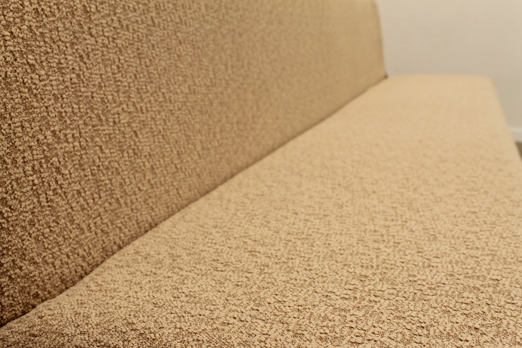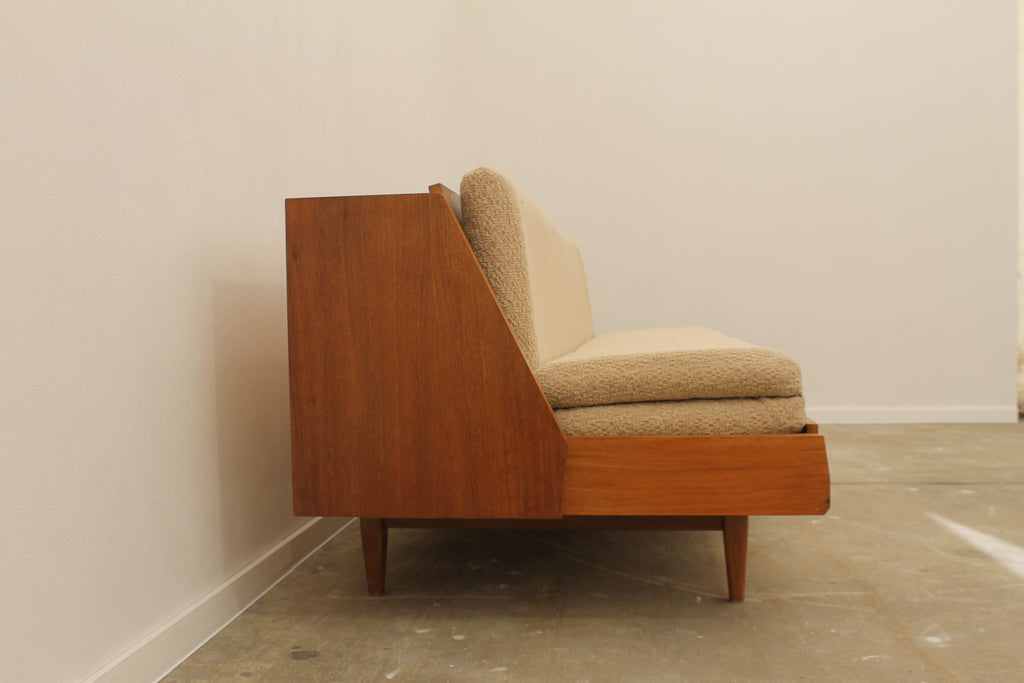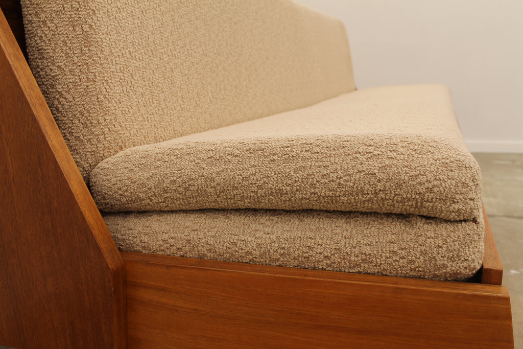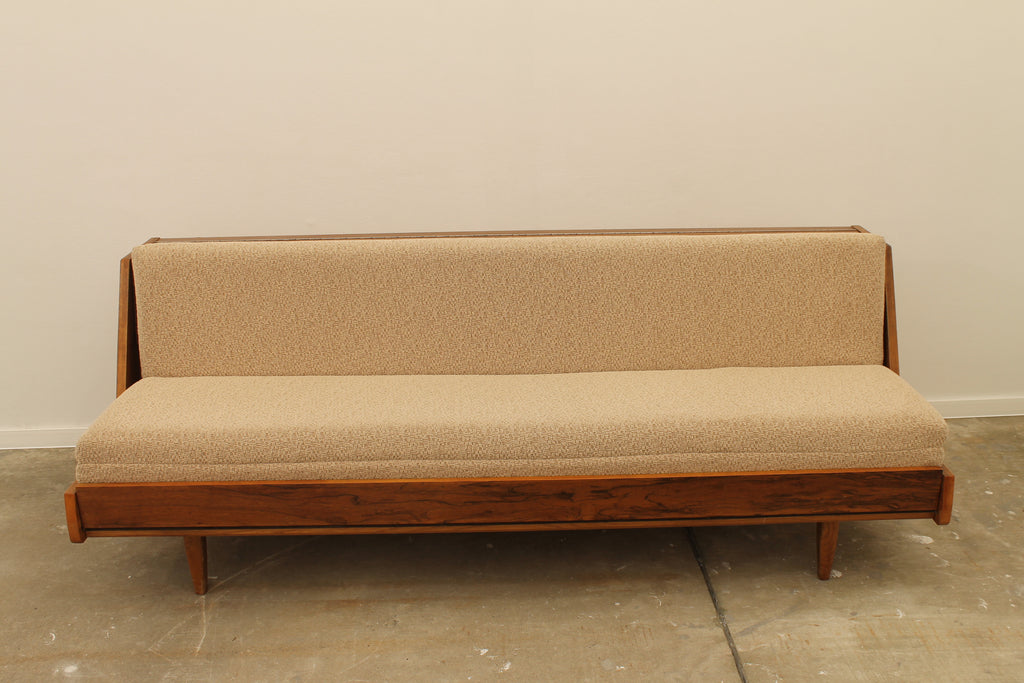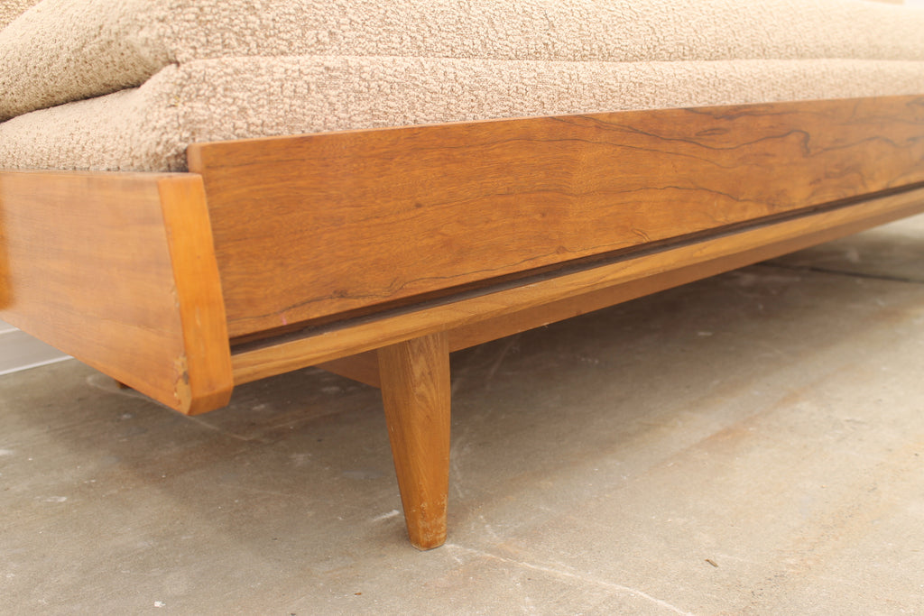 Canapé-lit du milieu du siècle, fabriqué dans l'ancienne Tchécoslovaquie dans les années 1970. Le canapé a une structure en bois avec placage en noyer, il est en très bon état, présente de légers signes de vieillissement et d'utilisation.