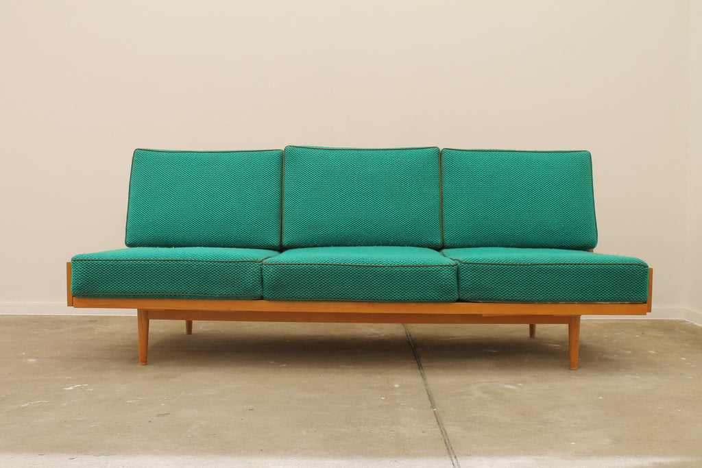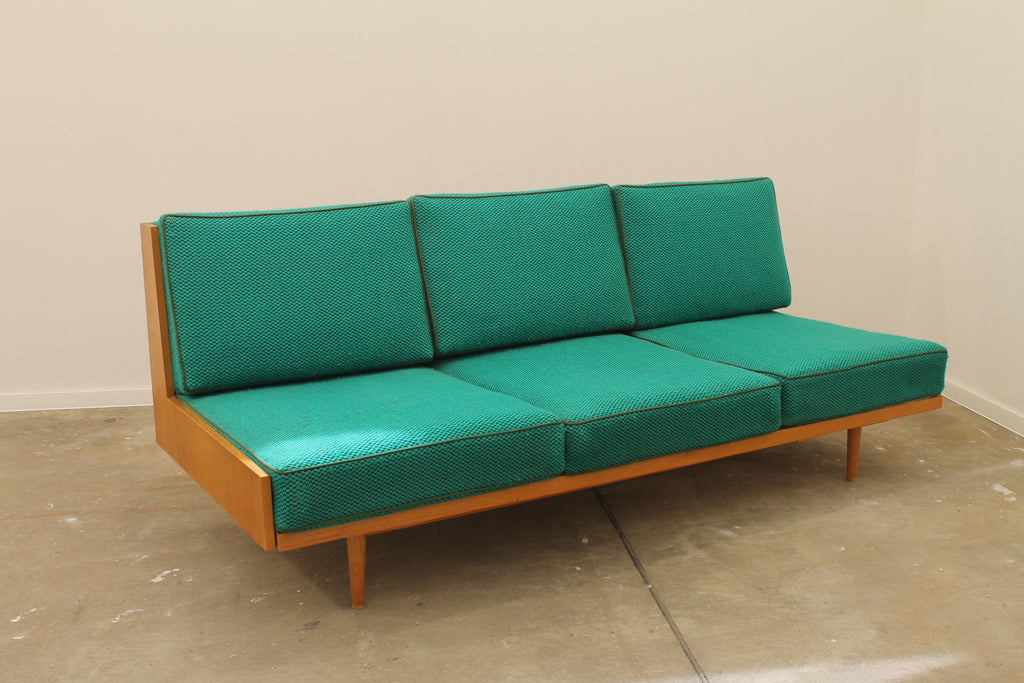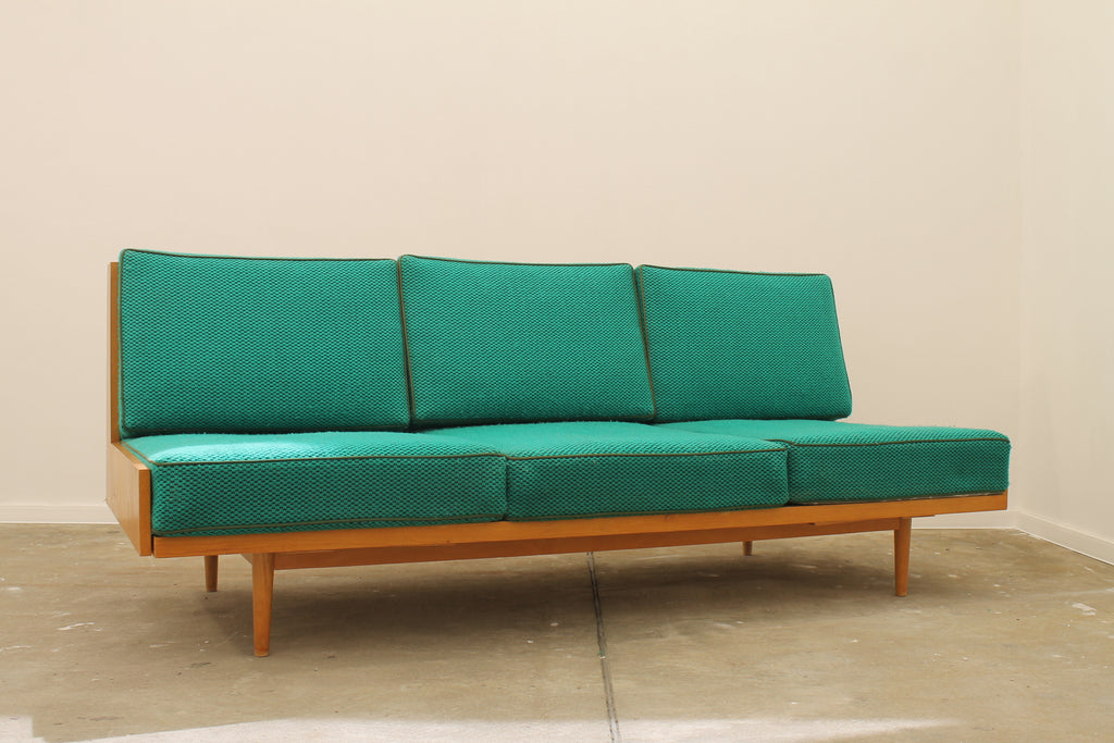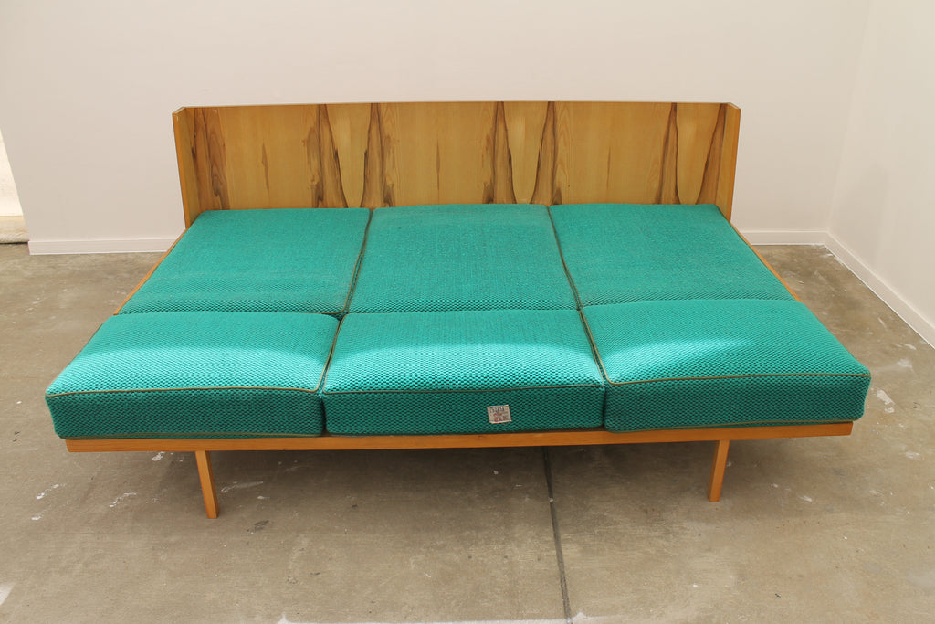 Canapé-lit du milieu du siècle, fabriqué dans l'ancienne Tchécoslovaquie dans les années 1970. Le canapé a une structure en bois de hêtre, il est en très bon état, présente de légers signes de vieillissement et d'utilisation.