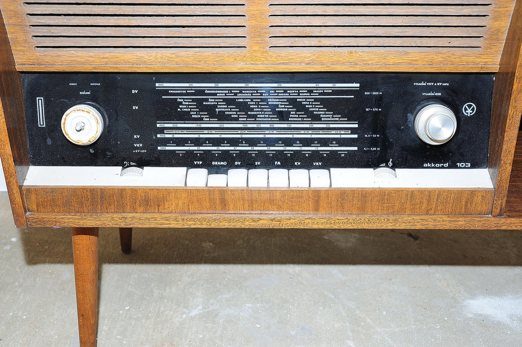 Meuble du milieu du siècle avec platine vinyle et radio intégrés, fabriqué dans l'ancienne Tchécoslovaquie dans les années 1950. La structure est en bois plaqué noyer. Le gramophone et la radio sont fonctionnels.