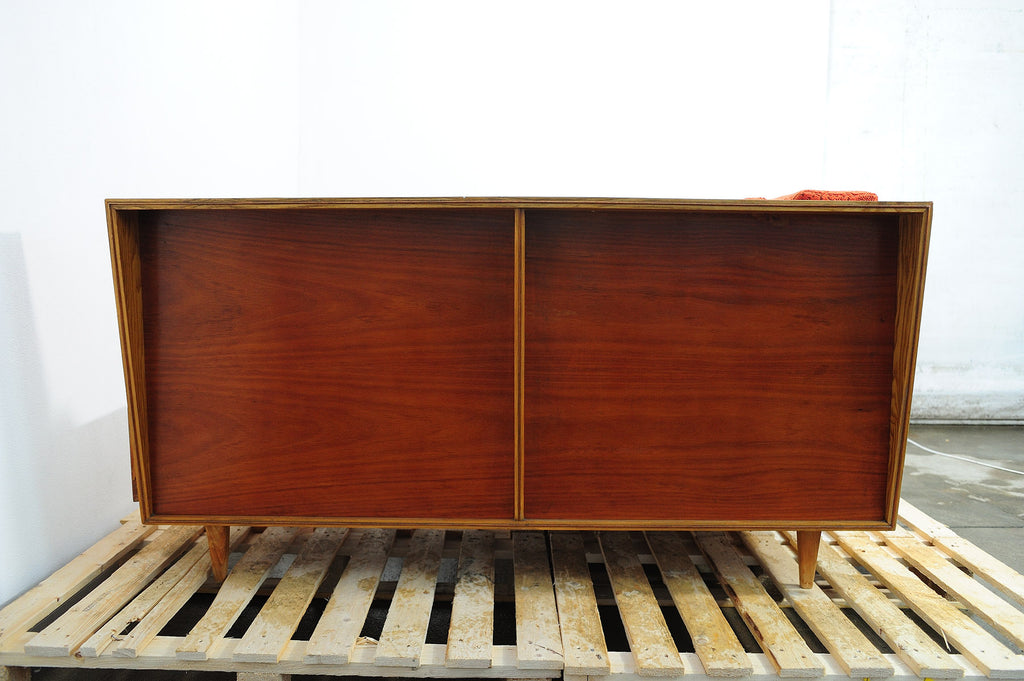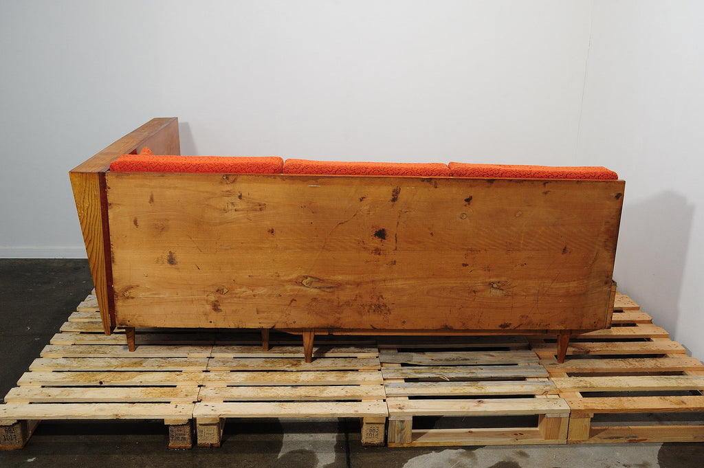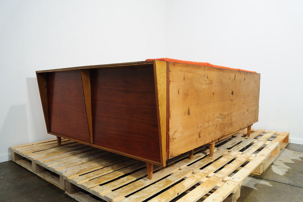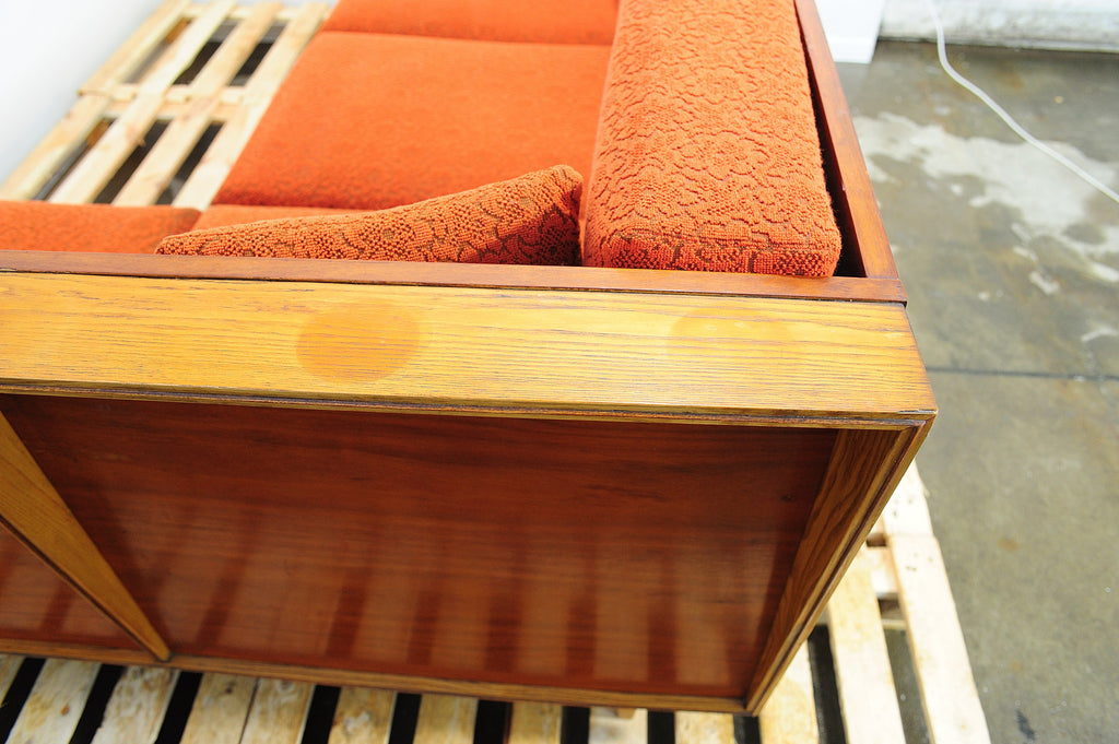 Ce canapé est doté d'une structure en bois plaqué noyer et d'un espace de rangement pour le couchage. Il est réglable en hauteur. Il est en bon état vintage et présente de légers signes d'usure.