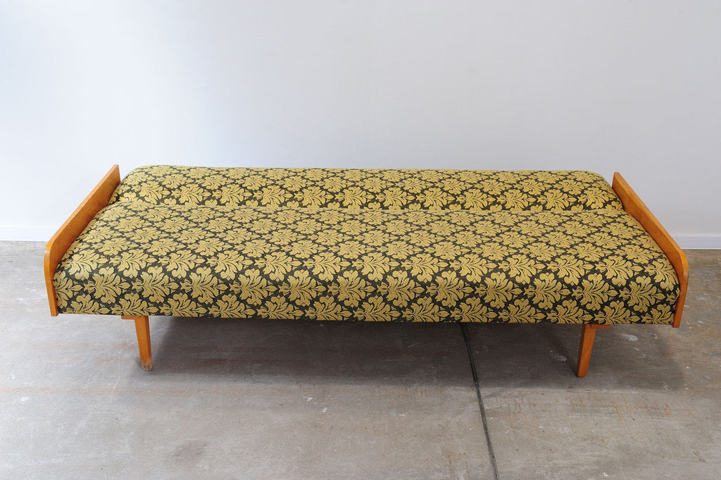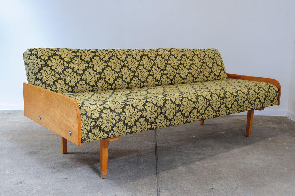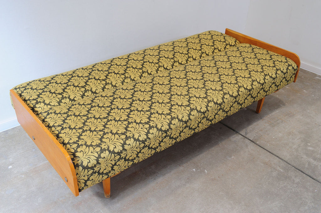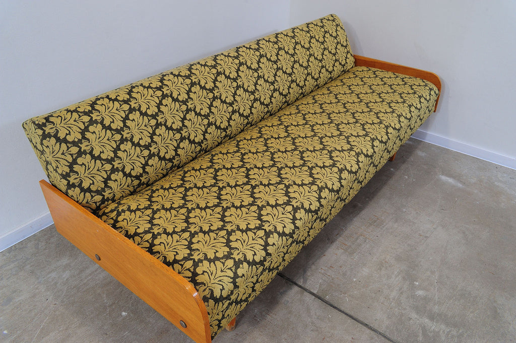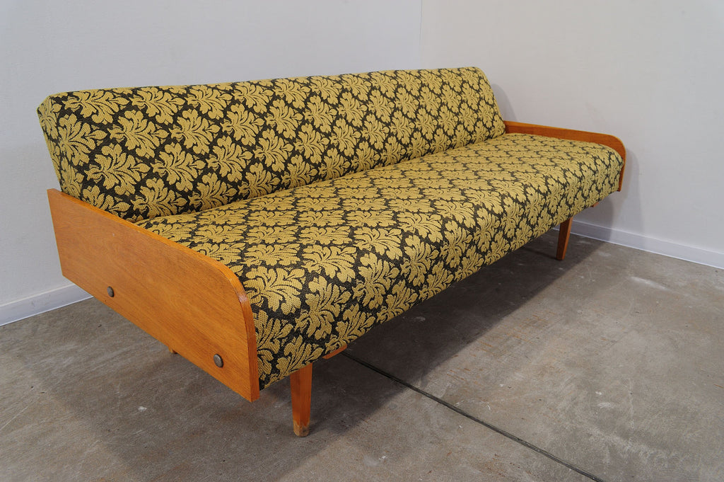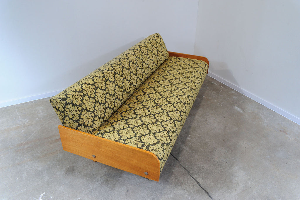 Canapé/canapé-lit du milieu du siècle, fabriqué dans l'ancienne Tchécoslovaquie dans les années 1960. Matériaux : bois de hêtre et tissu. Le canapé est en très bon état vintage.