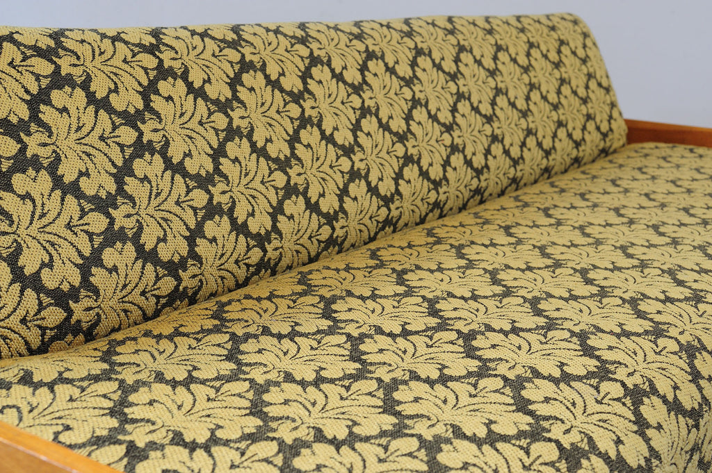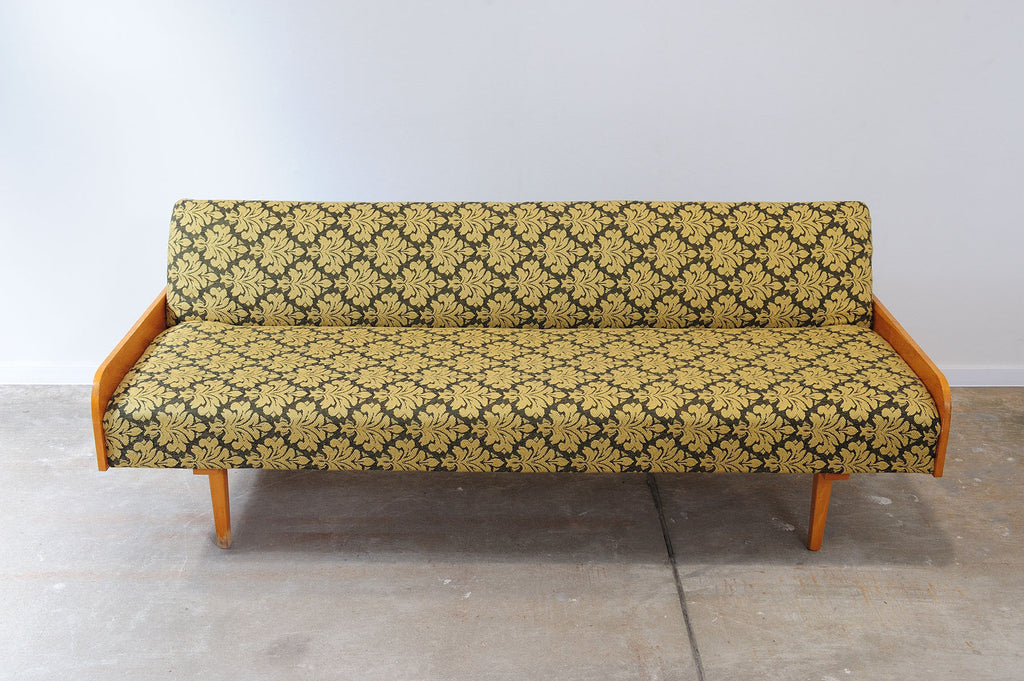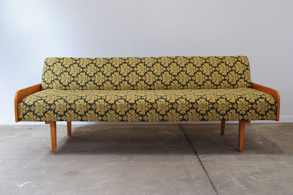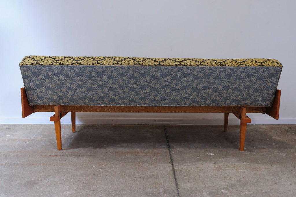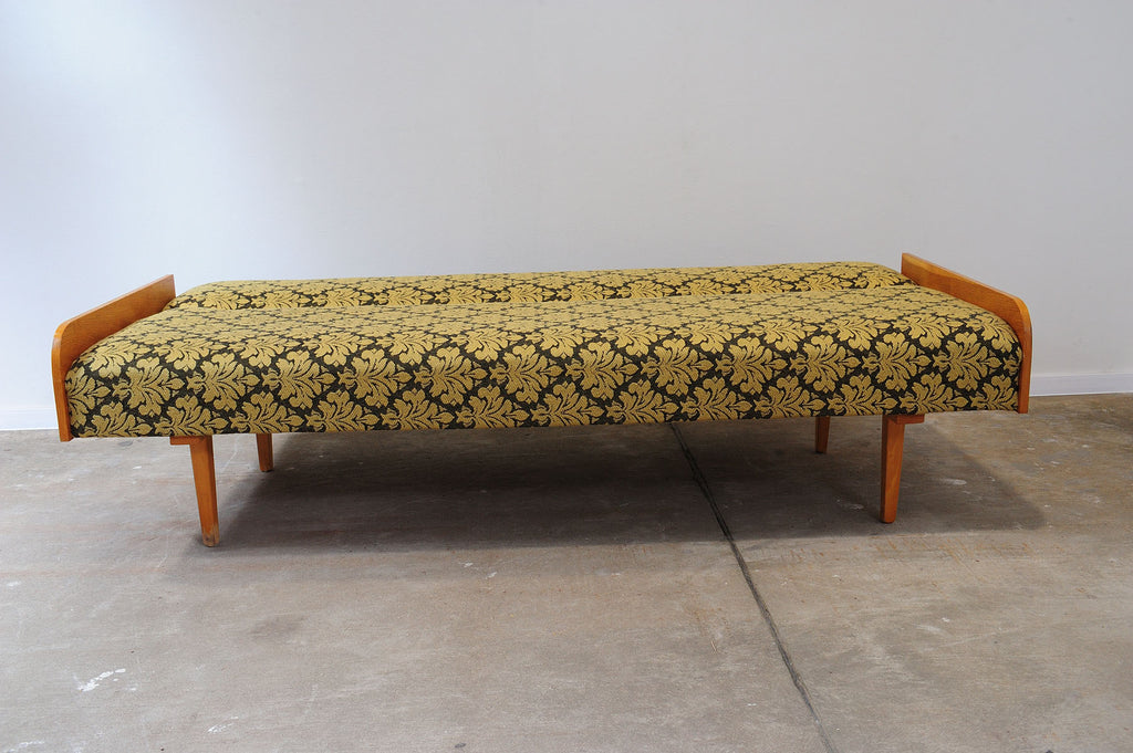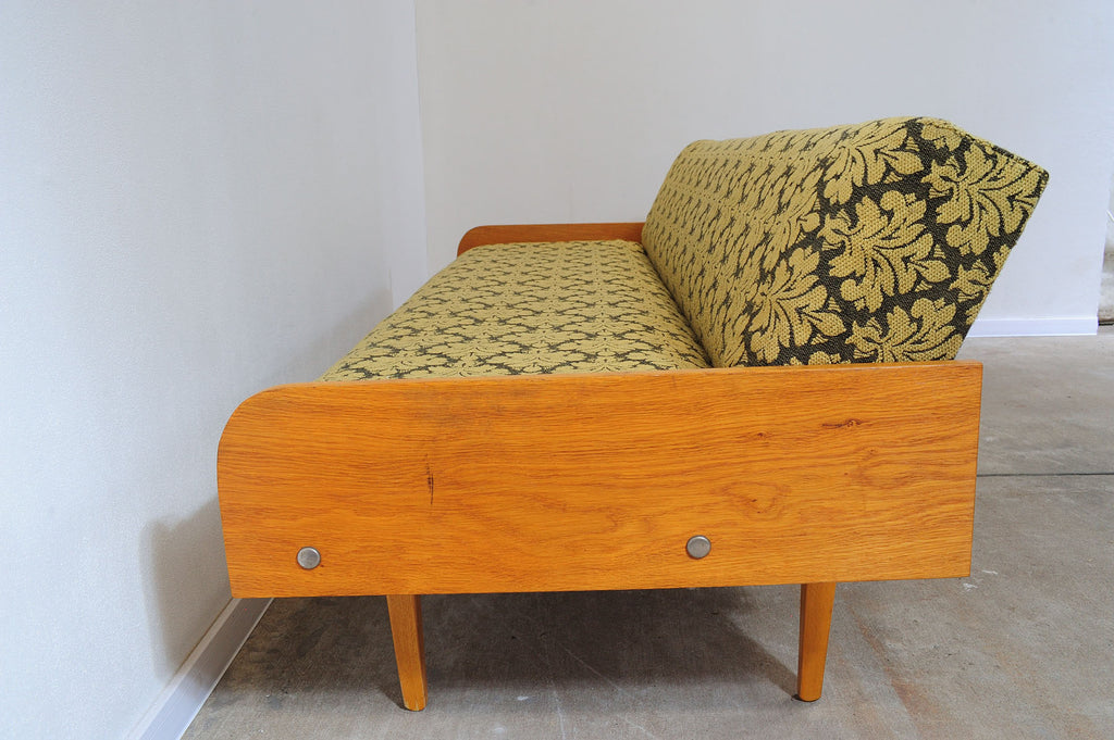 Canapé/canapé-lit du milieu du siècle, fabriqué dans l'ancienne Tchécoslovaquie dans les années 1960. Matériaux : bois de hêtre et tissu. Le canapé est en très bon état vintage.