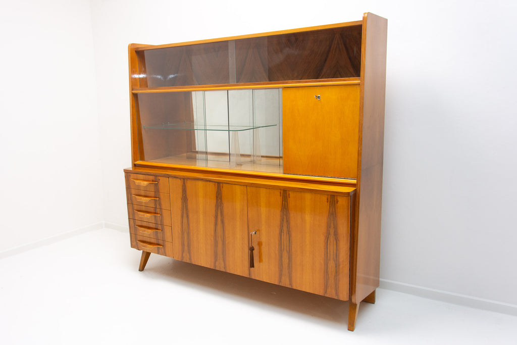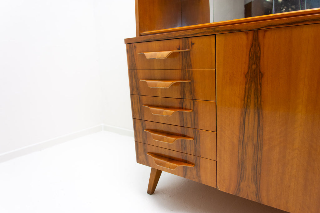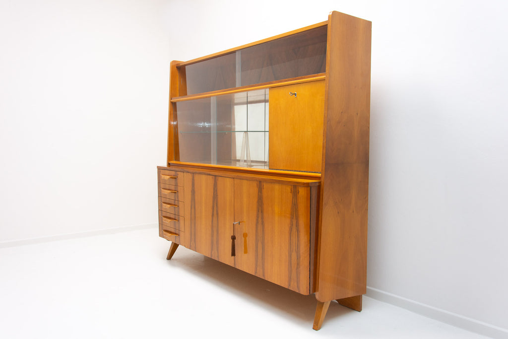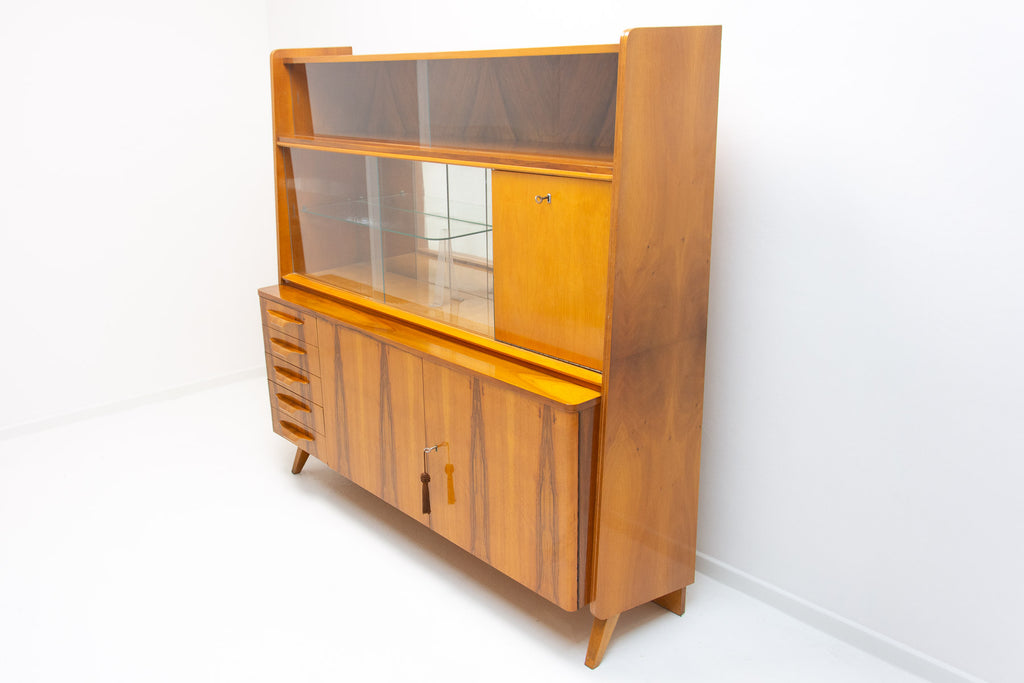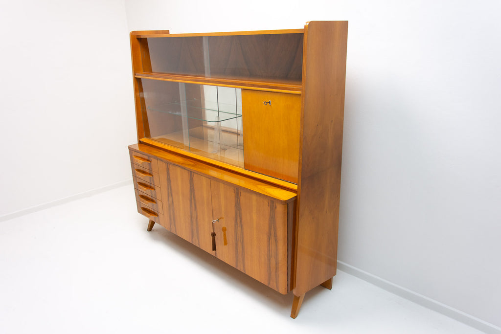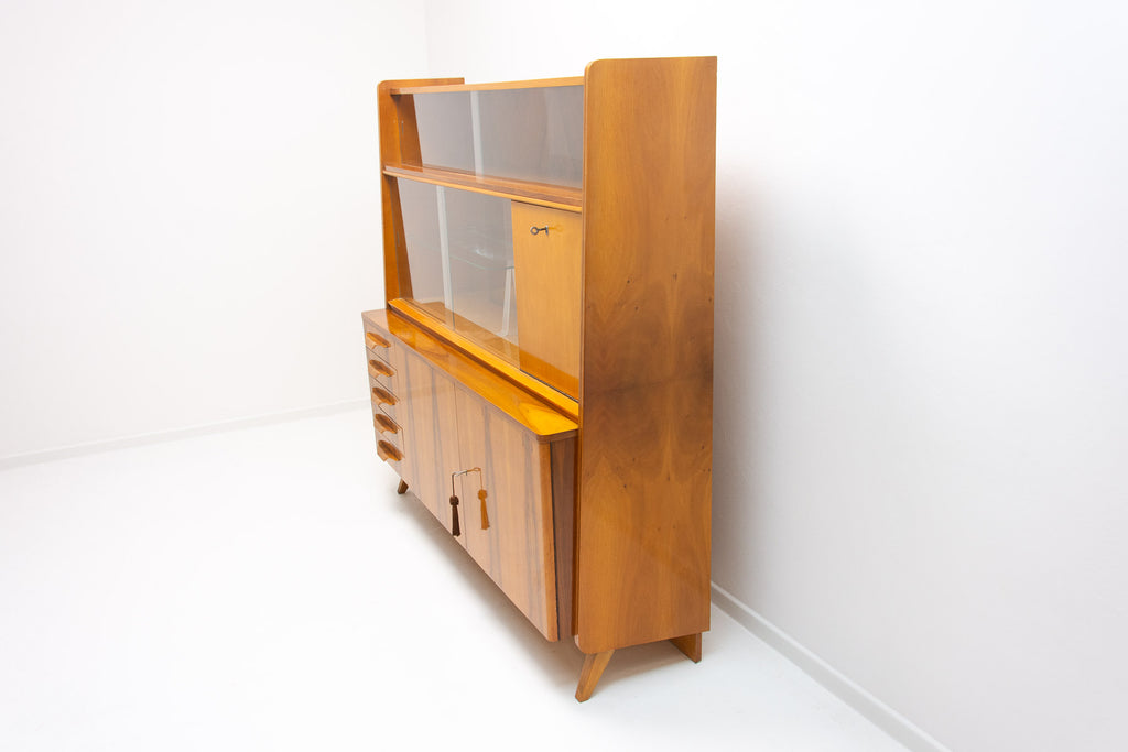 Crédence ou buffet vintage du milieu du siècle, datant des années 1960. Conçue par Frantisek Jirák et fabriquée par l'entreprise Tatra nábytok, en ex-Tchécoslovaquie. De conception simple, sa partie vitrée peut servir de bar, de bibliothèque, etc. En bon état, elle présente des signes d'usure. Placage en noyer.