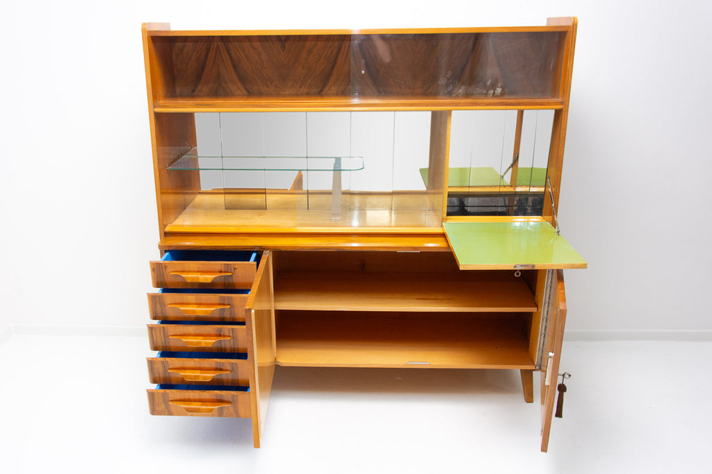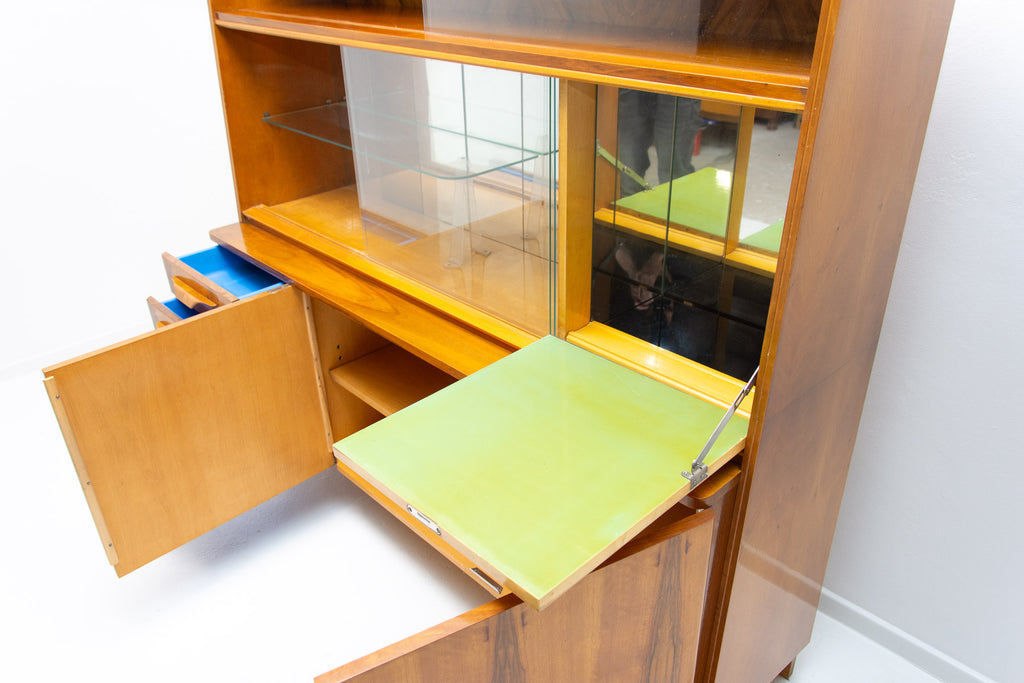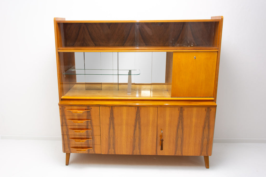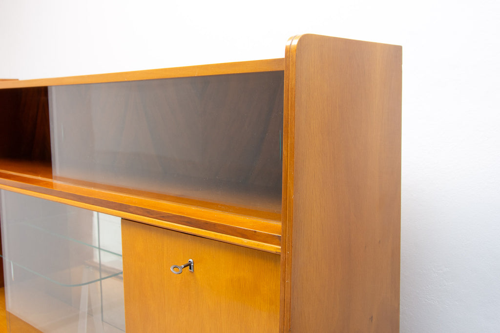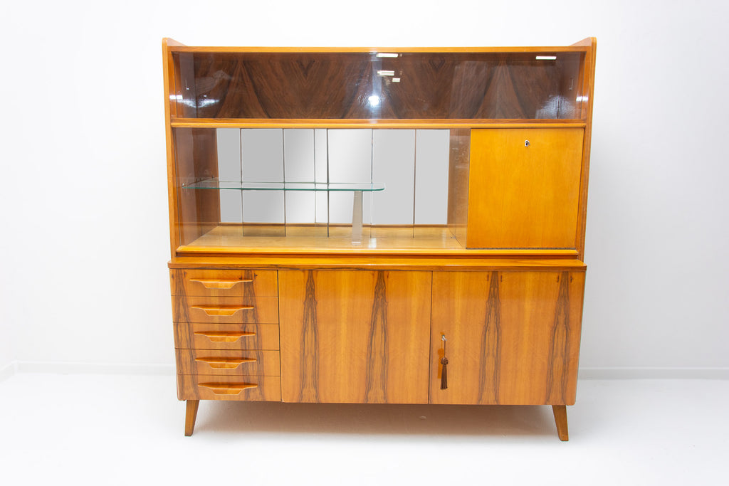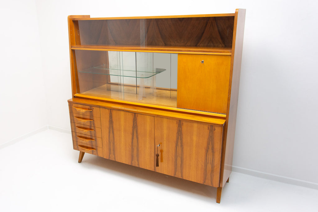Crédence ou buffet vintage du milieu du siècle, datant des années 1960. Conçue par Frantisek Jirák et fabriquée par l'entreprise Tatra nábytok, en ex-Tchécoslovaquie. De conception simple, sa partie vitrée peut servir de bar, de bibliothèque, etc. En bon état, elle présente des signes d'usure. Placage en noyer.