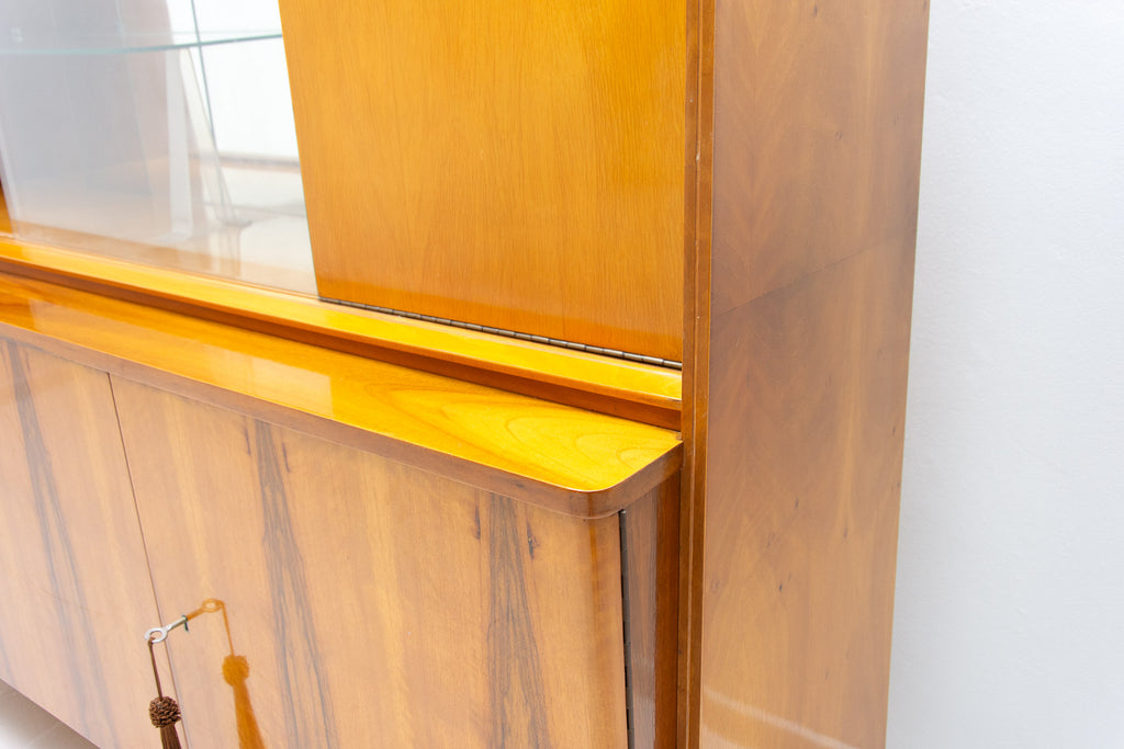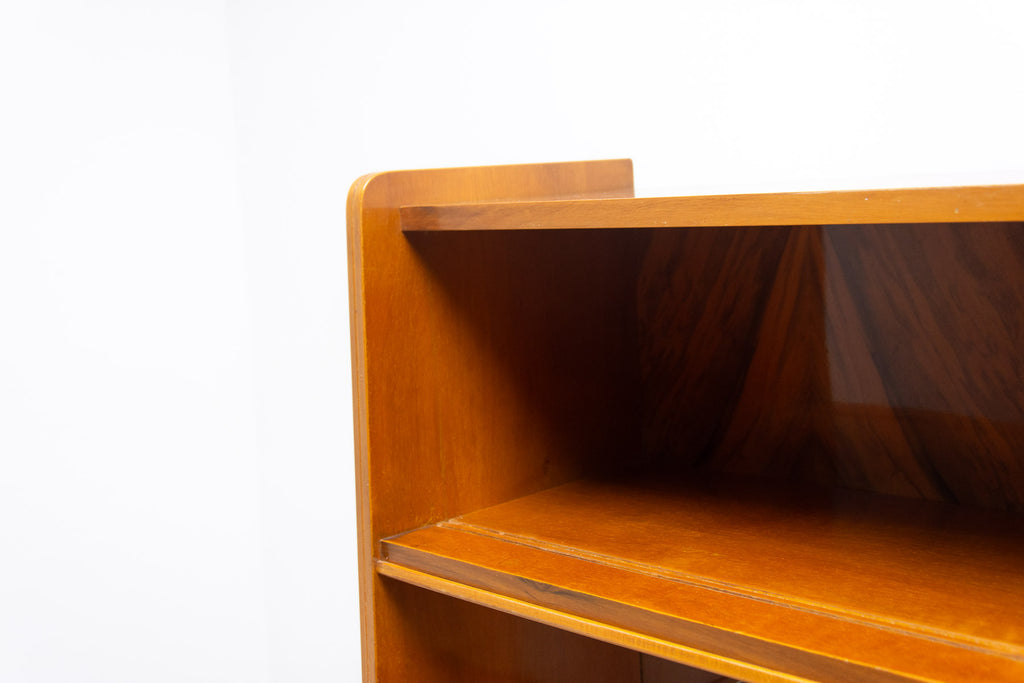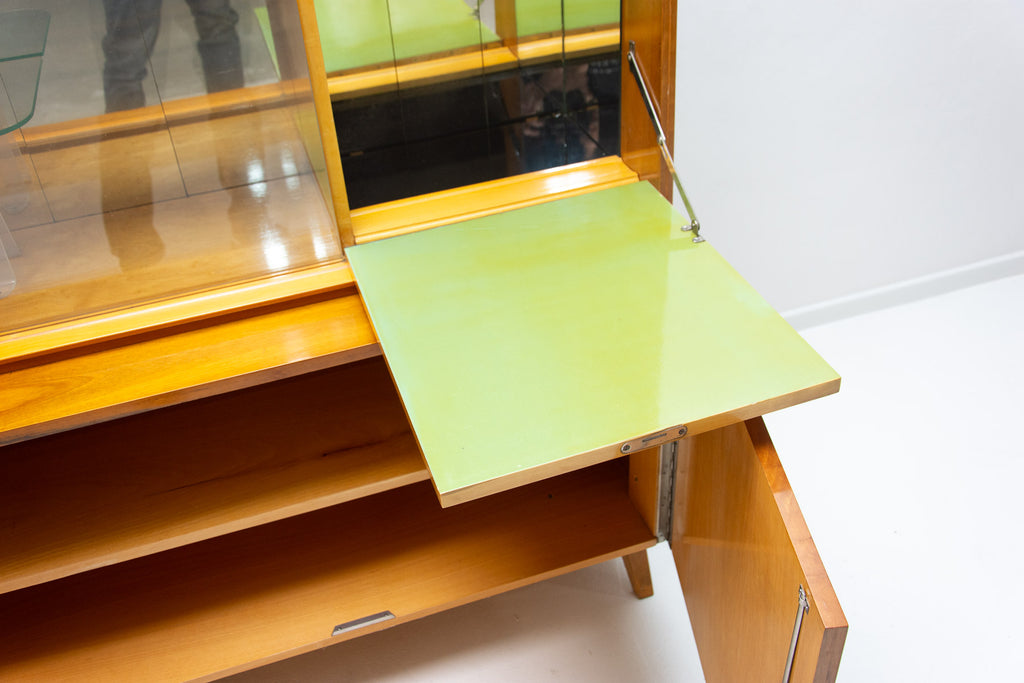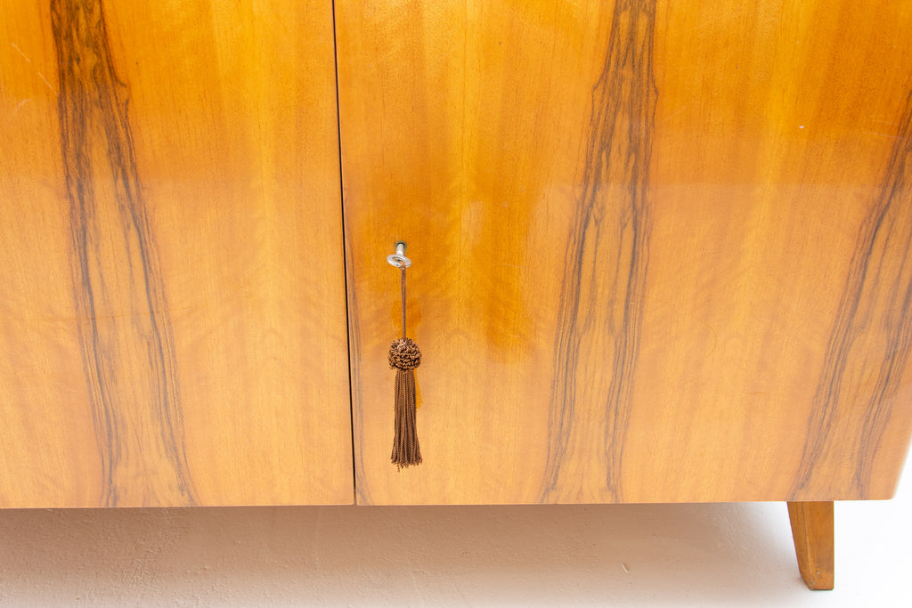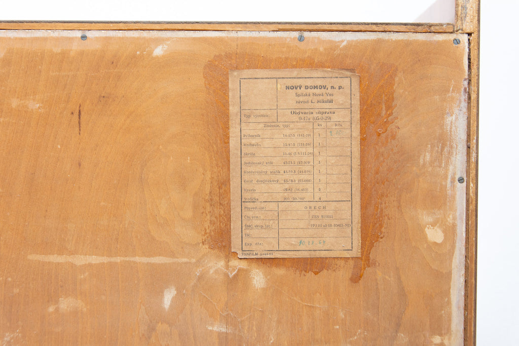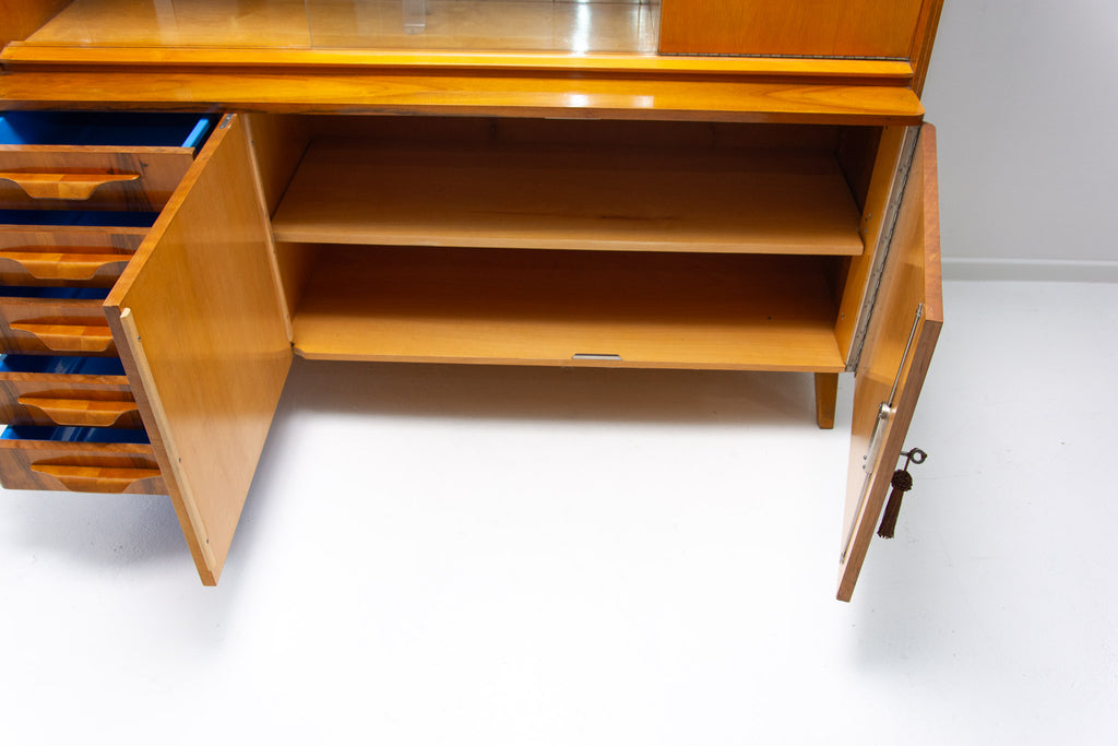 Crédence ou buffet vintage du milieu du siècle, datant des années 1960. Conçue par Frantisek Jirák et fabriquée par l'entreprise Tatra nábytok, en ex-Tchécoslovaquie. De conception simple, sa partie vitrée peut servir de bar, de bibliothèque, etc. En bon état, elle présente des signes d'usure. Placage en noyer.