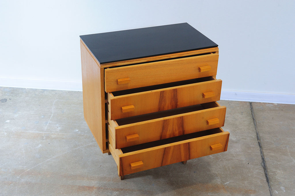 Elles peuvent également servir de petite commode. Elles sont dotées d'une vitre noire en haut, d'un tiroir et d'un espace de rangement en bas. Placage en frêne. Design simple et original. Cet article est en très bon état vintage, présentant de légers signes d'usure.