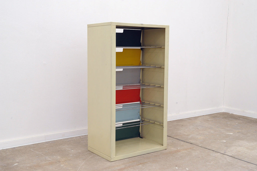 Étagère à chaussures en tôle du milieu du siècle, style bloc de l'Est, six étagères coulissantes, avec des tiges en fer pour les chaussures à l'intérieur. En bon état vintage, présentant de légères traces d'usure. Fabriquée en Tchécoslovaquie dans les années 1960.