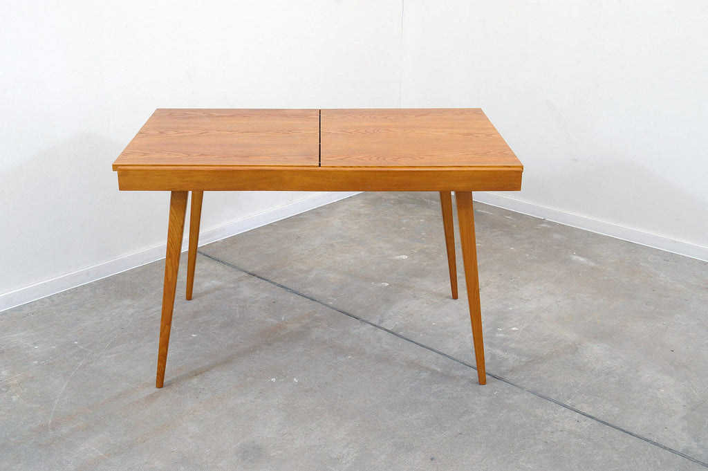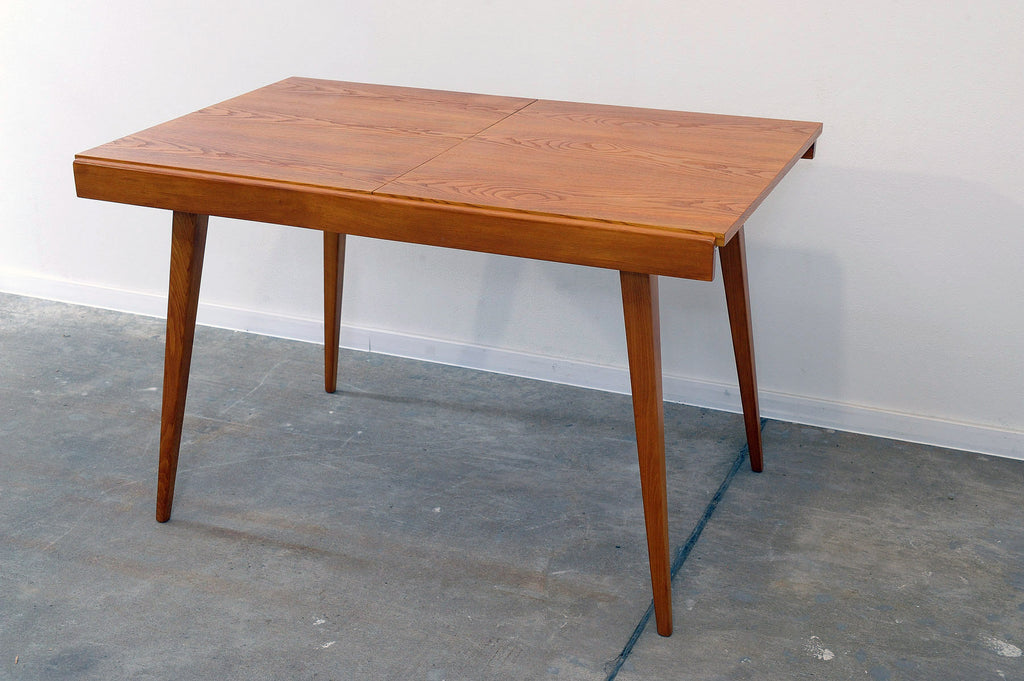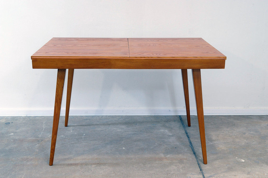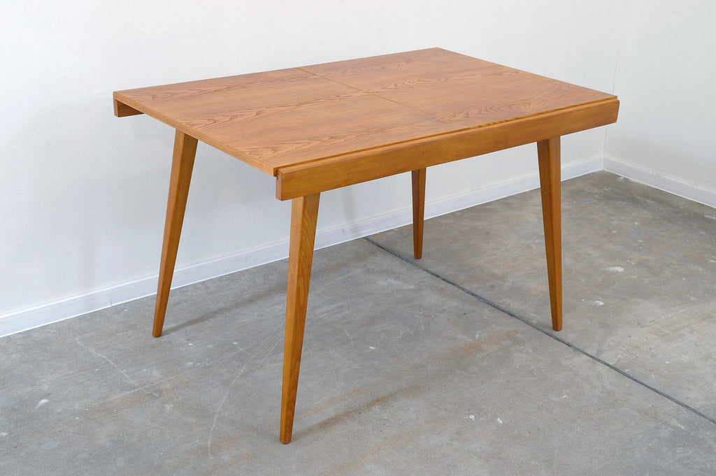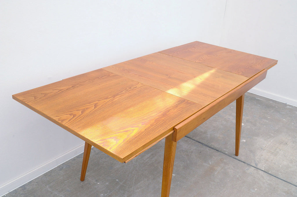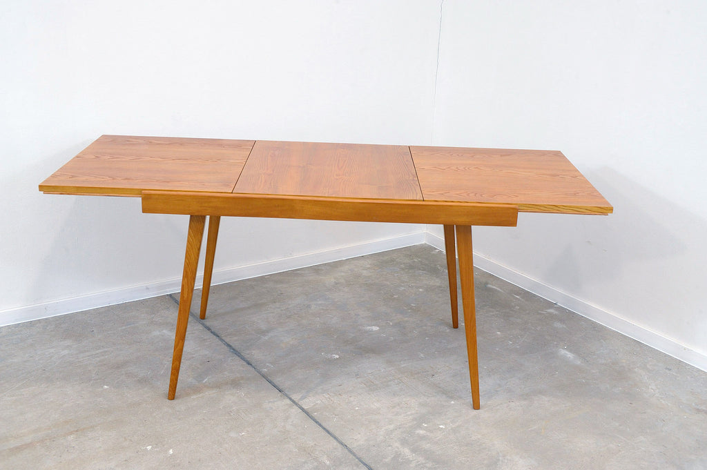 Cette table à manger réglable du milieu du siècle a été conçue par Frantisek Jirák pour Tatra nábytok et fabriquée dans l'ancienne Tchécoslovaquie dans les années 1970. Elle est en frêne et en hêtre. Sa longueur est réglable de 120 cm à 180 cm. Entièrement rénovée, elle est en excellent état.