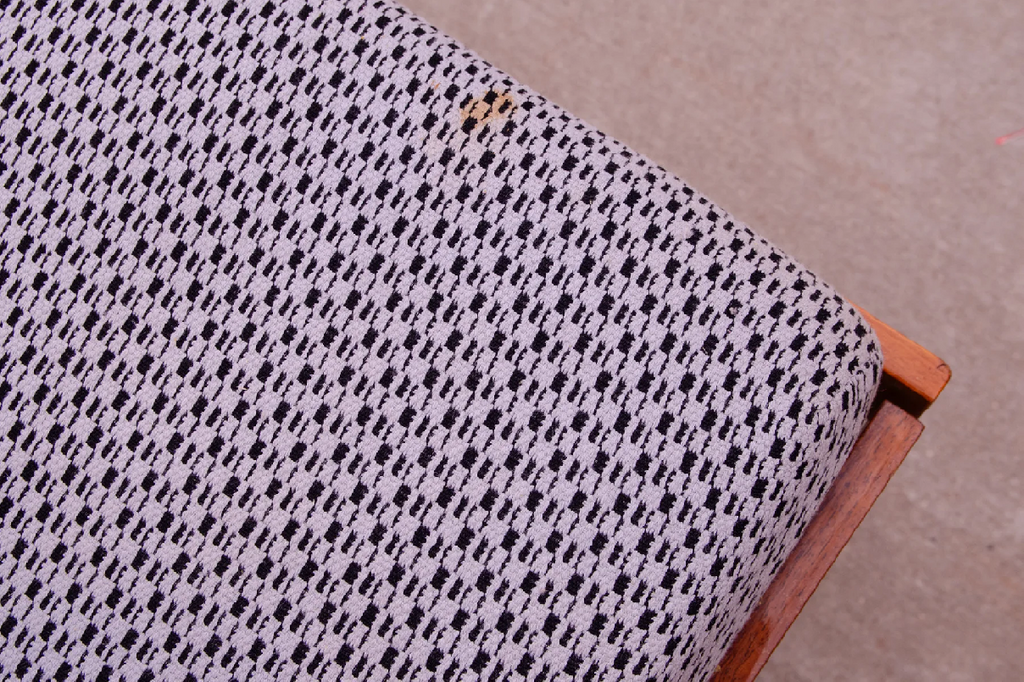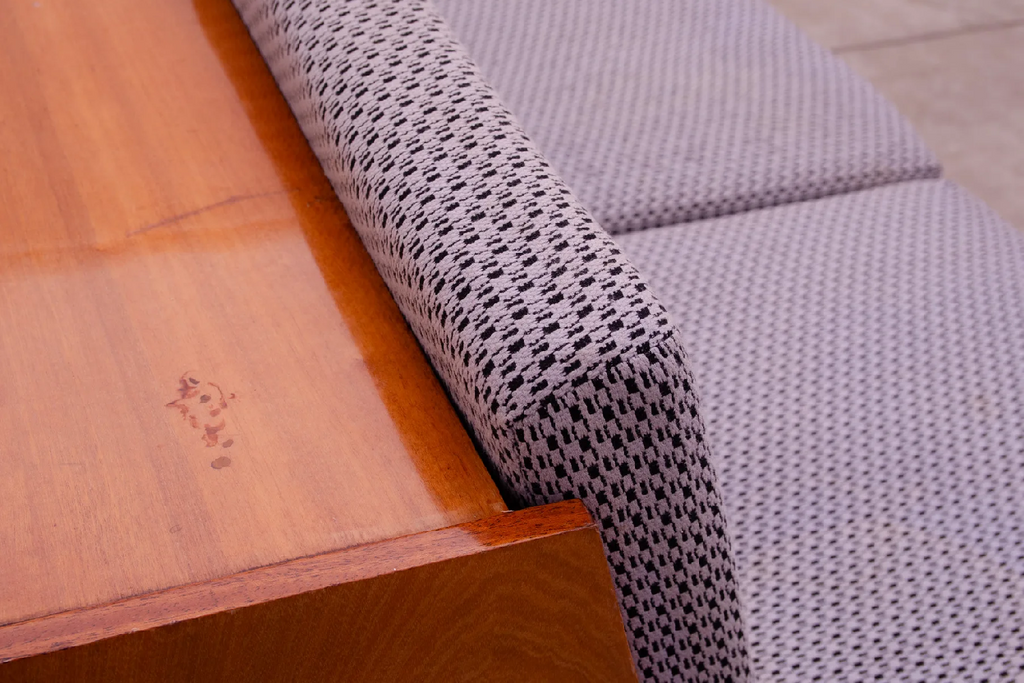 Le canapé est structurellement en bon état, le tissu présente des signes visibles d'usure. Le bois est en bon état (quelques rayures sur le placage).