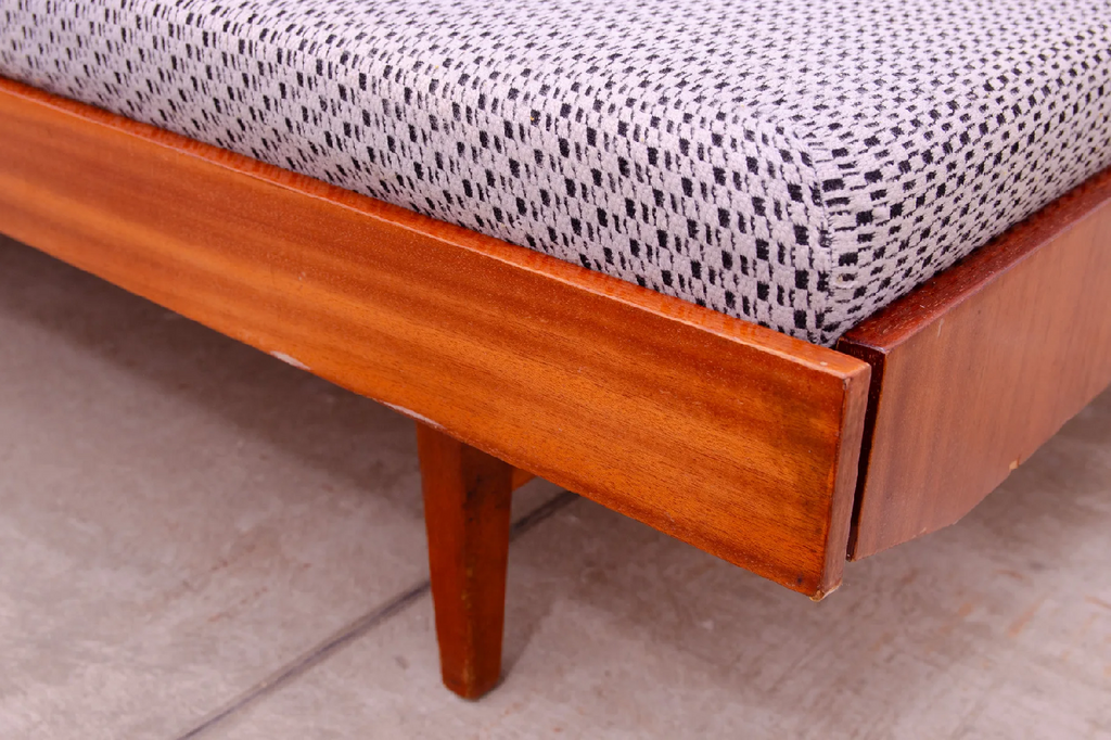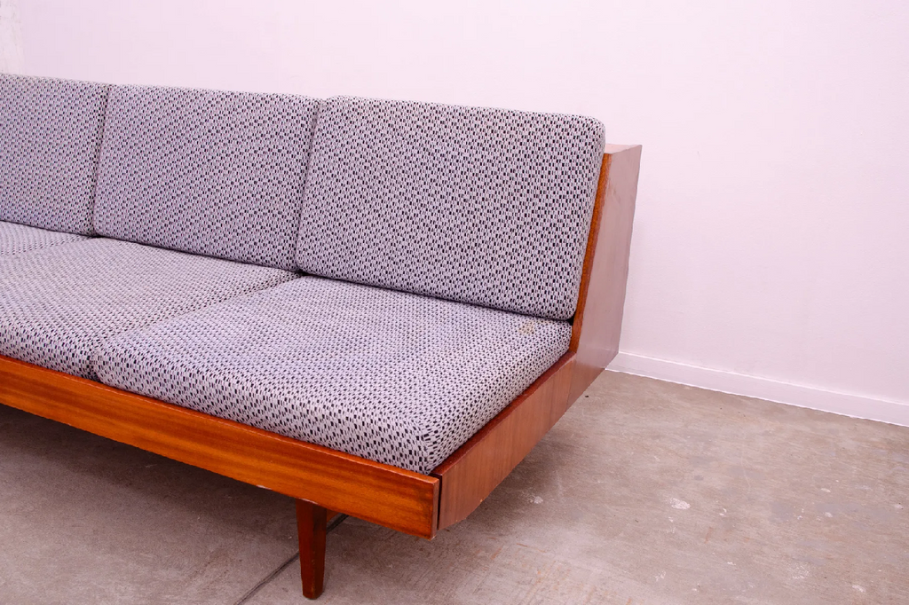 Ce canapé-lit a été fabriqué par la société Nový Domov dans l'ancienne Tchécoslovaquie dans les années 1970. Le canapé a une structure en bois avec placage en noyer et quatre matelas en mousse et en tissu.