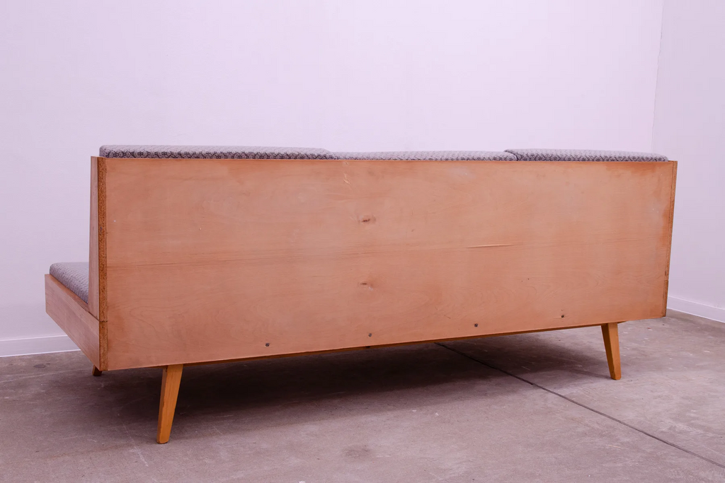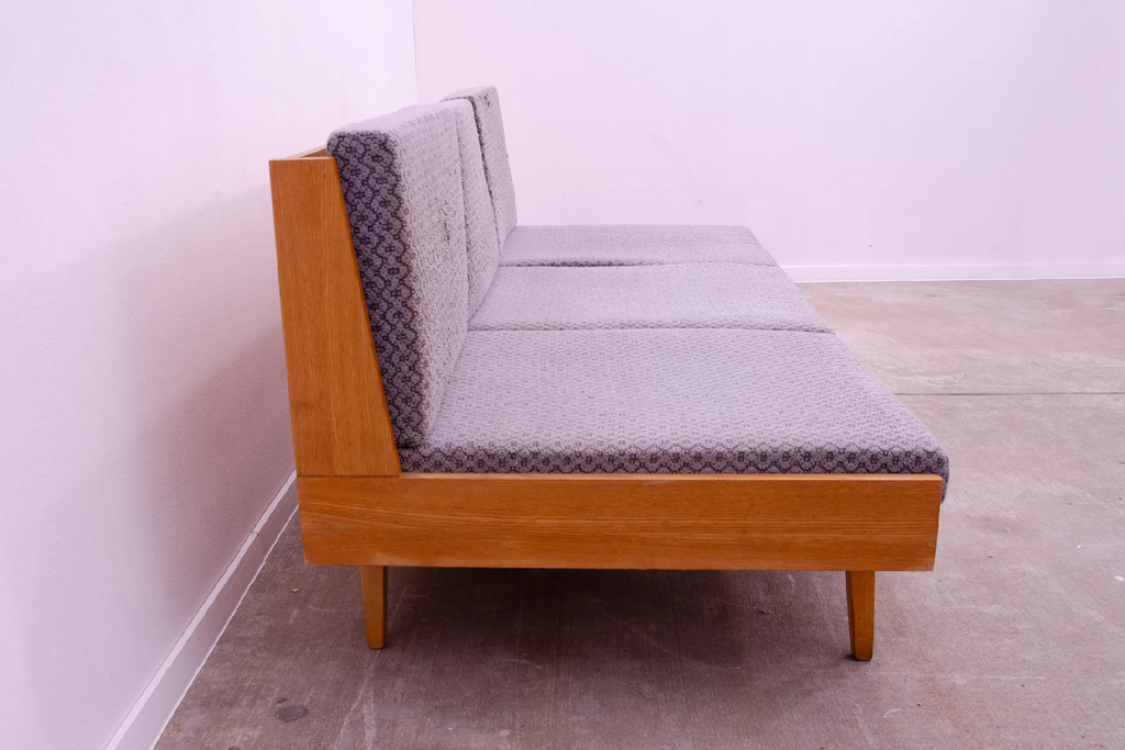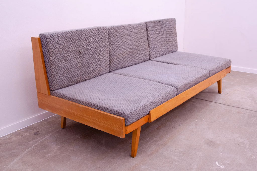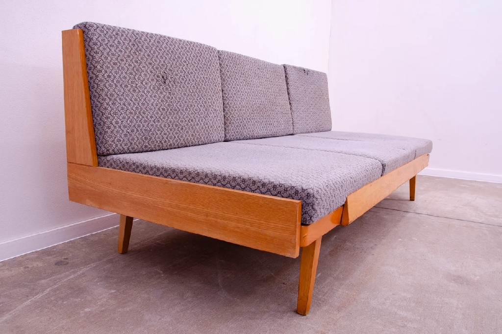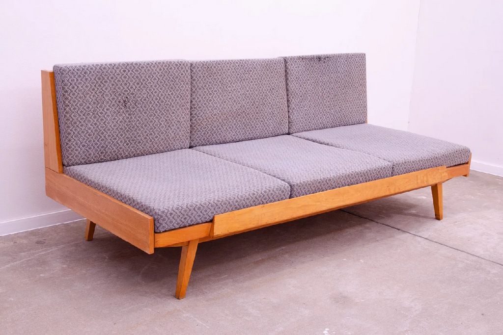 Canapé-lit du milieu du siècle, fabriqué en ex-Tchécoslovaquie dans les années 1970. Le canapé est en bois de hêtre, sa structure est en bon état, le tissu présente des signes importants de vieillissement et d'utilisation et doit être retapissé.