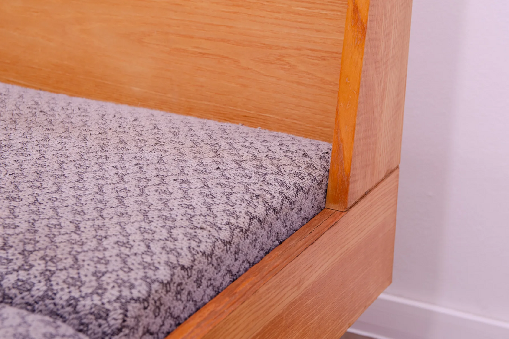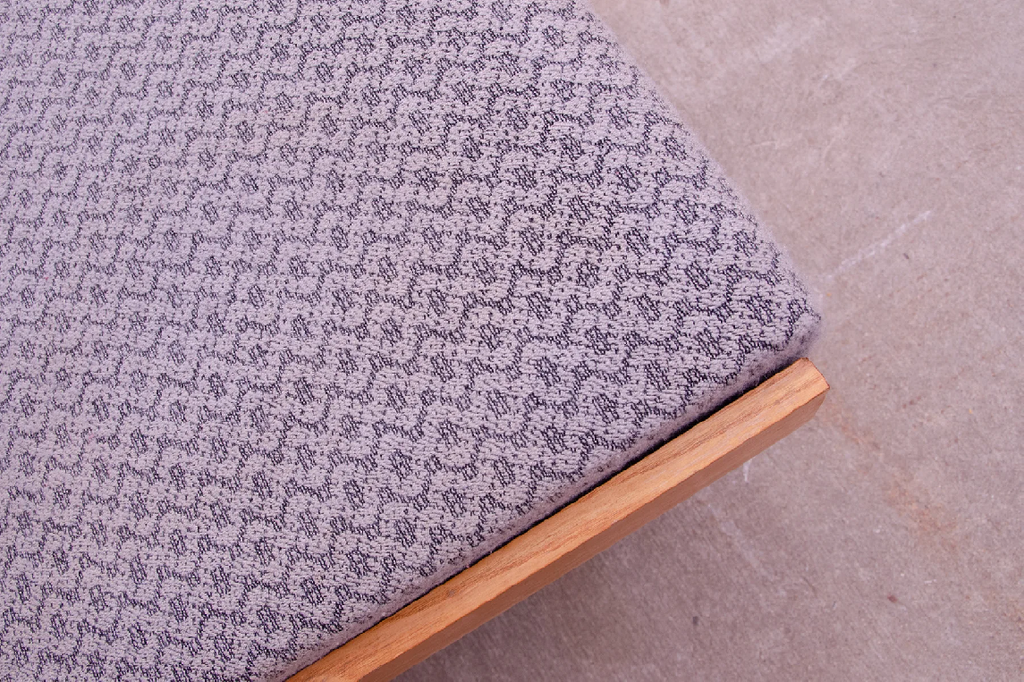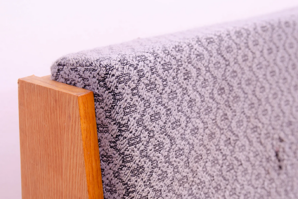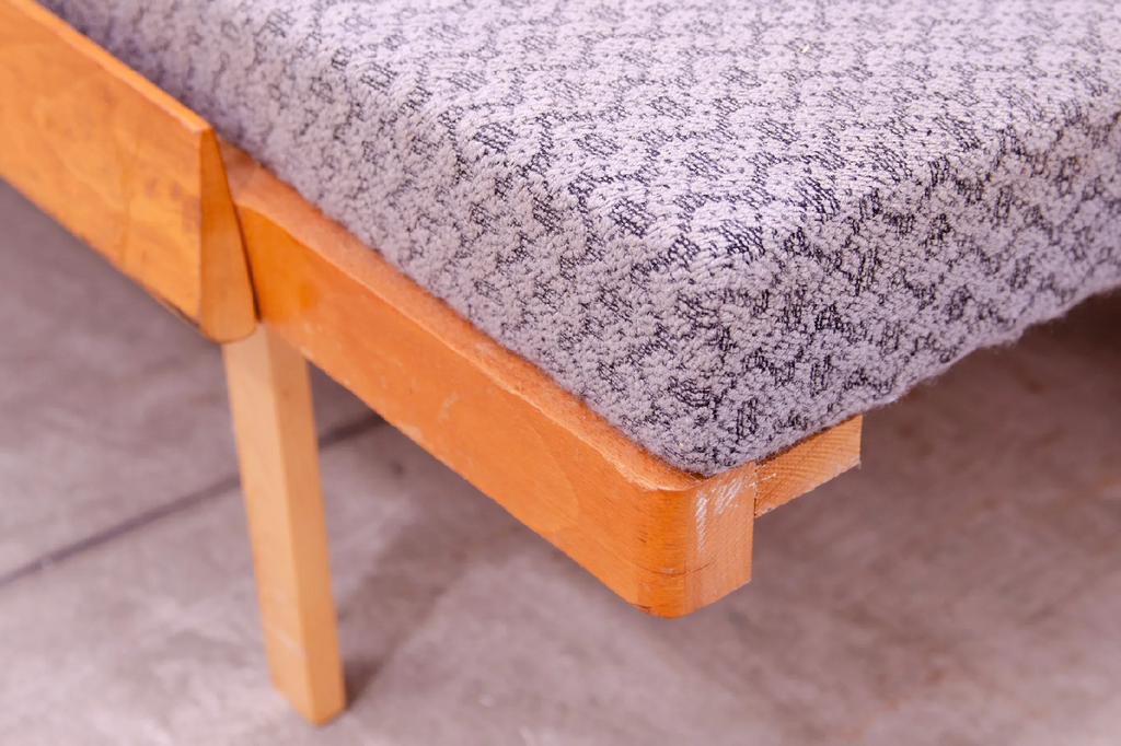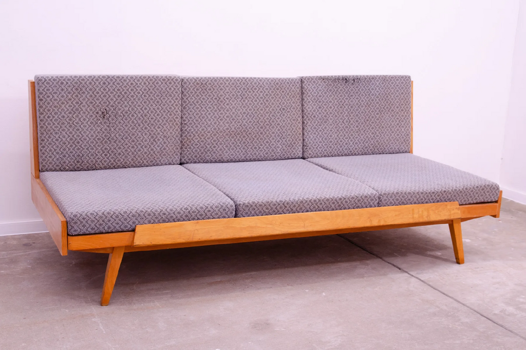 Canapé-lit du milieu du siècle, fabriqué en ex-Tchécoslovaquie dans les années 1970. Le canapé est en bois de hêtre, sa structure est en bon état, le tissu présente des signes importants de vieillissement et d'utilisation et doit être retapissé.