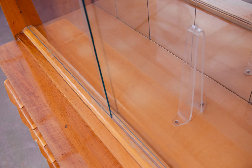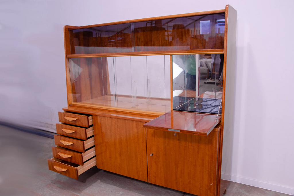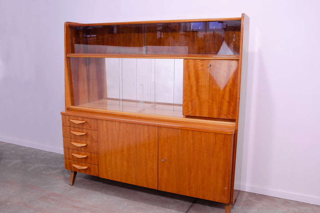 Crédence ou buffet vintage du milieu du siècle, datant des années 1960. Conçue par Frantisek Jirák et fabriquée par l'entreprise Tatra nábytok, en ex-Tchécoslovaquie. De conception simple, sa partie vitrée peut servir de bar, de bibliothèque, etc. En bon état, elle présente des signes d'usure. Placage en noyer.