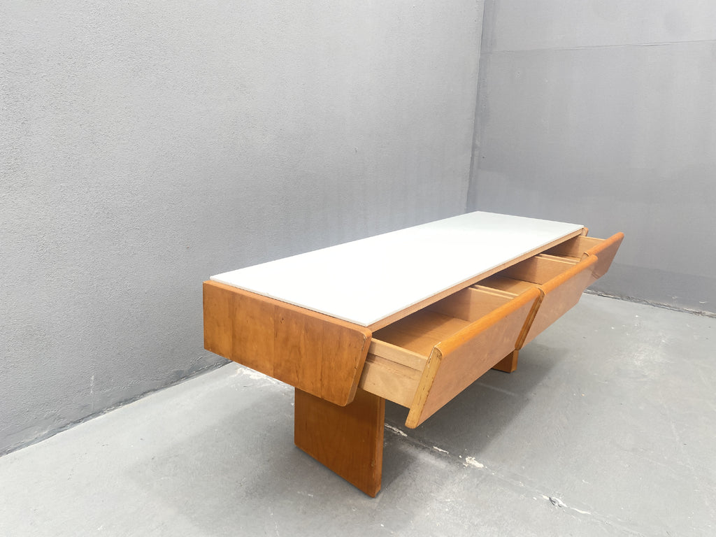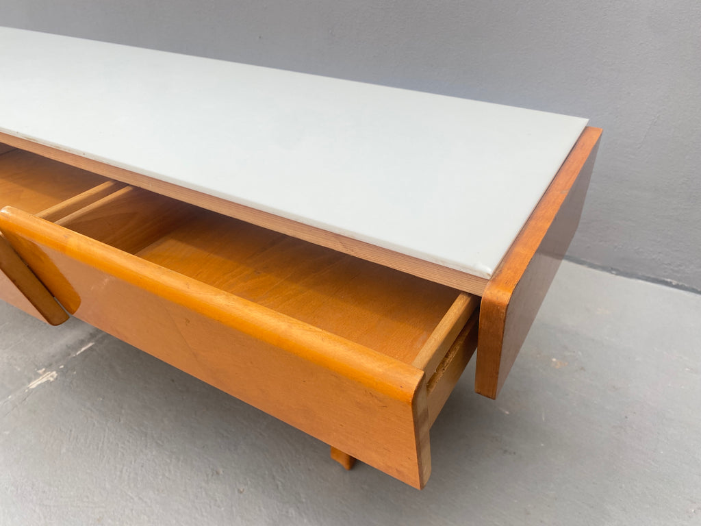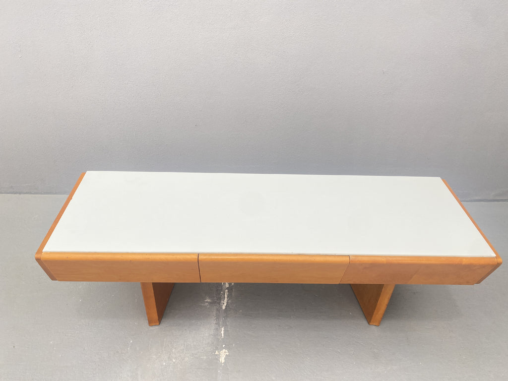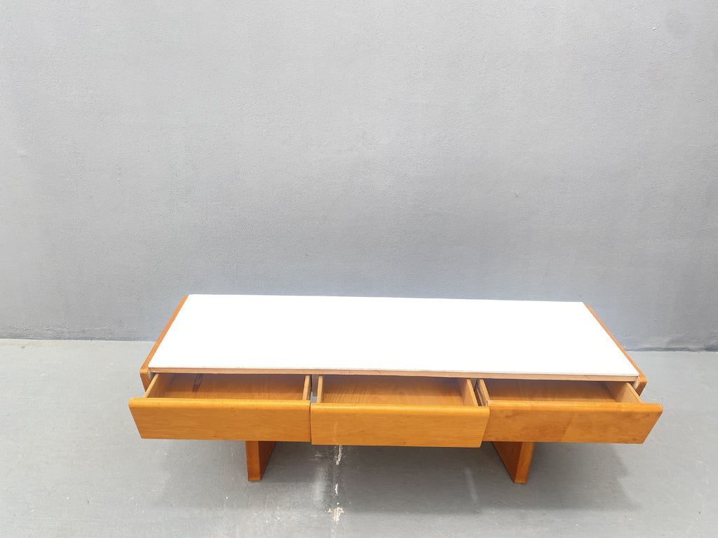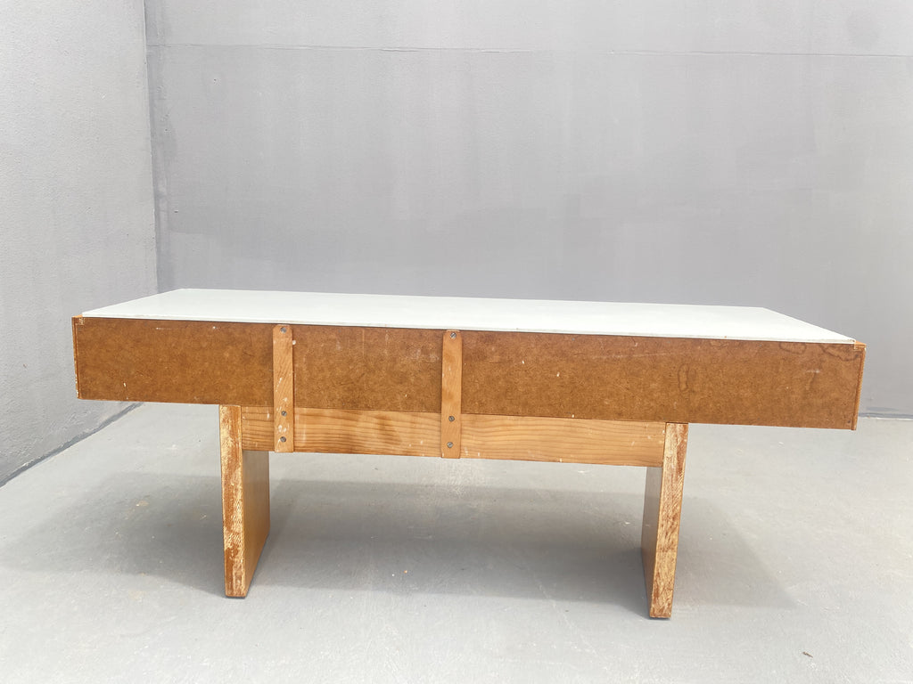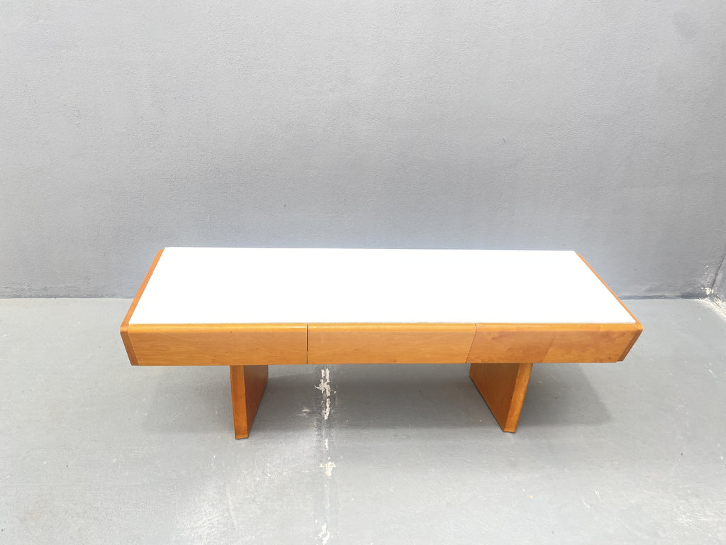 Cette console basse vintage date des années 1960. Elle est en bois et dotée d'un plateau en verre opalin blanc. Elle est dotée de trois tiroirs en façade offrant un espace de rangement. Elle est restée dans son état d'origine et bien conservée. C'est un élément de décoration idéal pour les intérieurs de style rétro ou minimaliste.