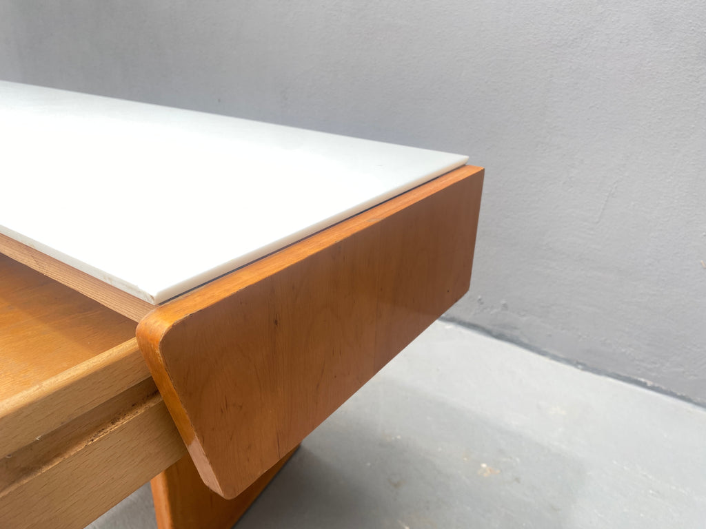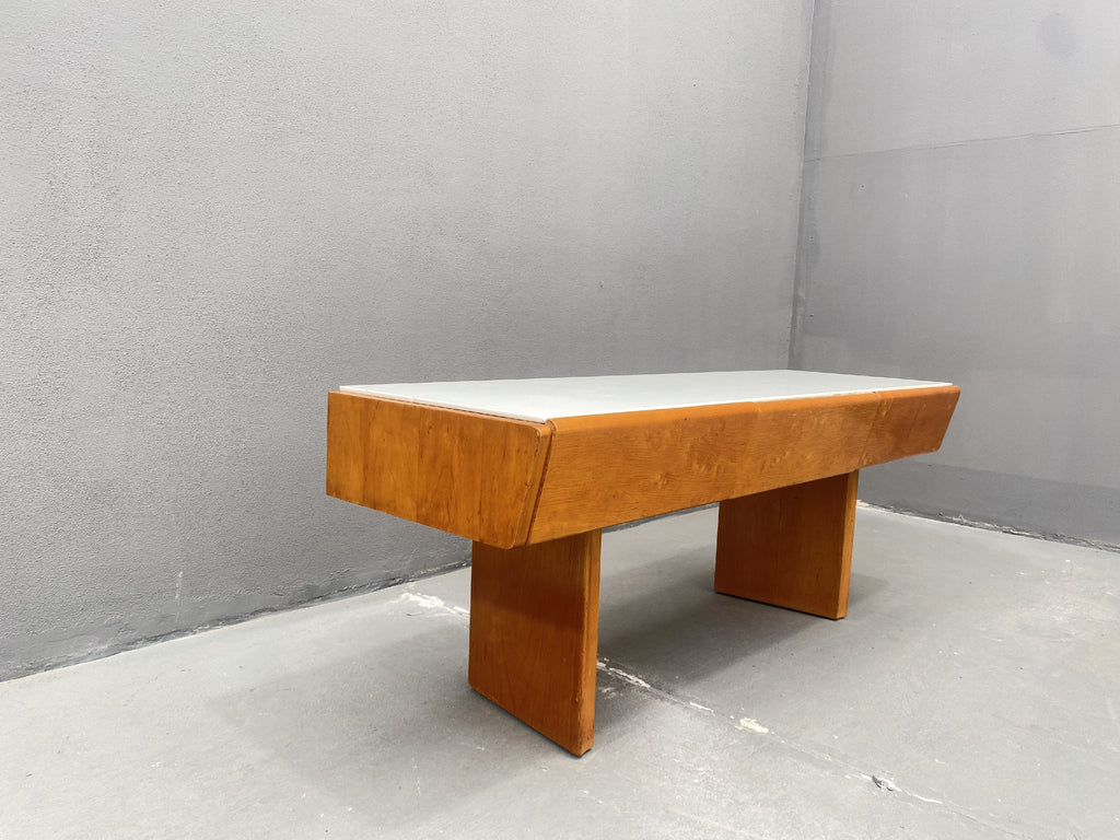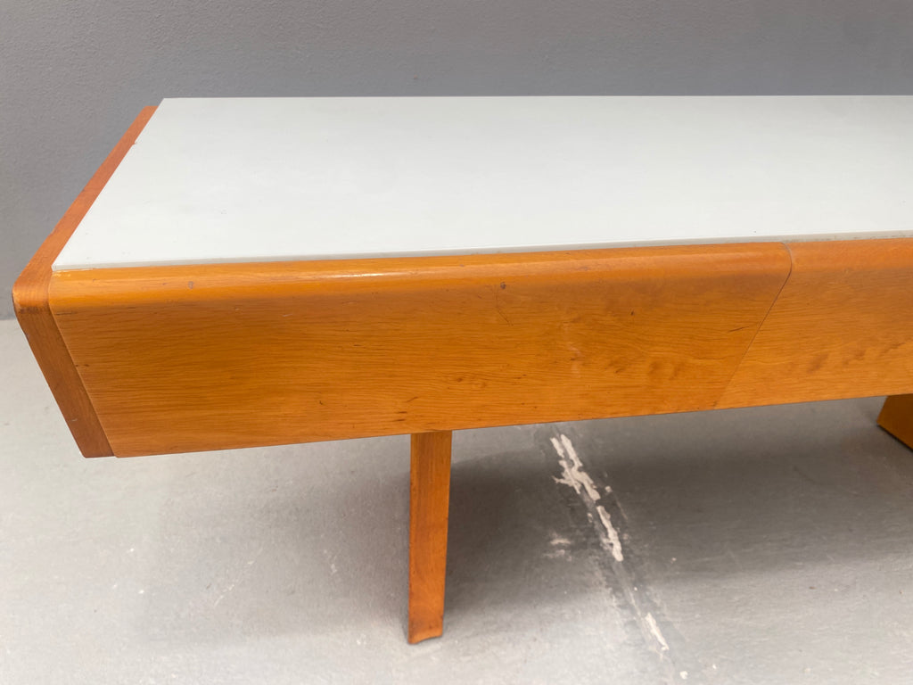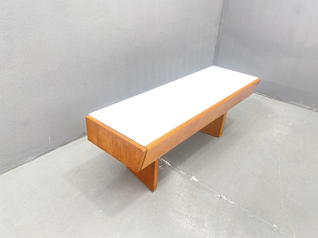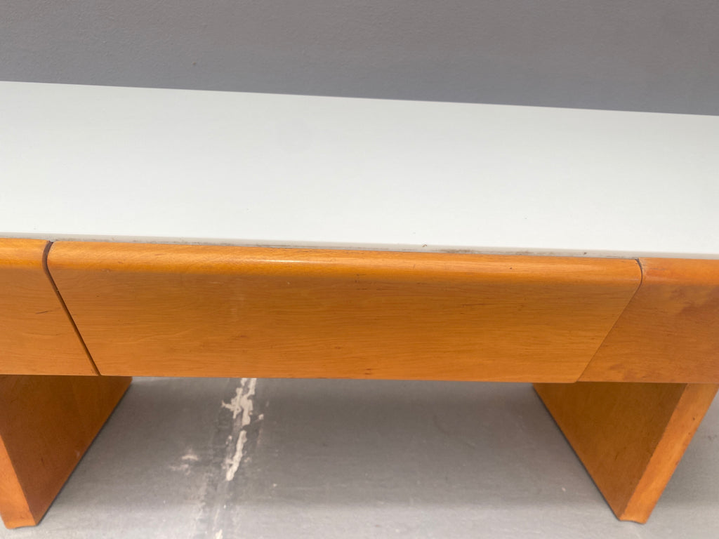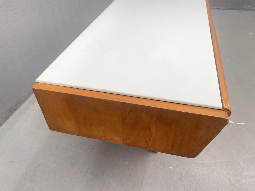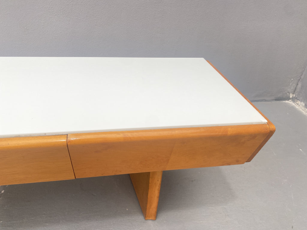 Cette console basse vintage date des années 1960. Elle est en bois et dotée d'un plateau en verre opalin blanc. Elle est dotée de trois tiroirs en façade offrant un espace de rangement. Elle est restée dans son état d'origine et bien conservée. C'est un élément de décoration idéal pour les intérieurs de style rétro ou minimaliste.