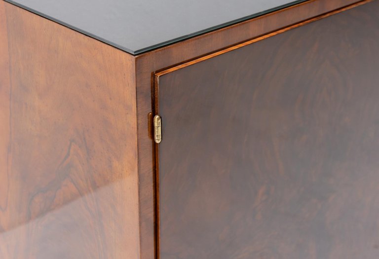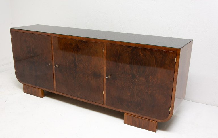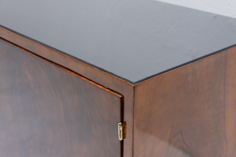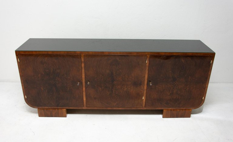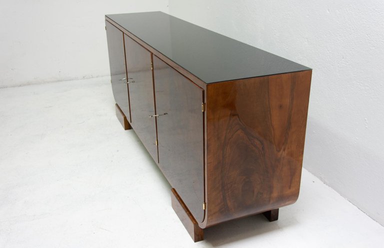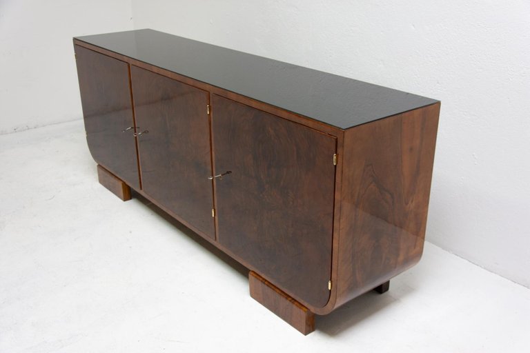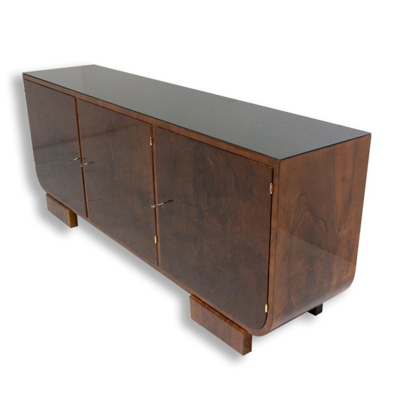 Ce buffet, fabriqué en Bohême dans les années 1930, est un exemple du fonctionnalisme d'Europe centrale. Il est réalisé en bois massif plaqué noyer. Il dispose d'un espace de rangement divisé en trois parties et son plateau est recouvert de verre noir. Il peut également servir de meuble TV, etc. Il est en excellent état, entièrement restauré avec une finition brillante au polyuréthane.