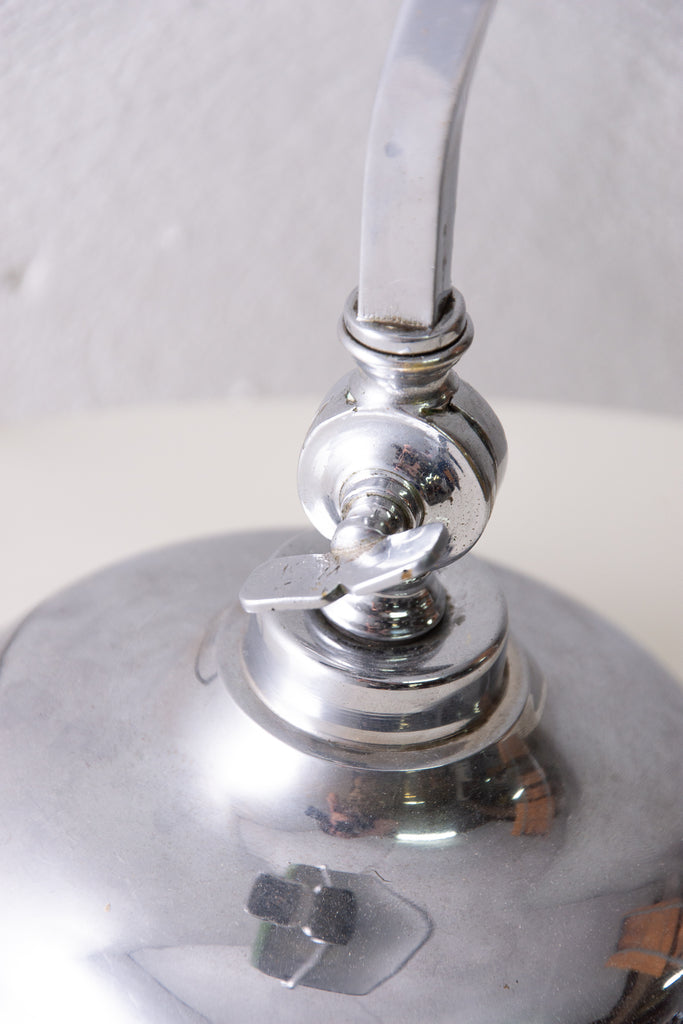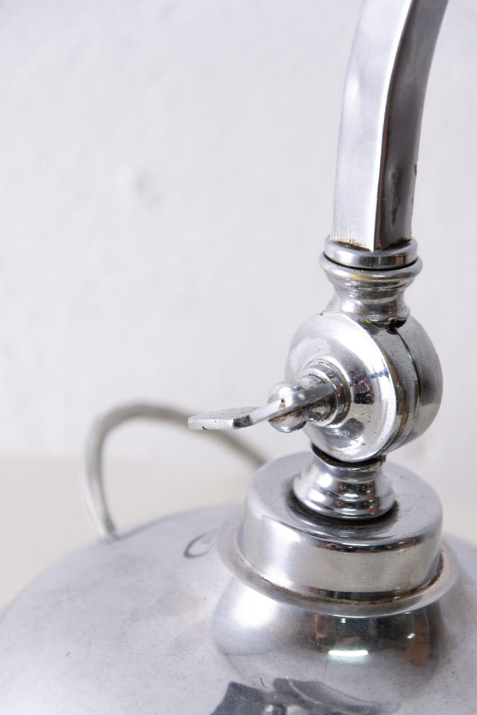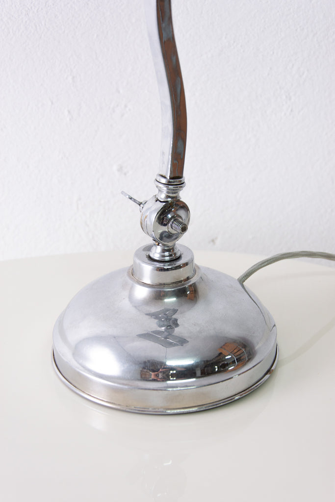 Lampe de bureau caractéristique de style Bauhaus, conçue en 1930. Elle possède une base chromée et un culot en métal émaillé. Le bras et le culot sont réglables. Entièrement réglable, elle offre un look exceptionnel qui s'intègre parfaitement à de nombreux intérieurs. En excellent état. Câblage neuf.