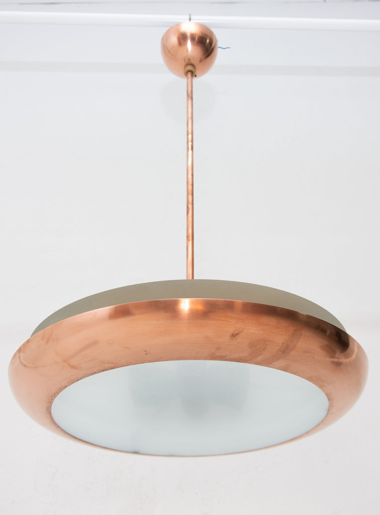 Suspension simple en laiton en forme d'OVNI avec disque central en verre dépoli. Conçue par Vladimír Havel pour Krásná Jizba dans les années 1940.