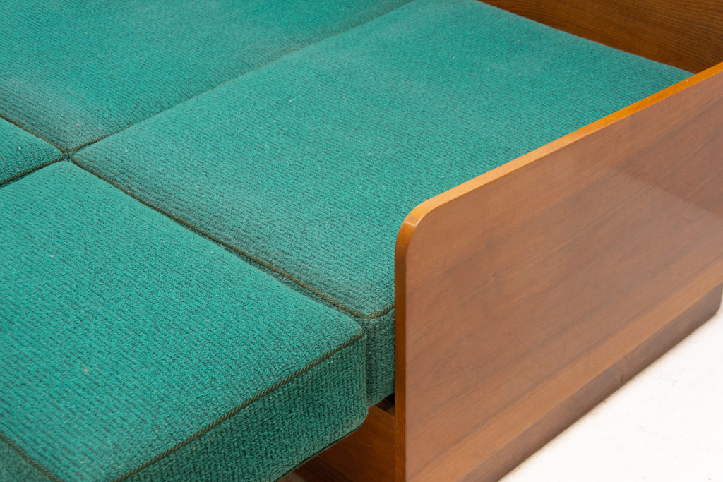 Ce canapé pliant a été conçu par le célèbre architecte tchécoslovaque Jindřich Halabala pour UP Závody dans les années 1950. Son design est à la fois élégant et simple. Sa structure est en bois massif plaqué chêne. Il est globalement en très bon état, avec de légères traces d'usure. Le revêtement est en très bon état d'origine, sans aucun dommage.