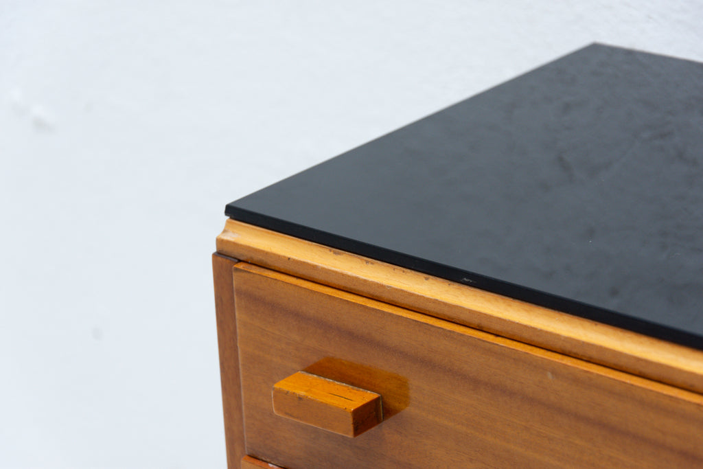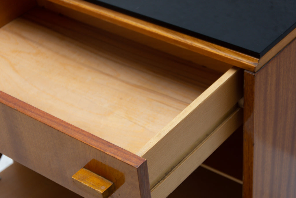 Elles peuvent également servir de petite commode. Elles sont dotées d'une vitre noire en haut, d'un tiroir et d'un espace de rangement en bas. Placage en noyer. Design simple et original. Cet article est en très bon état vintage, présentant des signes d'usure.